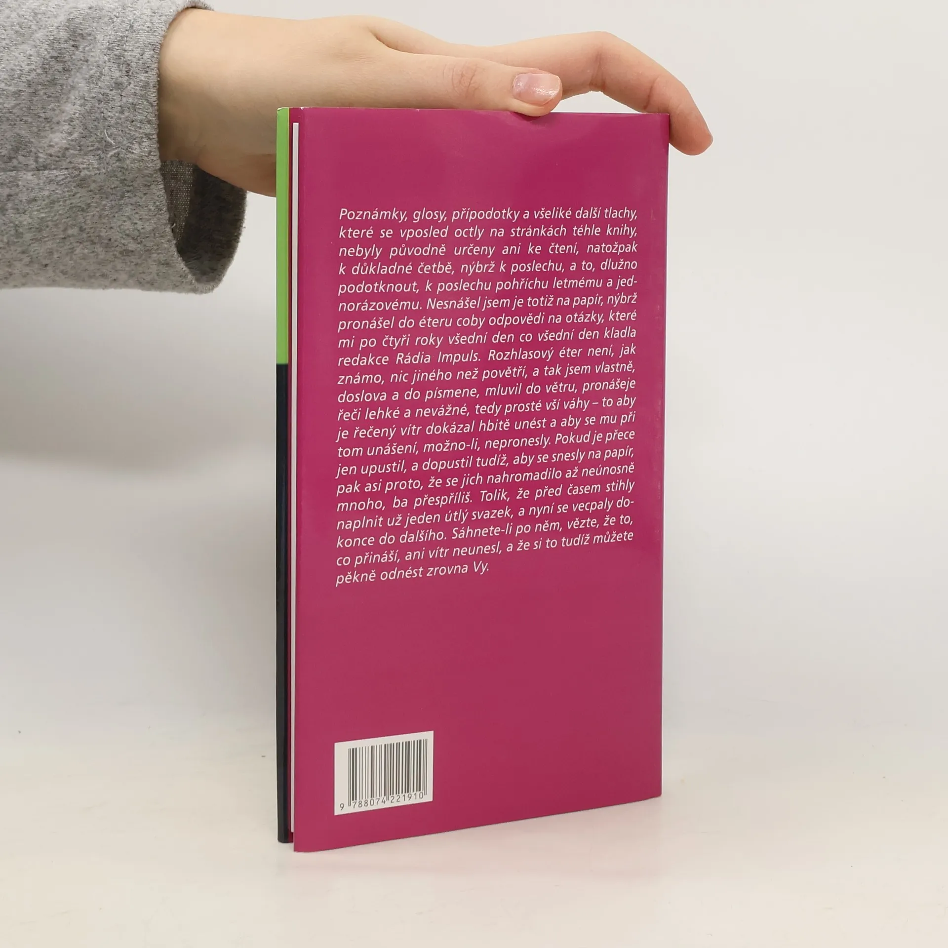 Poznámky, glosy, přípodotky a všeliké další tlachy, které se vposled octly na stránkách téhle knihy, nebyly původně určeny ani ke čtení, natožpak k důkladné četbě, nýbrž k poslechu, a to, dlužno podotknout, k poslechu pohříchu letmému a jednorázovému. Nesnášel jsem je totiž na papír, nýbrž pronášel do éteru coby odpovědi na otázky, které mi po čtyři roky všední den co všední den kladla redakce Rádia Impuls. Rozhlasový éter není, jak známo, nic jiného než povětří, a tak jsem vlastně, doslova a do písmene, mluvil do větru, pronášeje řeči lehké a nevážné, tedy prosté vší váhy - to aby je řečený vítr dokázal hbitě unést a aby se mu při tom unášení, možno-li, nepronesly. Pokud je přece jen upustil, a dopustil tudíž, aby se snesly na papír, pak asi pro to, že se jich nahromadilo až neúnosně mnoho, ba přespříliš. Tolik, že před časem stihly naplnit už jeden útlý svazek, a nyní se vecpaly dokonce do dalšího. Sáhnete-li po něm, vězte, že to, co přináší, ani vítr neunesl, a že si to tudíž můžete pěkně odnést zrovna Vy.