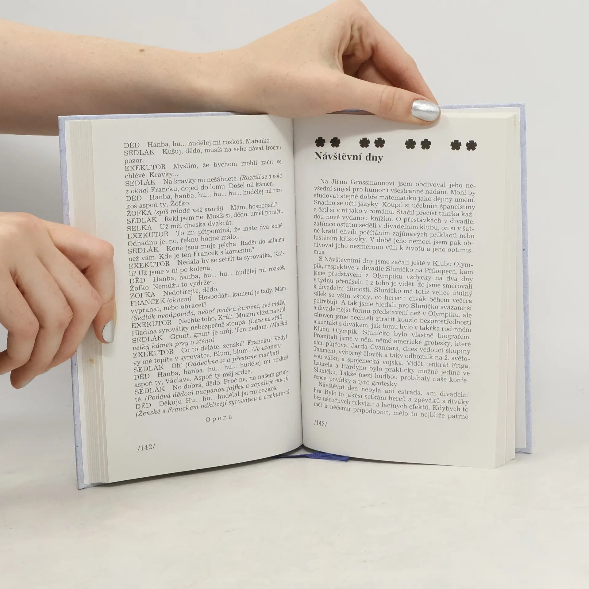 Výběr nejlepších dialogů a scének ze společné divadelní tvorby doprovází Miloslav Šimek svými vzpomínkami na přítele Jiřího Grossmanna, s nímž vytvořil ojedinělé humoristické dílo, ve kterém nikdy nechyběla politická satira a originální grotesky a parodie ze života rodiny, školy a společnosti. Kniha obsahuje řadu zajímavých informací z autorova archívu, obrazovou přílohu a také zrekonstruované divadelní hry i další humoristické tety, z nichž většina je zde otištěna poprvé. Jako všechny svazky Knihovny Divadla Jiřího Grossmanna doprovází i tuto knihu ilustrace Michala Hrdého.