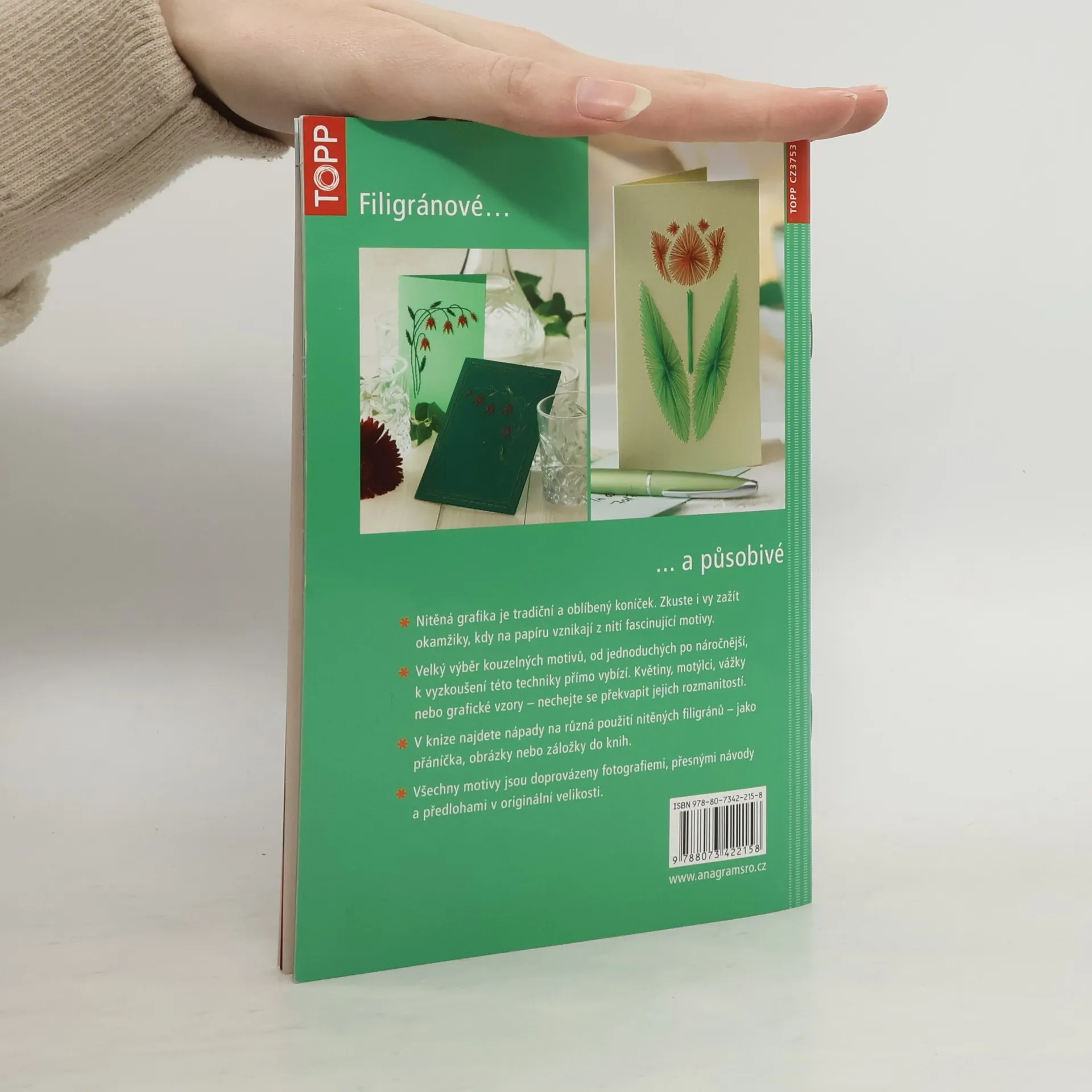 Nitěná grafika je tradiční a oblíbený koníček. V sedmdesátých letech minulého století se jí také říkalo vyšívání na papír a byla to velice oblíbená technika. Zkuste i vy zažít okamžiky, kdy na papíru vznikají z nití fascinující motivy. Velký výběr kouzelných motivů, od jednoduchých po náročnější, k vyzkoušení této techniky přímo vybízí. Květiny, motýlci, vážky nebo grafické vzory - nechejte se překvapit jejich rozmanitostí. V knize najdete nápady na různá použití nitěných filigránů - jako přáníčka, obrázky nebo záložky do knih. Všechny motivy jsou doprovázeny fotografiemi, přesnými návody a předlohami v originální velikosti.