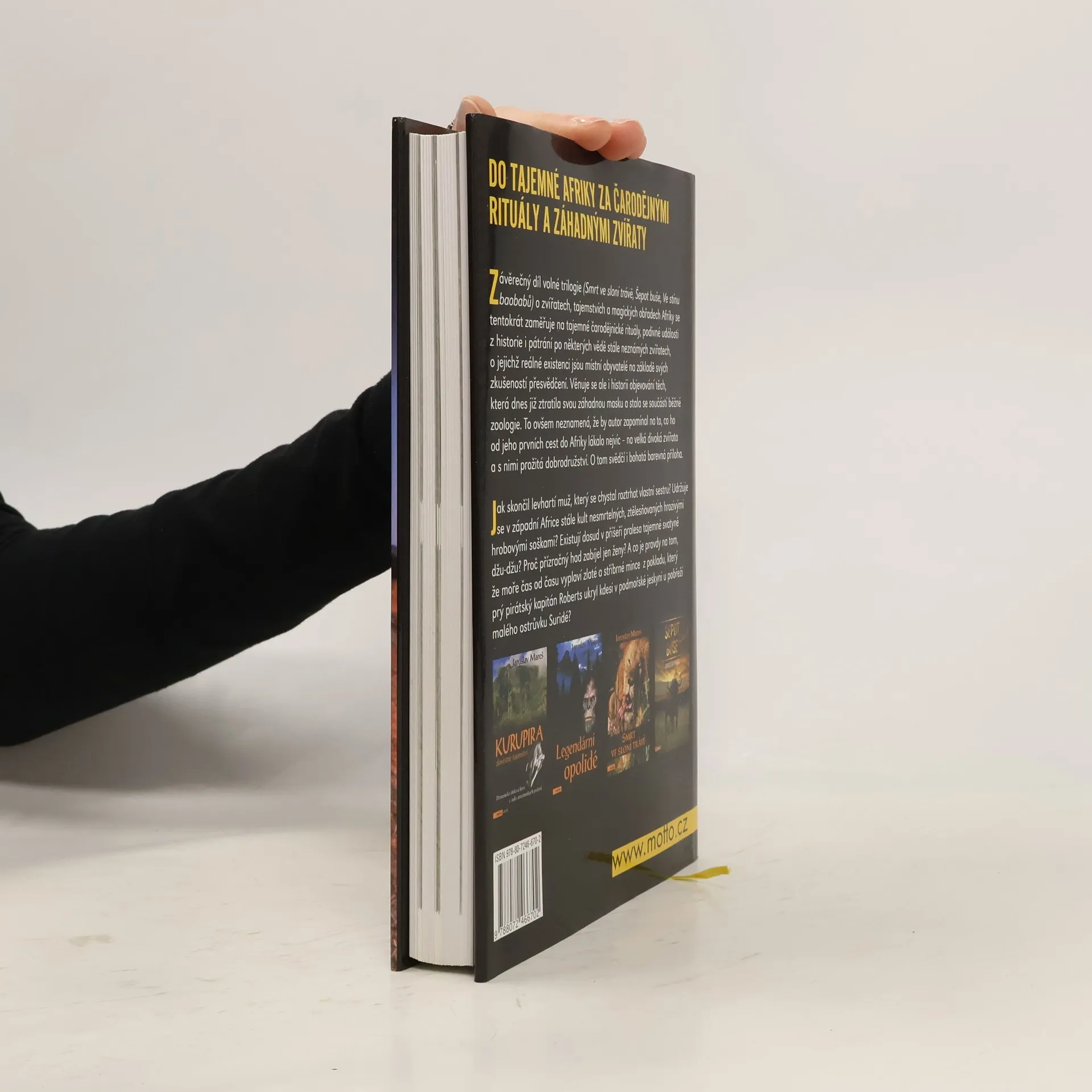 Závěrečný díl volné trilogie (Smrt ve sloní trávě, Šepot buše, Ve stínu baobabů) o zvířatech, tajemstvích a magických obřadech Afriky se tentokrát zaměřuje na tajemné čarodějnické rituály, podivné události z historie i pátrání po některých vědě stále neznámých zvířatech, o jejichž reálné existenci jsou místní obyvatelé na základě svých zkušeností přesvědčení. Věnuje se ale i historii objevování těch, která dnes již ztratila svou záhadnou masku a stala se součástí běžné zoologie. To ovšem neznamená, že by autor zapomínal na to, co ho od jeho prvních cest do Afriky lákalo nejvíc - na velká divoká zvířata a s nimi prožitá dobrodružství. O tom svědčí i bohatá barevná příloha. Jak skončil levhartí muž, který se chystal roztrhat vlastní sestru? Udržuje se v západní Africe stále kult nesmrtelných, ztělesňovaných hrozivými hrobovými soškami? Existují dosud v příšeří pralesa tajemné svatyně džu-džu? Proč příznačný had zabíjel jen ženy? A co je pravdy na tom, že moře čas od času vyplaví zlaté a stříbrné mince z pokladu, který prý pirátský kapitán Roberts ukryl kdesi v podmořské jeskyni u pobřeží malého ostrůvku Suridé?