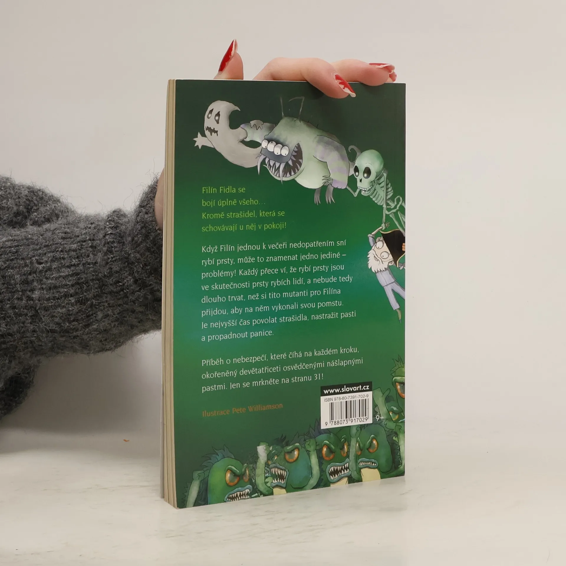 Filín Fidla se bojí úplně všeho…, kromě strašidel, která se schovávají u něj v pokoji! Když Filín jednou k večeři nedopatřením sní rybí prsty, může to znamenat jedno jediné - problémy! Každý přece ví, že rybí prsty jsou ve skutečnosti prsty rybích lidí, a nebude tedy dlouho trvat, než si tito mutanti pro Filína přijdou, aby na něm vykonali svou pomstu. Je nejvyšší čas povolat strašidla, nastražit pasti a propadnout panice. Příběh o nebezpečí, které číhá na každém kroku, okořeněný děvetatřiceti osvědčenými nášlapnými pastmi.