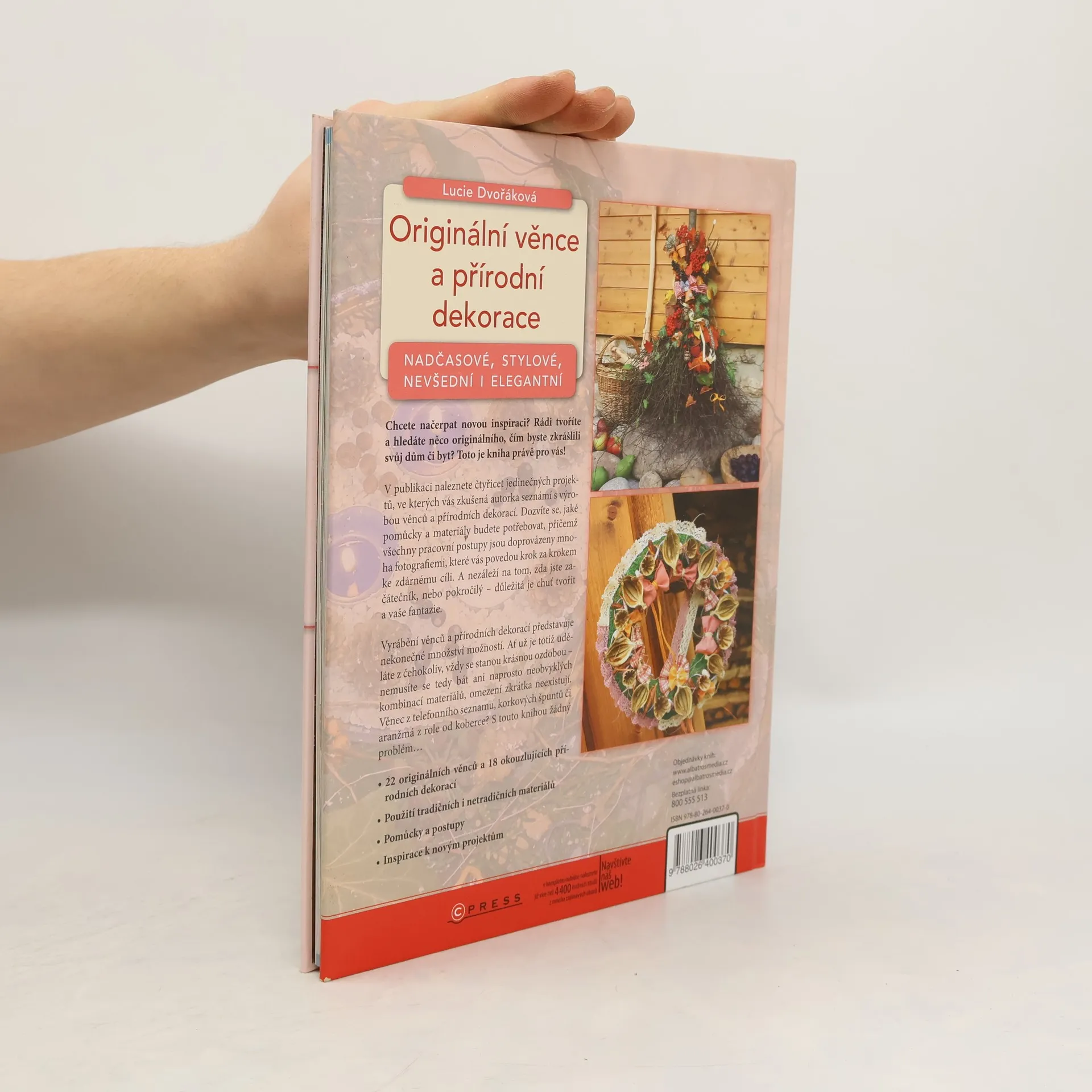 Chcete načerpat novou inspiraci? Rádi tvoříte a hledáte něco originálního, čím byste zkrášlili váš dům či byt? Objevte svět přírodních materiálů!V této knize naleznete 40 projektů, ve kterých vás zkušená autorka seznámí s výrobou věnců a přírodních dekorací. Dozvíte se, jaké pomůcky a materiály budete potřebovat, přičemž všechny pracovní postupy jsou doprovázeny mnoha fotografiemi, které vás povedou krok za krokem ke zdárnému cíli.