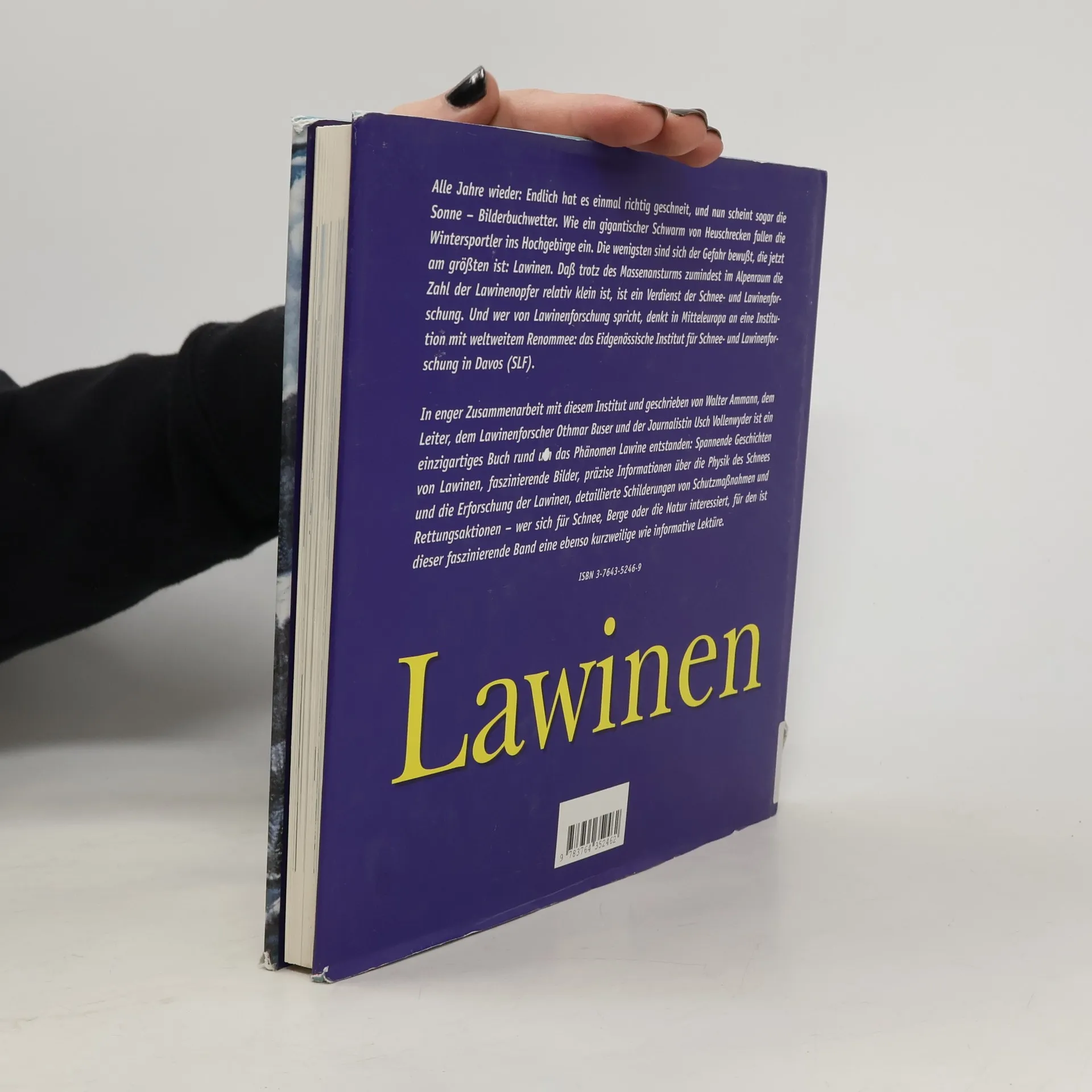 Die international renommierten Experten Walter Ammann und Othmar Buser und die Journalistin Usch Vollenwyder befassen sich mit allen Aspekten der Naturerscheinung Lawinen. Sie beschäftigen sich mit der Physik des Schnees und der Beschaffenheit von Schneekristallen wie mit den verschiedenen Lawinenarten und den Ursachen für Lawinenabgänge. Über die berühmtesten Lawinenkatastrophen der Geschichte wird genauso fesselnd erzählt wie über die tägliche Arbeit im Davoser Institut - zum Beispiel für die Erstellung des Lawinenbulletins, das über TV, Radio und Telefon verbreitet wird. Abgerundet wird die Darstellung durch Kapitel über die Selbstgefährdung des Menschen durch Eingriffe in die Natur sowie über Lawinenprävention und Rettungsmassnahmen