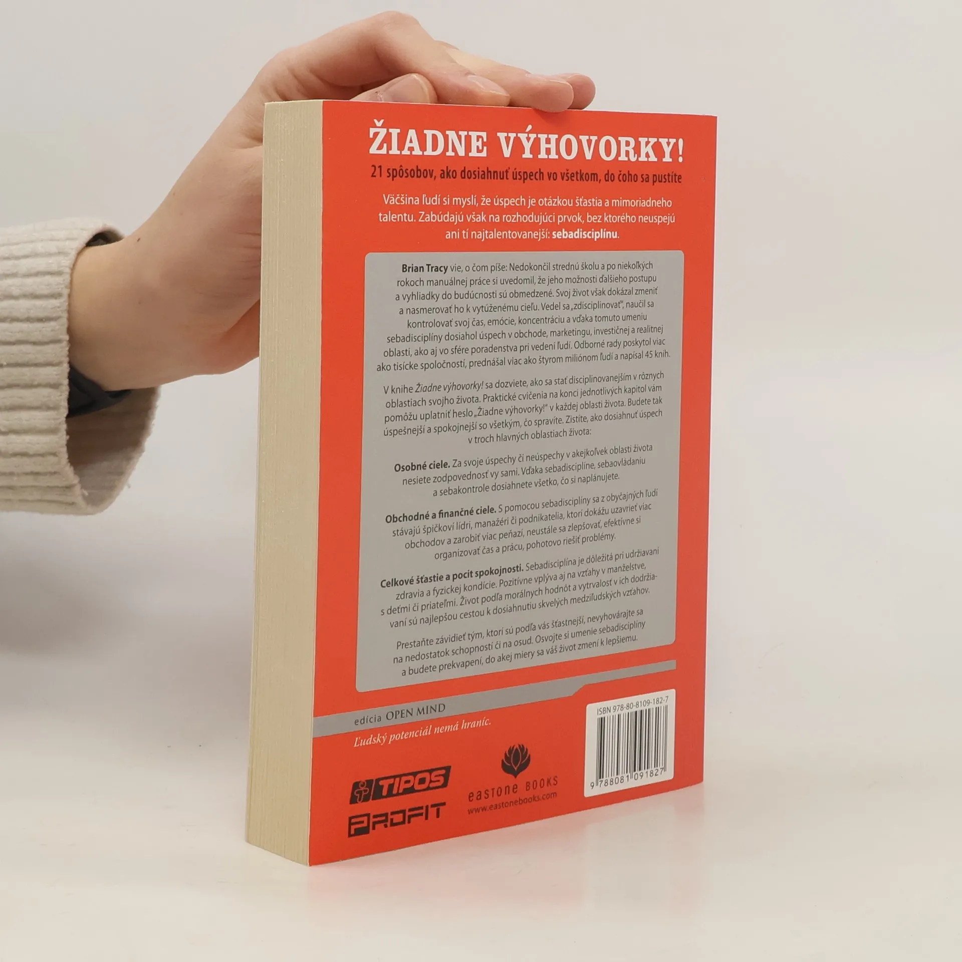 21 spôsobov, ako dosiahnuť v živote všetko, po čom túžite, a to vďaka sebadisciplíne. Väčšina ľudí si myslí, že úspech je otázkou šťastia a mimoriadneho talentu. Zabúdajú však na rozhodujúci prvok, bez ktorého neuspejú ani tí najtalentovanejší: sebadisciplínu. Brian Tracy, autor bestsellerov Najprv zjedzte žabu, Vytvorte si svoju vlastnú budúcnosť a titulu Ako vedú úspešní lídri vie, o čom v tejto knihe píše: Nedokončil strednú školu a po niekoľkých rokoch manuálnej práce si uvedomil, že jeho možnosti ďalšieho postupu a vyhliadky do budúcnosti sú obmedzené. Svoj život však dokázal zmeniť a nasmerovať ho k vytúženému cieľu. Vedel sa „zdisciplinovať“, naučil sa kontrolovať svoj čas, emócie, koncentráciu a vďaka tomuto umeniu sebadisciplíny dosiahol úspech v obchode, marketingu, investičnej a realitnej oblasti, ako aj vo sfére poradenstva pri vedení ľudí. Odborné rady poskytol viac ako tisícke spoločností, prednášal viac ako štyrom miliónom ľudí a napísal 45 kníh.