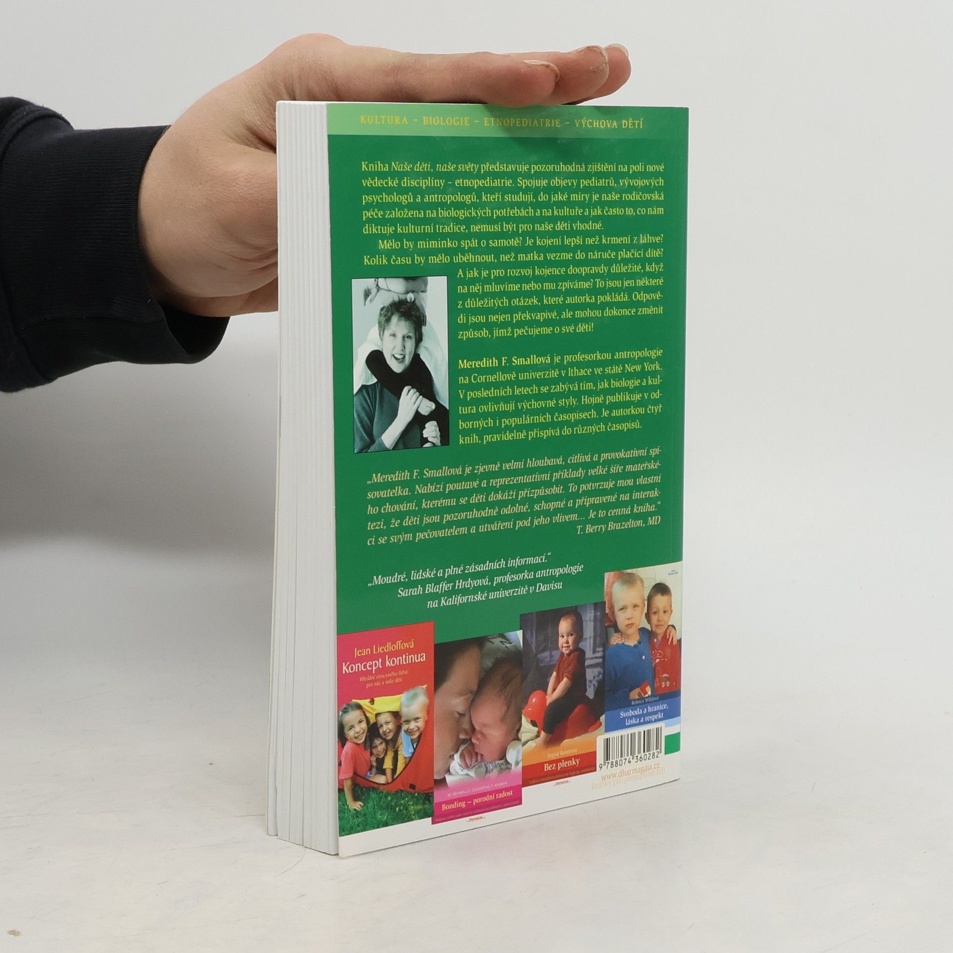 Čerství rodiče stojí před nekonečnou řadou rozhodnutí týkajících se způsobu, jak nejlépe pečovat o své dítě, a přirozeně hledají radu a pomoc u přátel a příbuzných, kteří už děti vychovali. Vědci ale zjišťují, že většinu po generace předávaných postupů je třeba znovu pečlivě prověřit. Kniha Naše děti, naše světy je kombinací praktických informací o rodičovské péči a vědecké analýzy provokující k zamyšlení. Je první studií ukazující, proč vychováváme své děti tak, jak je vychováváme – a navrhuje, abychom se zamysleli nad tradičními názory na rodičovství převládajícími v naší kultuře. V této převratné knize antropoložka Meredith F. Smallová představuje svá pozoruhodná zjištění na poli nové vědecké disciplíny - etnopediatrie. Profesorka Smallová ve své práci spojuje objevy pediatrů, výzkumníků v oboru vývoje dítěte a antropologů, kteří studují, do jaké míry je naše rodičovská péče založena na biologických potřebách a do jaké míry na kultuře – a jak často to, co diktuje kulturní tradice, nemusí být to nejlepší pro naše děti. Mělo by miminko spát o samotě? Je kojení lepší než krmení z láhve, nebo je to mýtus 90. let? Kolik času by mělo uběhnout, než matka vezme do náruče plačící dítě? A jak je pro rozvoj kojence doopravdy důležité, když na něj mluvíme nebo mu zpíváme? To jsou jen některé z důležitých otázek, které Smallová pokládá. Odpovědi jsou nejen překvapivé, ale mohou dokonce změnit způsob, jímž pečujeme o své děti!