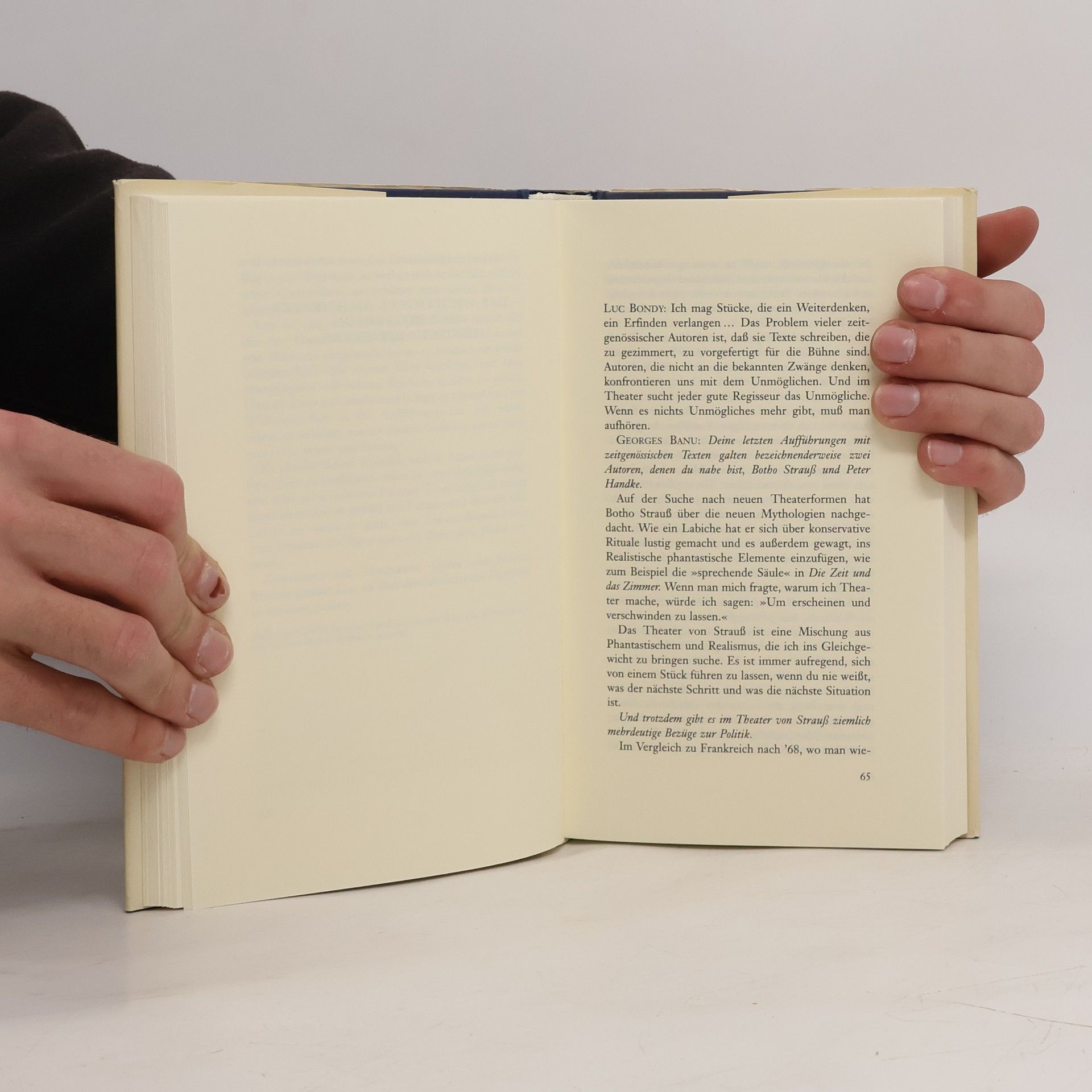 In diesem Band spricht Luc Bondy über seine Theaterarbeit und überrascht den Leser mit kunstvollen autobiographischen Erzählungen. Als in Frankreich aufgewachsener Schweizer gilt er unter den europäischen Regisseuren als Meister der Schwerelosigkeit und Grazie. Er bezeichnet das Theater als ein „Fest des Augenblicks“ und erforscht das innere „désir“ der Menschen, sei es bei Marivaux, Mozart, Botho Strauß oder Schnitzler. Eine pädagogische oder programmatische Ausrichtung ist ihm fremd, was sich in den sechs Dialogen mit dem französischen Theaterdenker Georges Banu zeigt. Diese Dialoge sind keine systematische Theorie, sondern „Minidramen“, in denen Bondy sich ständig widerspricht – ein Spiegelbild seiner Auffassung von Theater als Widerspruch und Infragestellung. Er diskutiert seine Methode, die er als Teil seiner Identität sieht, sowie die Inszenierung als eine Form des Schreibens. Bondy äußert seine Liebe zu den Schauspielern und thematisiert die kulturellen Grenzen zwischen Frankreich und Deutschland, das Kino und die Oper. Er kritisiert das Theater des Exzesses und bekennt sich zu einem „Theater ohne Theater“. Ergänzt werden seine Erzählungen durch einen Essay von Ivan Nagel, ein Gespräch mit seinem Mentor Dieter Sturm sowie zahlreiche Zeugnisse von Persönlichkeiten wie Gérard Mortier, Michel Piccoli und Peter Stein.