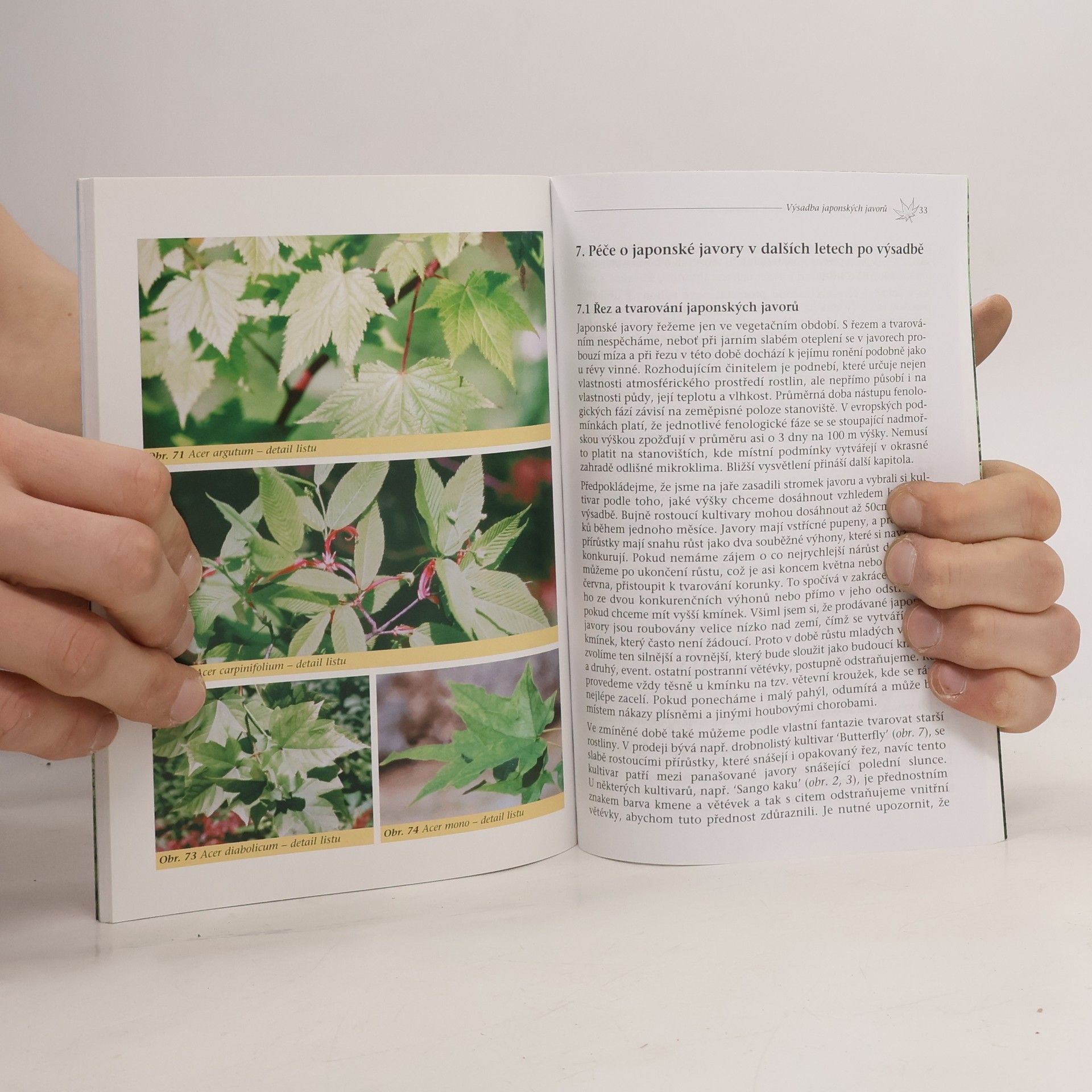 Jediná knížka na našem knižním trhu, která se uceleně zabývá pěstováním těchto atraktivních listnatých dřevin. Popisuje několik desítek nejzajímavějších kultivarů, které lze pěstovat v našich klimatických podmínkách. Uvedeny jsou jejich nároky, výběr nejvhodnějšího stanoviště, ochrana před chorobami a škůdci atd. Kniha poslouží hlavně laickému zájemci, ale i odborník jistě ocení ucelený přehled o japonských javorech, o nichž se dosud mohl dočíst pouze v článcích specializovaných časopisů.