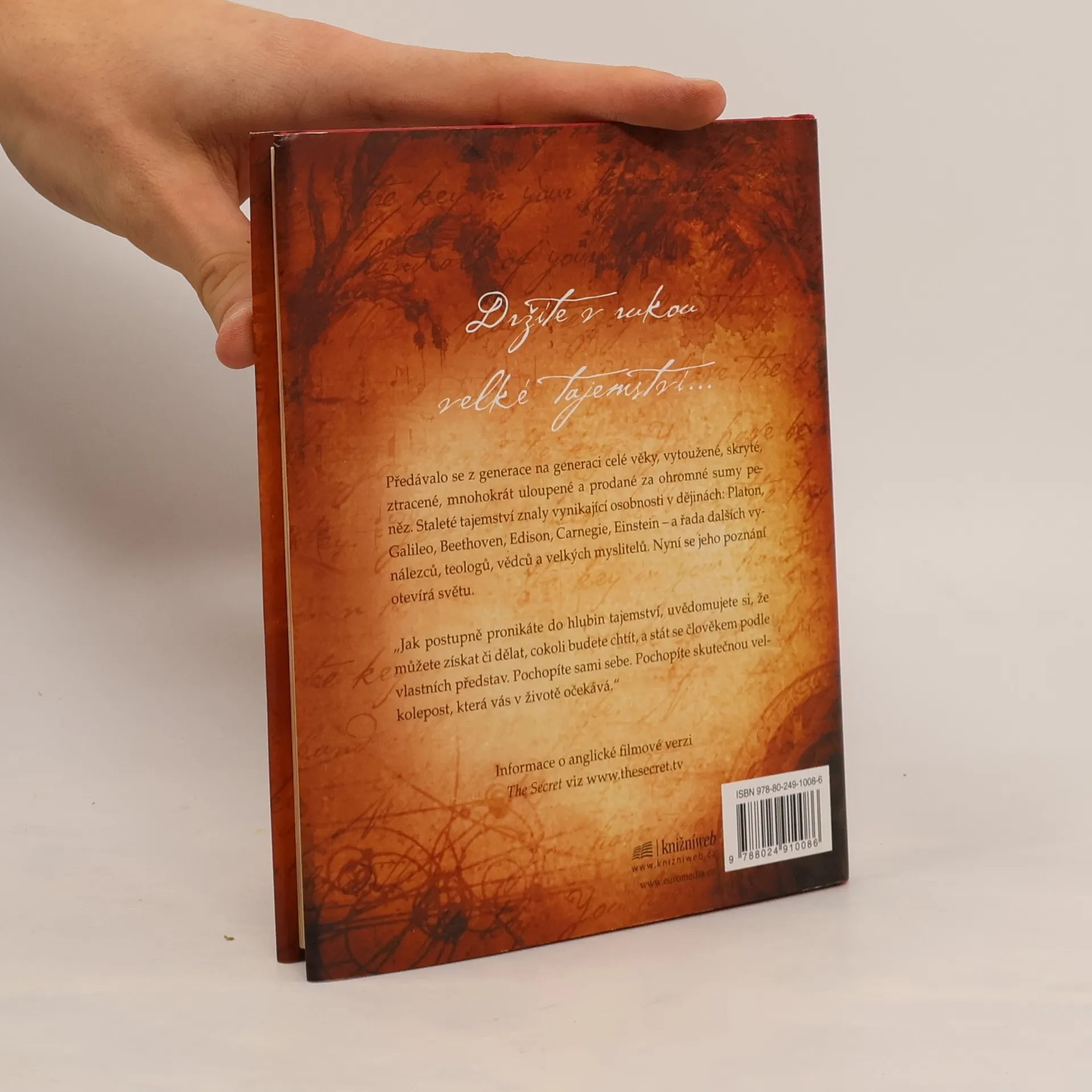 Stojíte na prahu poznání. Fragmenty velkého tajemství se objevují v legendách, mýtech a filozofiích po celá staletí, jen znát tu správnou šifru. Kniha, kterou právě držíte v rukou, shromáždila moudrost předchozích generací a naučí vás dosáhnout všeho, co si přejete - v oblasti peněz, zdraví, vztahů i osobního štěstí. Pochopíte skryté síly, které ve vás dřímají, a odhalíte jejich moc. Učení novodobých mistrů, kteří štěstí, zdraví a bohatství dosáhli, vám ukáže, jak lze tajemství spokojeného života aplikovat na každém kroku.