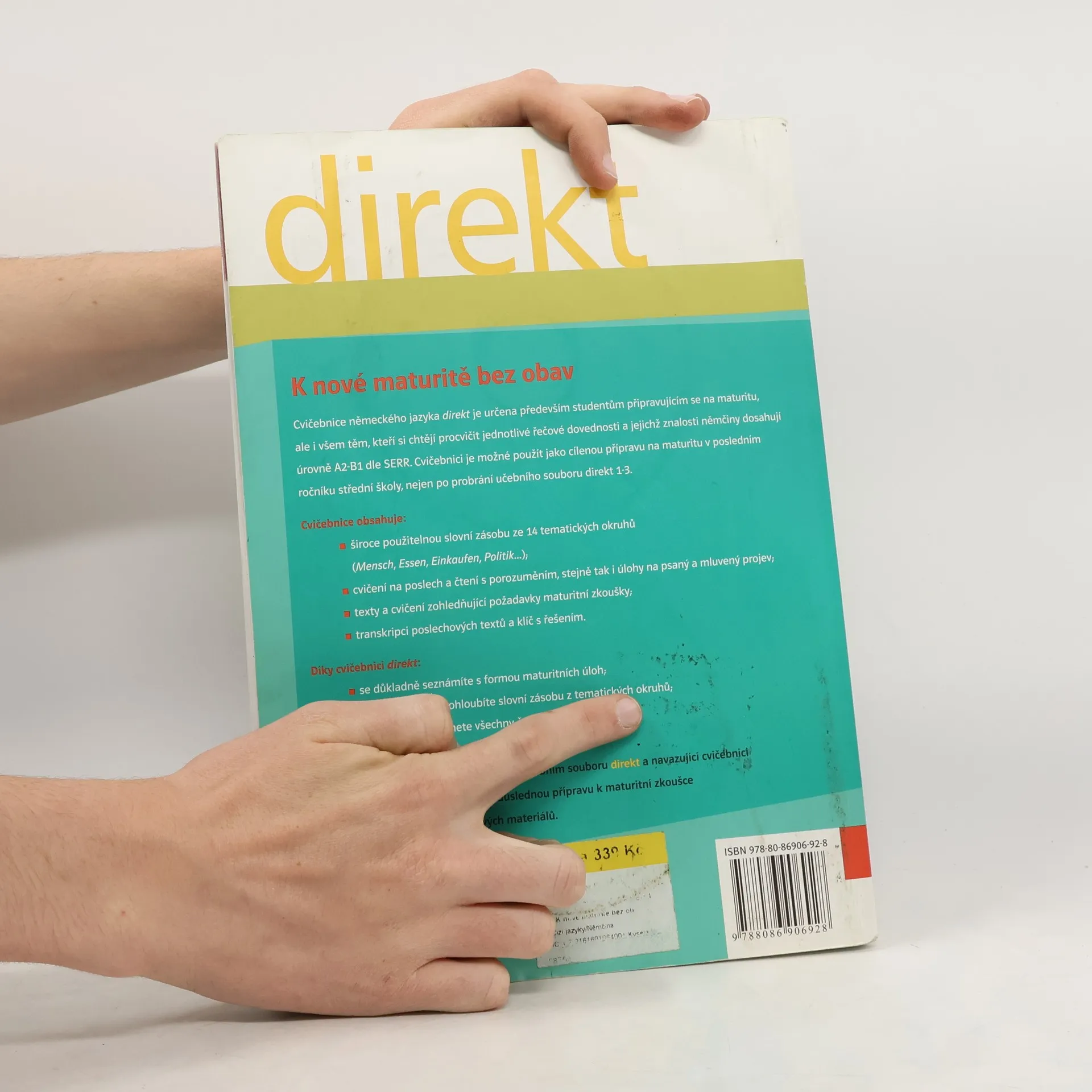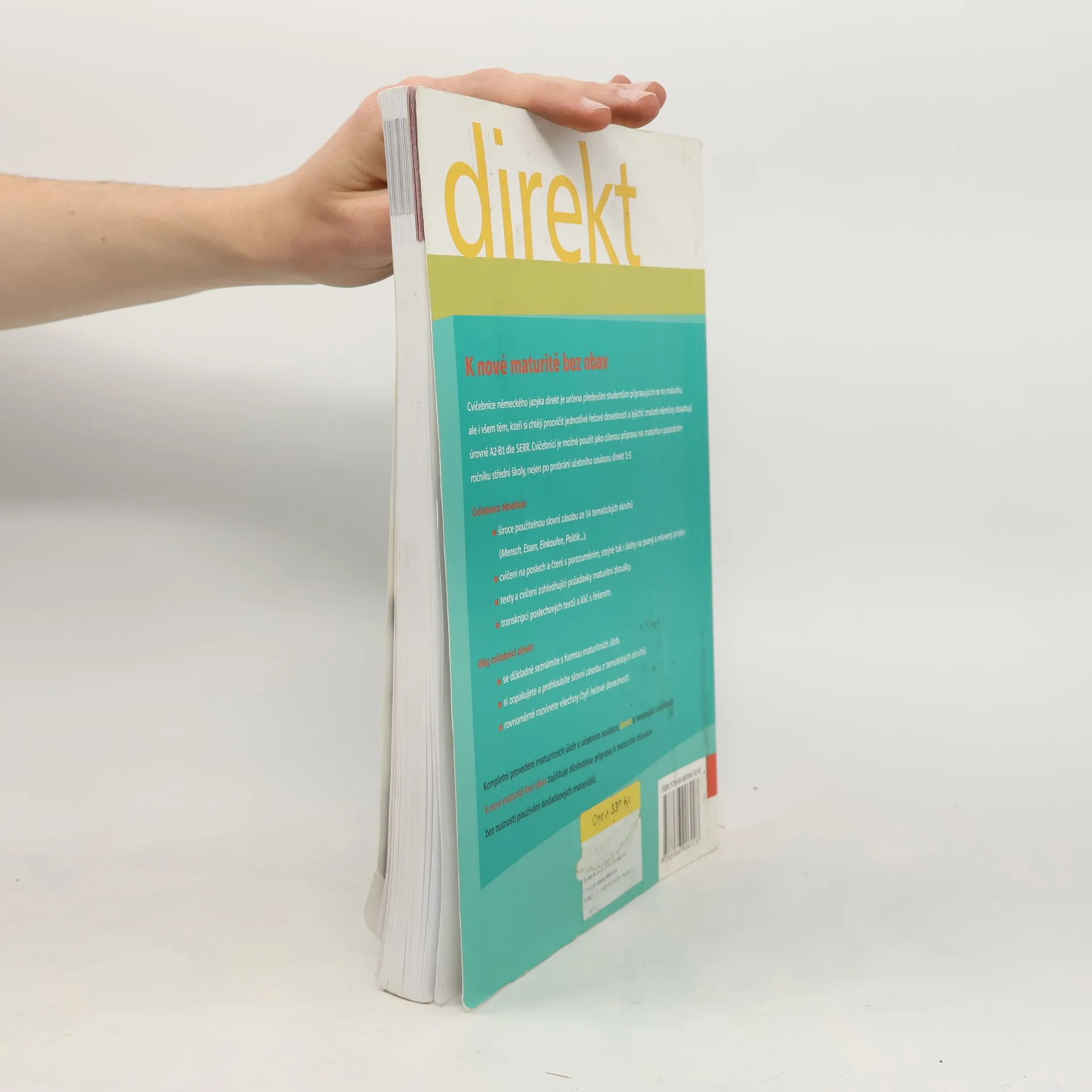 Cvičebnice německého jazyka direkt je určena především studentům připravujícím se na maturitu, ale i všem těm, kteří si chtějí procvičit jednotlivé jazykové dovednosti a jejichž znalosti němčiny dosahují úrovně A1-B2 dle SERR. Cvičebnici je možné použít jako cílenou přípravu na maturitu v posledním ročníku střední školy, nejen po probrání učebního souboru direkt 1-3. Cvičebnice obsahuje: široce použitelnou slovní zásobu ze 14 tematických okruhů (Mensch, Essen, Einkaufen, Politik,...) cvičení na poslech a čtení s porozuměním, stejně tak i úlohy na psaní a mluvení texty a cvičení zohledňující požadavky maturitní zkoušky transkripci poslechových textů a klíč s řešením Díky cvičebnici direkt: se důkladně seznámíte s formou maturitních úloh zopakujete si a prohloubíte slovní zásobu z tematických okruhů rovnoměrně rozvinete všechny čtyři jazykové dovednosti.