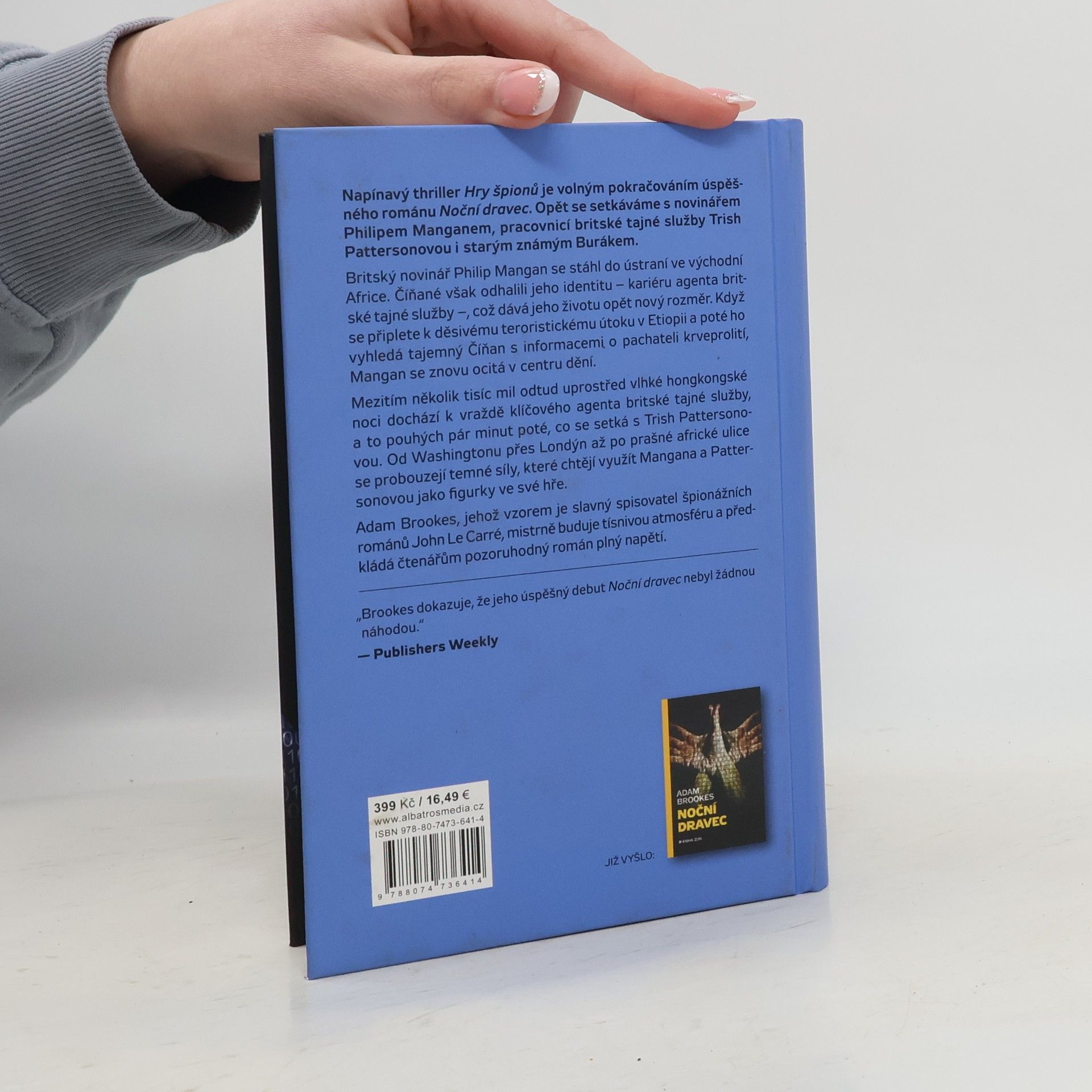 Napínavý thriller Hry špionů je pokračováním úspěšného románu Noční dravec. Opět se setkáváme s novinářem Philipem Manganem, pracovnicí britské tajné služby Trish Pattersonovou i starým známým Burákem. Britský novinář Philip Mangan se stáhl do ústraní ve východní Africe. Číňané však odhalili jeho identitu – kariéru agenta britské tajné služby – což dává jeho životu opět nový rozměr. Když se připlete k děsivému teroristickému útoku v Etiopii a poté ho vyhledá tajemný Číňan s informacemi o pachateli krveprolití, Mangan se znovu ocitá v centru dění. Mezitím několik tisíc mil odtud uprostřed vlhké hongkongské noci dochází k vraždě klíčového agenta britské tajné služby, a to pouhých pár minut poté, co se setká s Trish Pattersonovou. Od Washingtonu přes Londýn až po prašné africké ulice se probouzejí temné síly, které chtějí využít Mangana a Pattersonovou jako figurky ve své hře. Adam Brookes, jehož vzorem je slavný spisovatel špionážních románů John Le Carré, mistrně buduje tísnivou atmosféru a předkládá čtenářům pozoruhodný román plný napětí.
