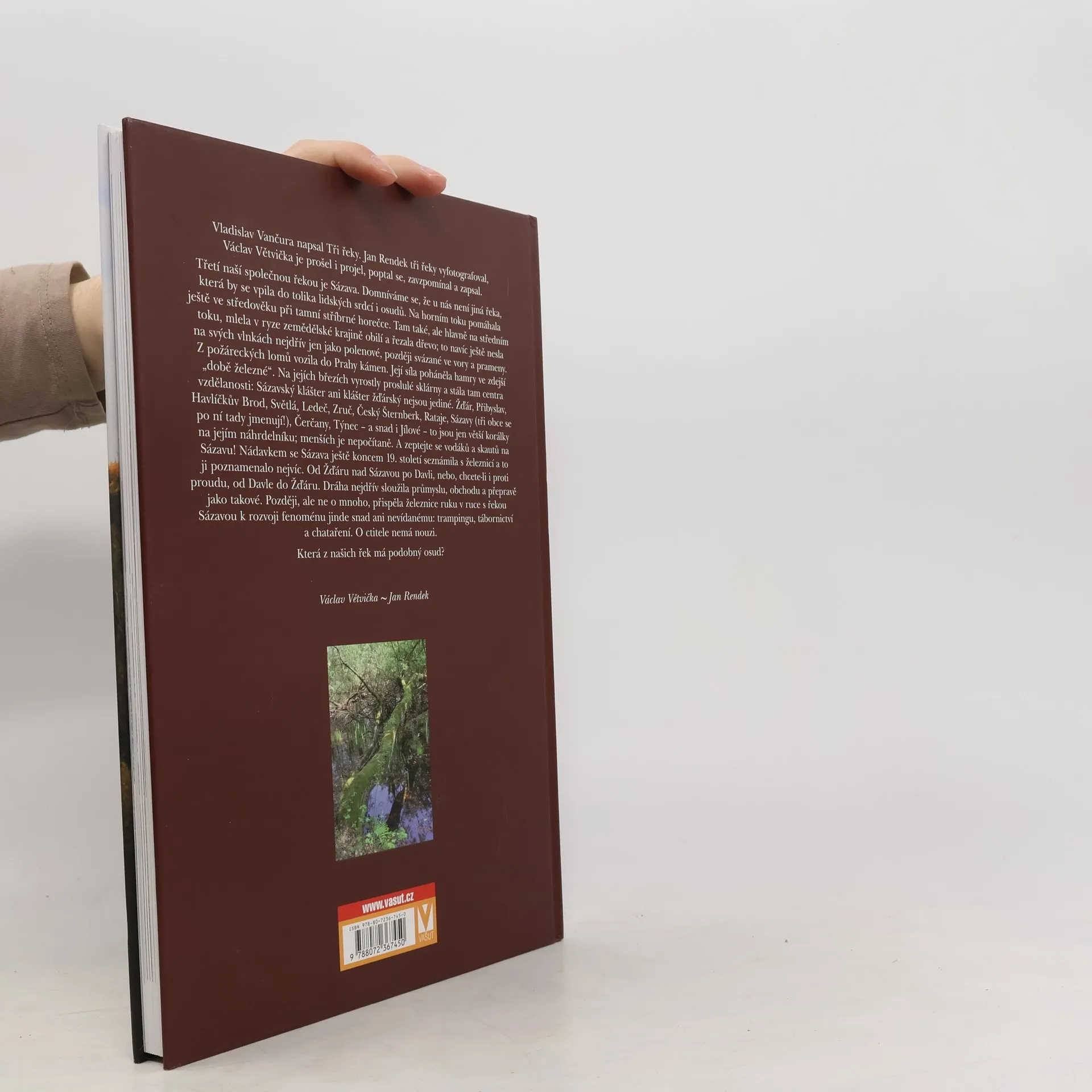 Vladislav Vančura napsal Tři řeky, Jan Rendek je vyfotografoval a Václav Větvička je prošel, projel, zavzpomínal a zapsal. Třetí společnou řekou je Sázava, která se vpila do mnoha lidských srdcí a osudů. Na horním toku pomáhala během středověké stříbrné horečky, zatímco na středním toku mlela obilí a řezala dřevo, které nesla na svých vlnkách, nejprve jako polena a později ve vory. Z požáreckých lomů vozila do Prahy kámen a její síla poháněla hamry v „době železné“. Na jejích březích vyrostly proslulé sklárny a vzdělanostní centra, jako Sázavský a Žďárský klášter. Města jako Žďár, Přibyslav, Havlíčkův Brod, Světlá a další jsou jen větší korálky na jejím náhrdelníku. Sázava se také na konci 19. století seznámila s železnicí, což ji významně poznamenalo. Dráha sloužila průmyslu a obchodu, později přispěla k rozvoji trampingu, tábornictví a chataření. Sázava má mnoho ctitelů a její osud je jedinečný. Která z našich řek se může pochlubit podobným příběhem?