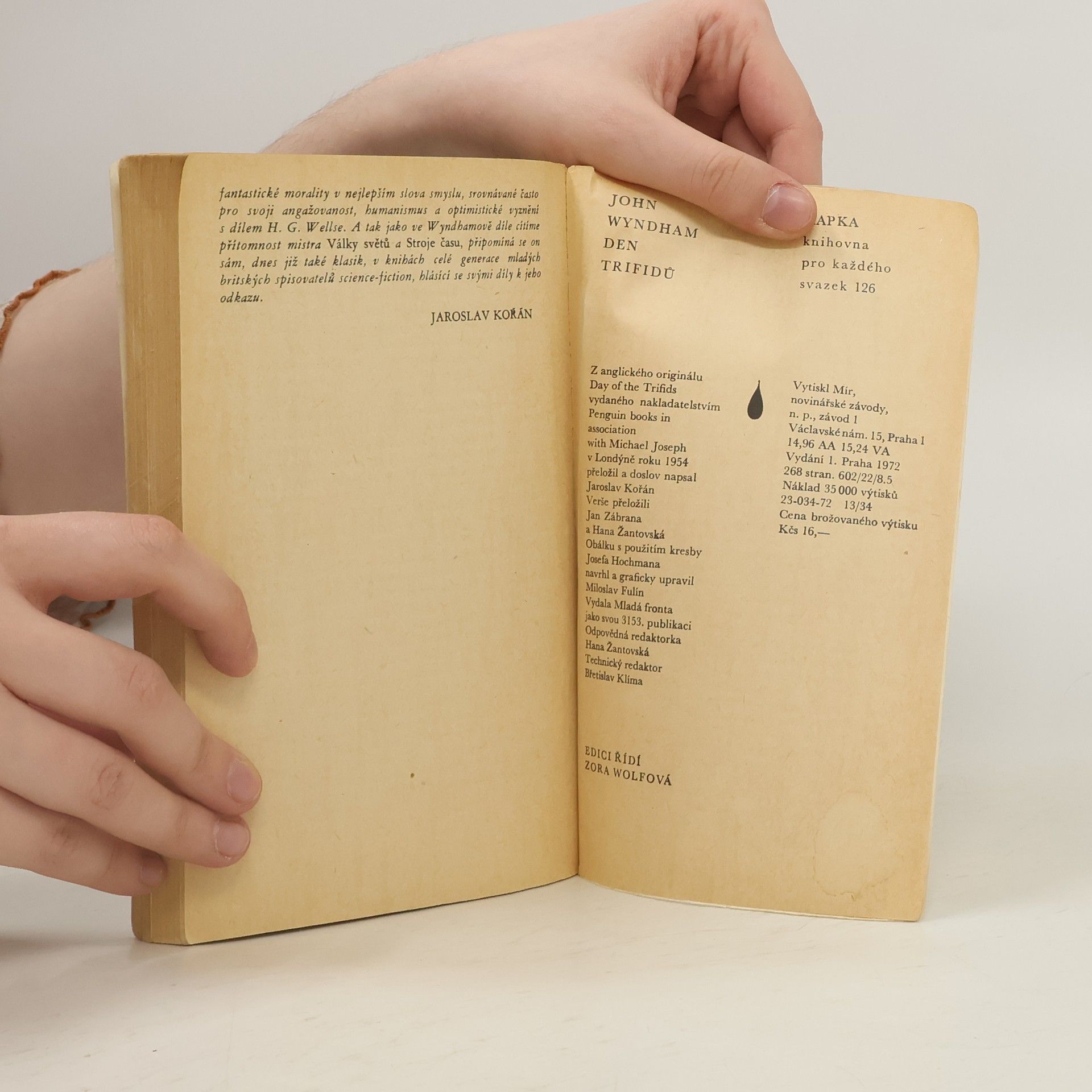 Román o tom, jak neznámý úkaz způsobí u většiny pozemšťanů slepotu a jak toho využijí průmyslové rostliny „trifidi“, které náhle vyvinou zcela nečekané vlastnosti a zaútočí na lidi, má v sobě dostatek prvků neobvyklosti, aby čtenáře přitahoval. Zároveň mu však nechybí onen welsovský obecný pohled na život a jeho reálné jádro, které z fantastického příběhu činí podobenství o skutečném ohrožení přírody člověkem a člověka přírodou. 23-034-72