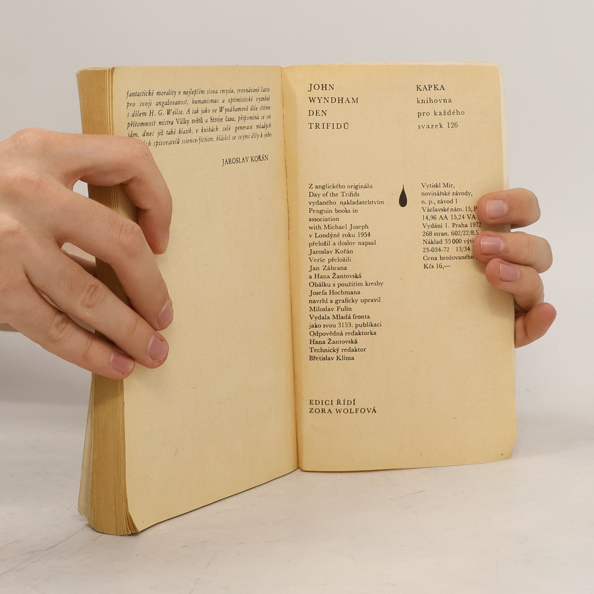 Román o tom, jak neznámý úkaz způsobí u většiny pozemšťanů slepotu a jak toho využijí průmyslové rostliny „trifidi“, které náhle vyvinou zcela nečekané vlastnosti a zaútočí na lidi, má v sobě dostatek prvků neobvyklosti, aby čtenáře přitahoval. Zároveň mu však nechybí onen welsovský obecný pohled na život a jeho reálné jádro, které z fantastického příběhu činí podobenství o skutečném ohrožení přírody člověkem a člověka přírodou. 23-034-72