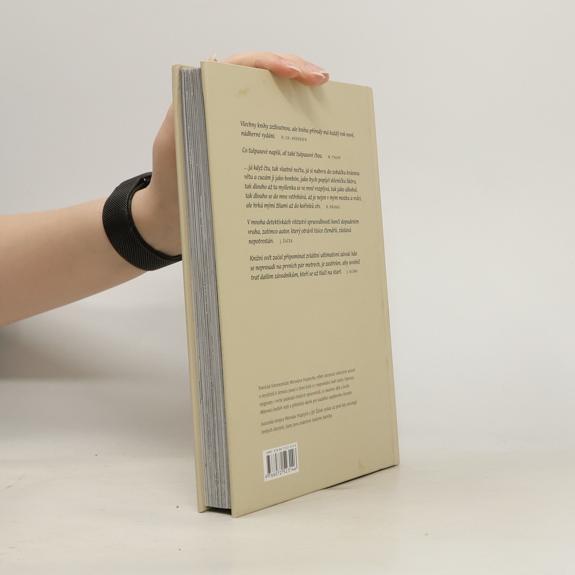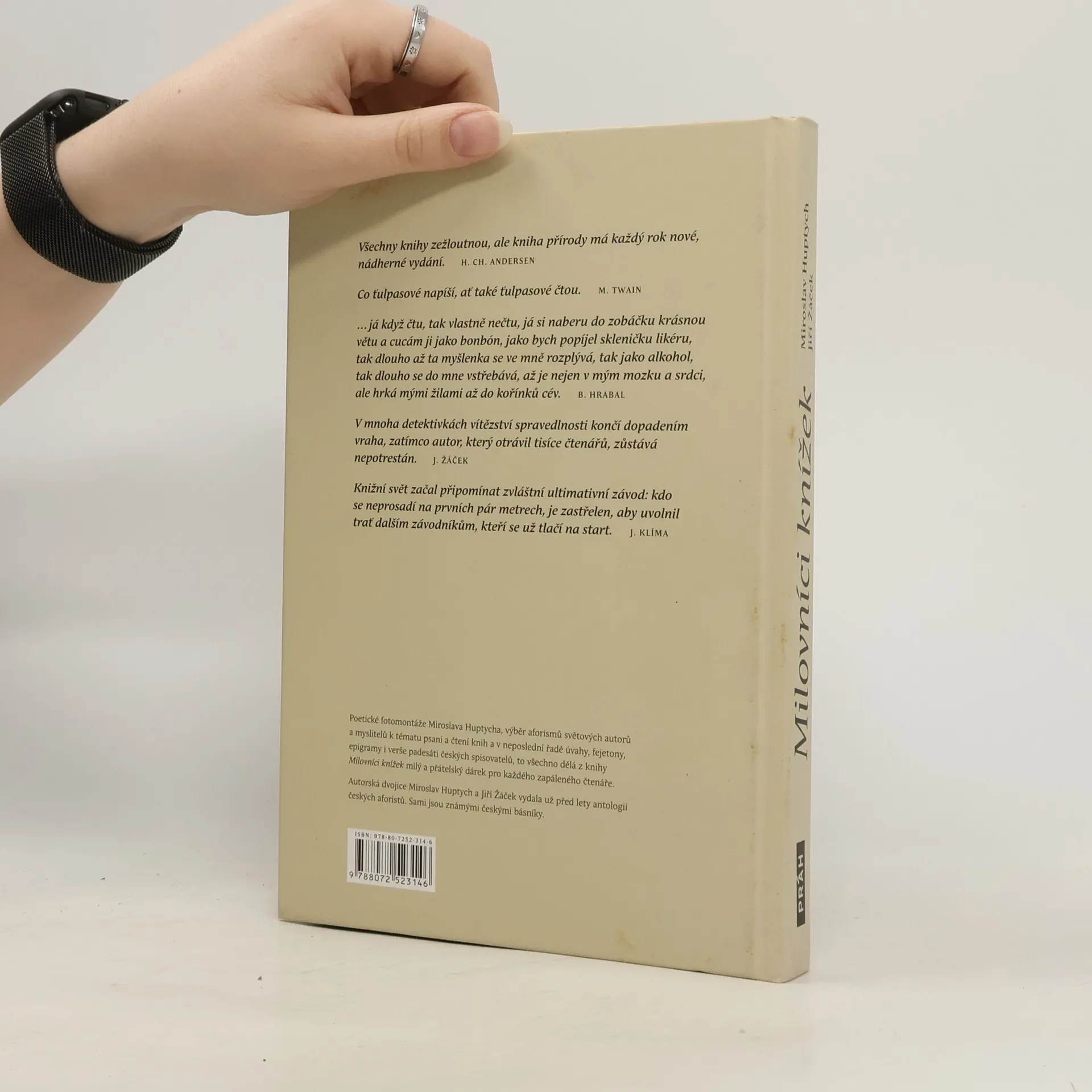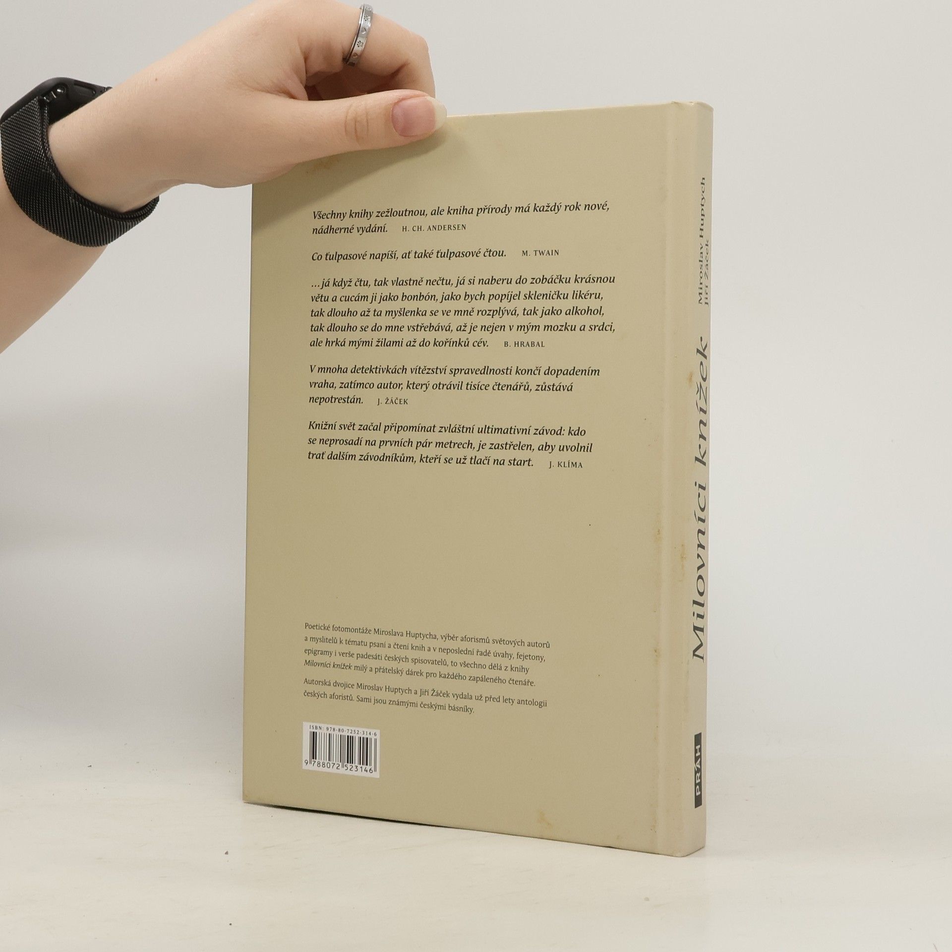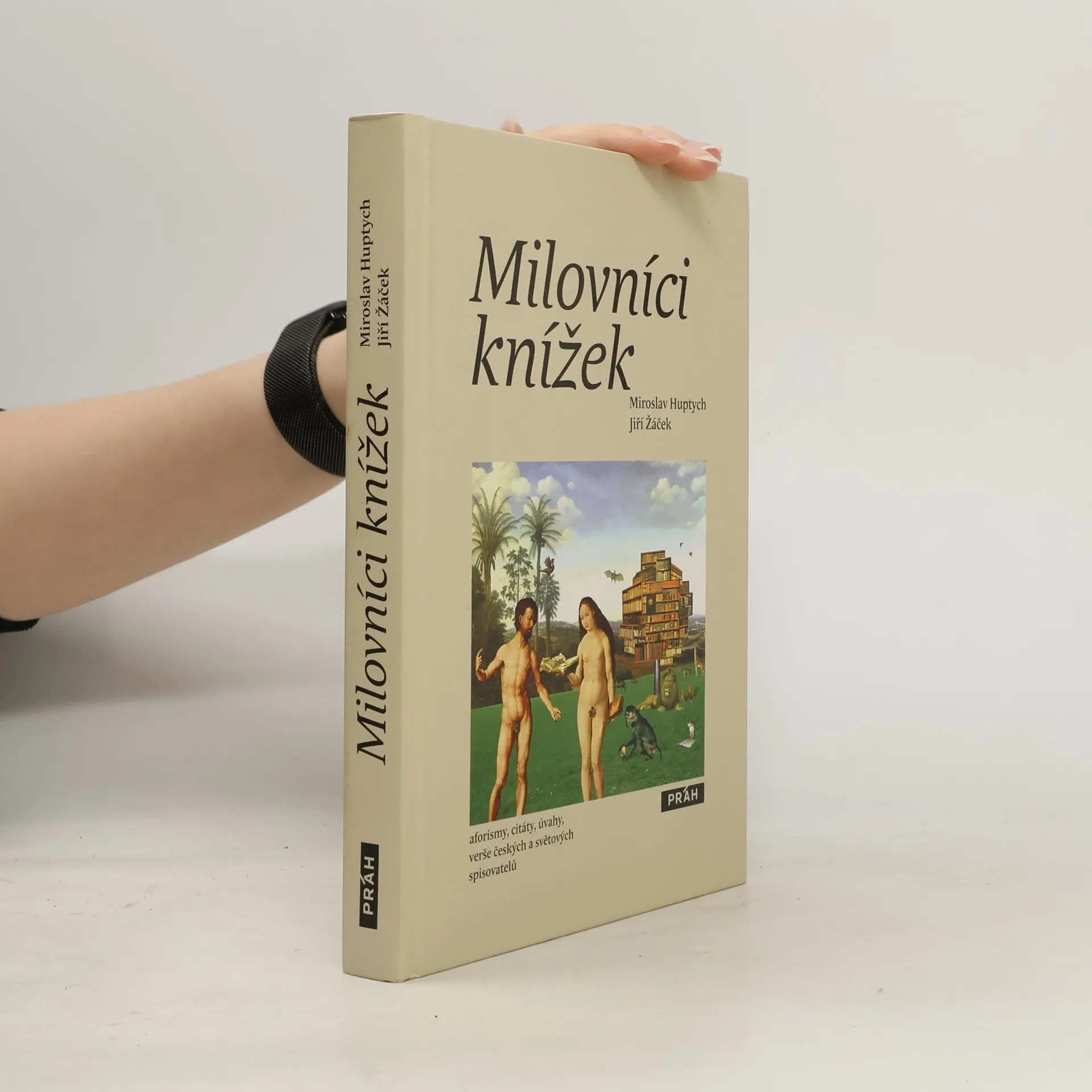 Poetické fotomontáže Miroslava Huptycha, výběr aforismů světových autorů a myslitelů k tématu psaní a čtení knih a v neposlední řadě úvahy, fejetony, epigramy i verše padesáti českých spisovatelů, to všechno dělá z knihy Milovníci knížek milý a přátelský dárek pro každého zapáleného čtenáře. Autorská dvojice Miroslav Huptych a Jiří Žáček vydala už před lety antologii českých aforistů. Sami jsou známými českými básníky.
