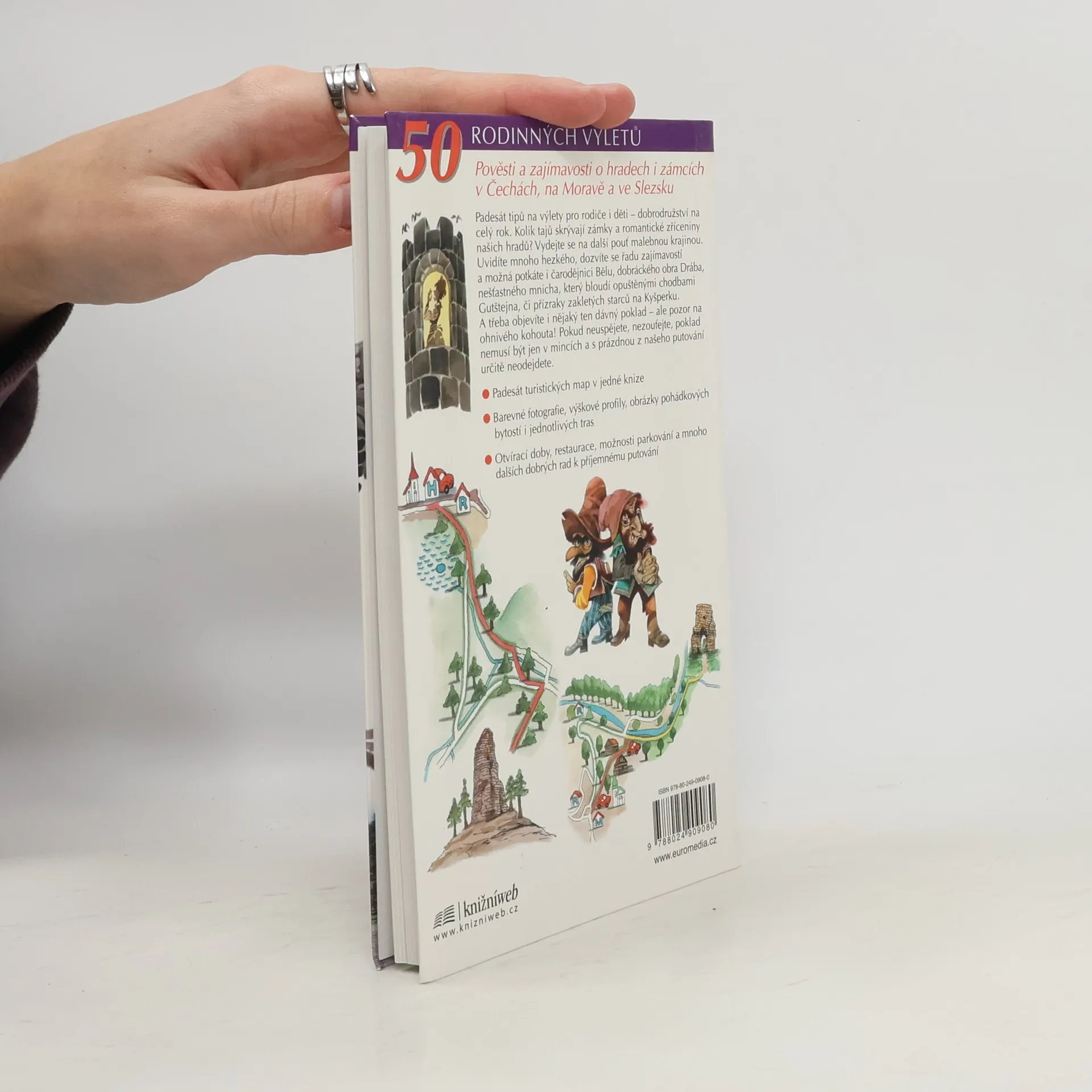 Padesát tipů na výlety pro rodiče i děti - dobrodružství na celý rok. Kolik tajů skrývají zámky a romantické zříceniny našich hradů? Vydejte se na další pouť malebnou krajinou. Uvidíte mnoho hezkého, dozvíte se řadu zajímavostí a možná potkáte i čarodějnici Bělu, dobráckého obra Drába, nešťastného mnicha, který bloudí opuštěnými chodbami Gutštejna, či přízraky zakletých starců na Kyšperku. A třeba objevíte i nějaký ten dávný poklad - ale pozor na ohnivého kohouta! Pokud neuspějete, nezoufejte, poklad nemusí být jen v mincích a s prázdnou z našeho putování určitě neodejdete. Padesát turistických map v jedné knize. Barevné fotografie, výškové profily, obrázky pohádkových bytostí i jednotlivých tras, otvírací doby, restaurace, možnosti parkování a mnoho dalších dobrých rad k příjemnému putování