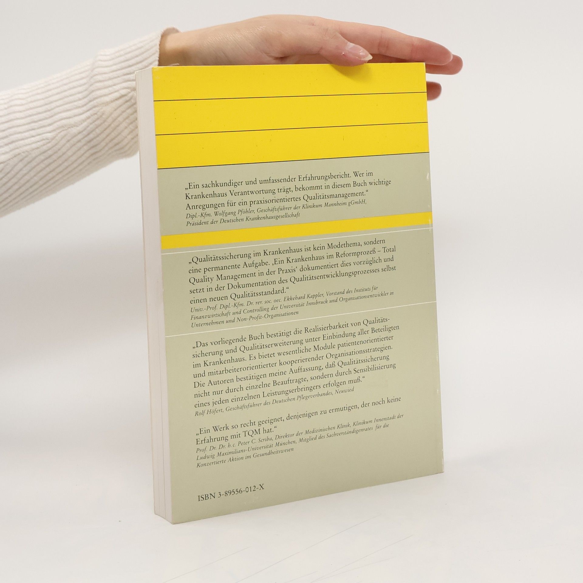Es werden praktische Erfahrungen mit einem TQM-Projekt an einem grossen Klinikum geschildert. Das Projekt wird aus Sicht aller Bereiche dargestellt: Medizin, Pflege, Verwaltung, Technik, Hygiene. Ein praxisgerechtes Werk fuer alle, die sich mit nachhaltiger Qualitaetsentwicklung im Krankenhaus befassen. Stimmen zu diesem Buch: „Ein Werk so recht geeignet, denjenigen zu ermutigen, der noch keine Erfahrung mit TQM hat.“ (Prof. Dr. Dr. h. c. Peter C. Scriba, Muenchen). „Qualitaetssicherung im Krankenhaus ist kein Modethema, sondern eine permanente Aufgabe. (Dieses Buch). dokumentiert dies vorzueglich und setzt in der Dokumentation des Qualitaetsentwicklungsprozesses selbst einen neuen Qualitaetsstandard.“