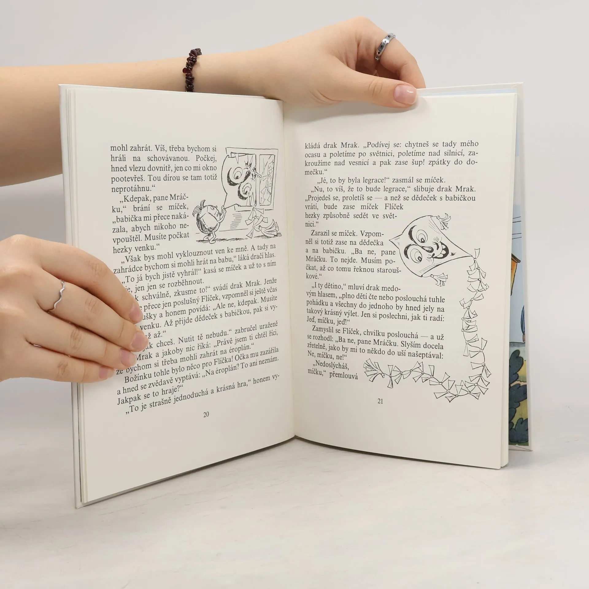 Dědeček a babičkou žili hezký život, ale bylo jim stále nějak smutno, cosi jim scházelo. Až jednou, přímo z nebe – vlastně oknem jim přiletěl do pokojíku míček. Byl to hezký, hlaďounký, kulaťoučký, ducatý, baculatý a vůbec ne ledajaký míček, a tak ho pojmenovali míček Flíček. Míček se ale zalíbil i draku Mrakovi, který ho unesl. Dědeček s babičkou ho hledají dlouho, předlouho, ale nakonec svého Flíčka za pomoci strašáka Pašáka, psíčka Pantoflíčka, ptáčka Jarabáčka přece jen najdou. Kniha je určena dětem od 5 let a vychází s původními ilustracemi Ondřeje Sekory.