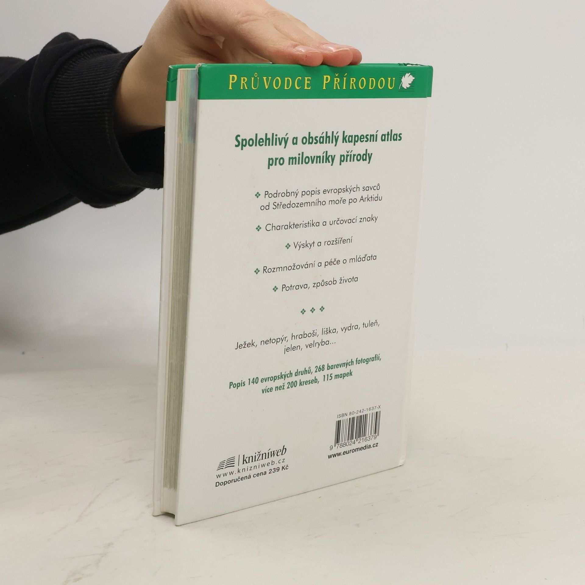 Podrobný popis 140 evropských druhů savců žijících od Středozemního moře až po Arktidu. Informace o znacích, výskytu, způsobu života, rozšíření, rozmnožování a péči o mláďata a potravě doplňují výstižné kresby a fotografie zvířat v jejich přirozeném prostředí. Kniha je doplněná přehlednou tabulkou otisků chodidlových plošek a stop našich běžných savců a informacemi o ochraně zvířat.