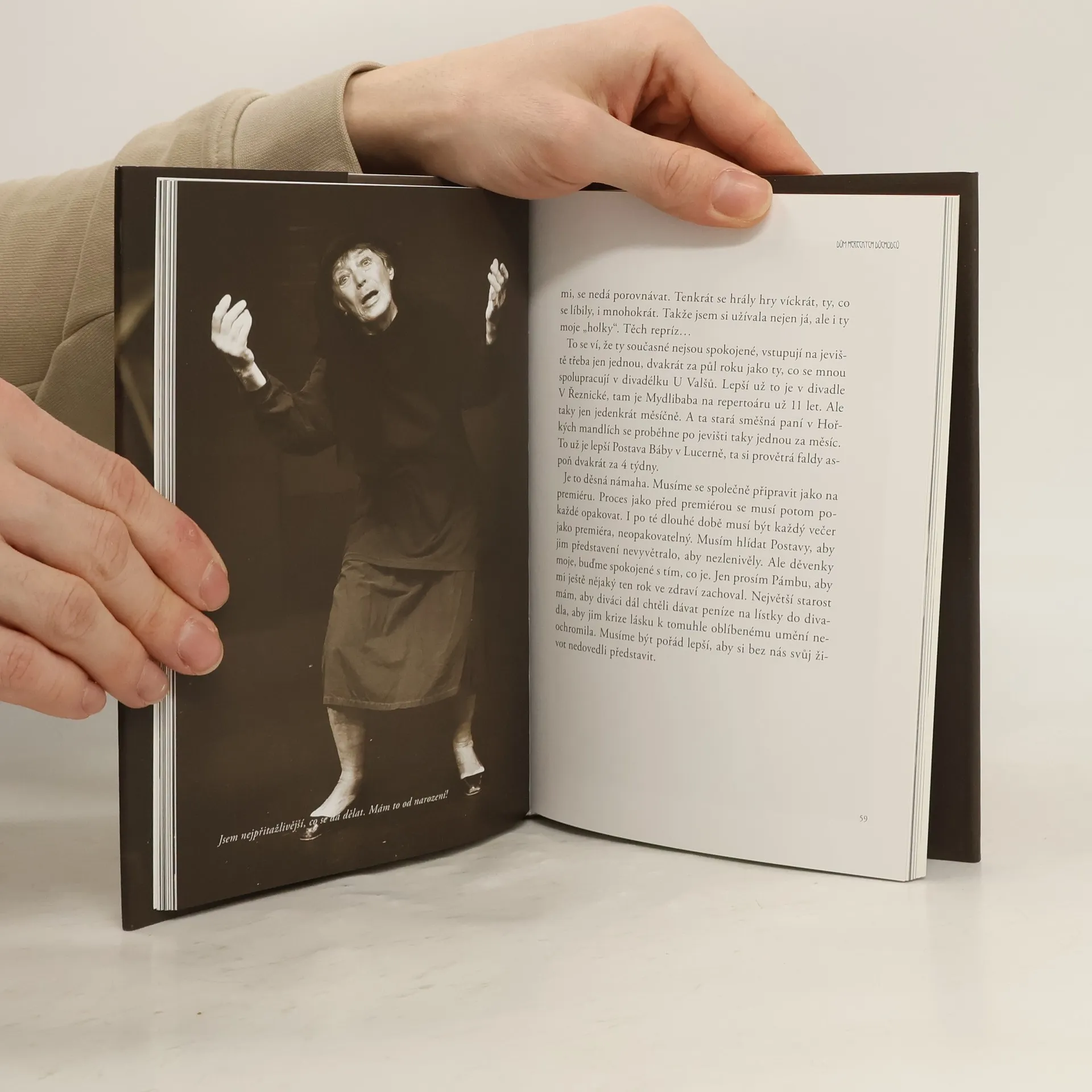 Je to o tom, co se děje v herci během večera, den před představením, hodinu před ním, i minutu. Co prožívá při přípravě na tento sváteční večer, jak se na něj chystá, jak do sebe láduje denně spousty textu, jak vypadá při tom jeho mozek i myšlénky, co pociťuje při samotném vystoupení, při děkovném klanění, po skončení, při cestě domů a pak doma. A taky o tom, jak je všechno jiné, než si to diváci představují. A jaké má herec pomocníky, kdo jsou ty herecké POSTAVY, které povstávají z autora a režiséra, jsou to takové jejich VÝRONY. Jak to s nimi vypadá, když skončí divadlo, a co mohou ve svých volných chvílích podnikat na vlastní pěst. Pak je tam spousta rozverných historek. Většinou jsou to horrory, ale pravdivé, které herečka skutečně prožila a může to odpřísáhnout. Například Tragedie téměř antická ve starém Parku kultury se slivovicí a geniálním hercem Milošem Kopeckým, Bledý přízrak v noční Grébovce, Vypila vitriol, nikoli však z nešťastné lásky, a mnoho dalších.