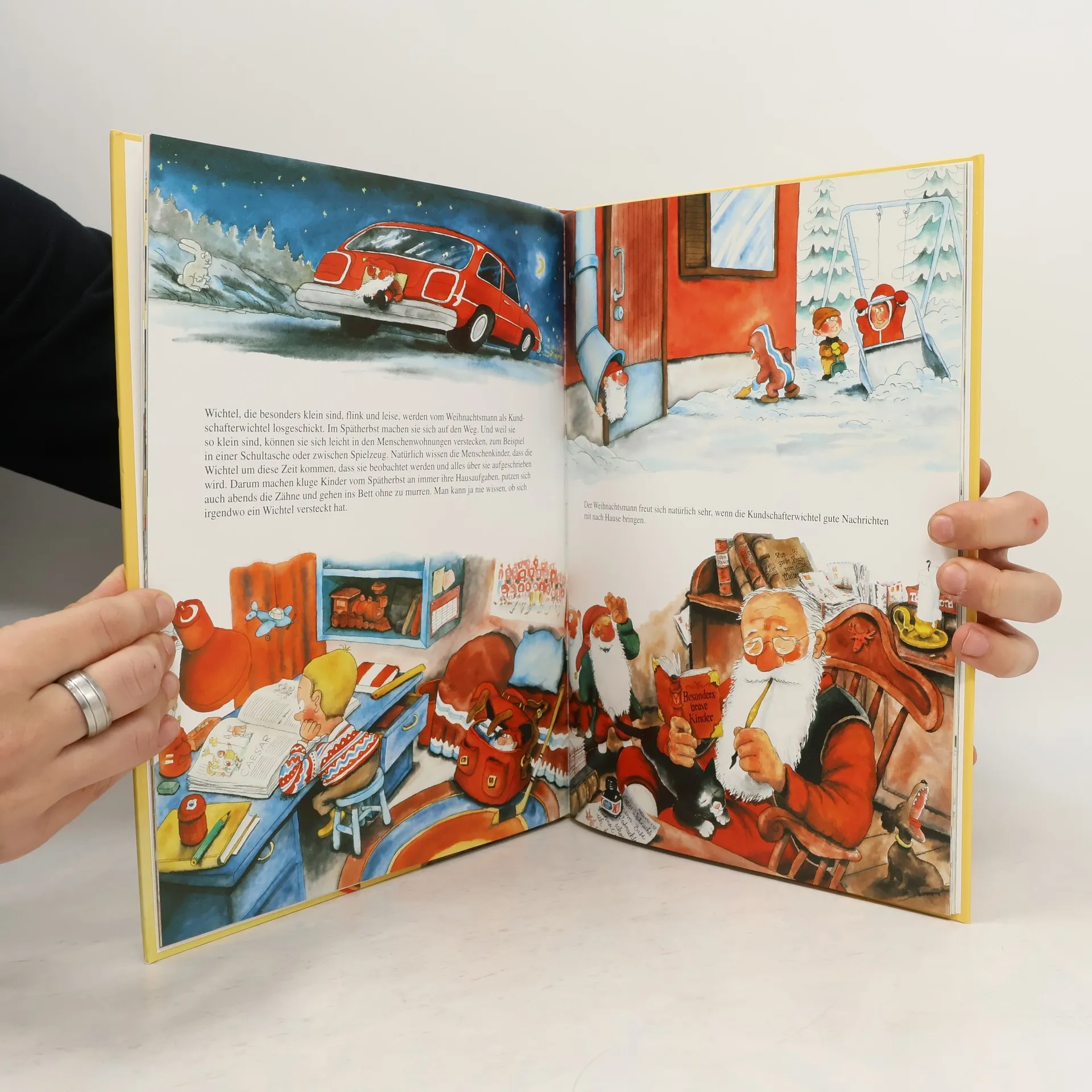 Weit oben in Lappland, wo die Winter lang und kalt und dunkel sind, liegt ein kleines Dorf, von dem wohl jedes Kind gern mehr erfahren möchte. Es ist das Dorf, in dem der Weihnachtsmann mit seinen Wichteln wohnt. Das ganze Jahr hindurch, von früh bis spät, wird dort gehämmert und gesägt, gedruckt und geleimt, gedrechselt und gehobelt, dass die Späne nur so fliegen. Denn der Weihnachtsmann und seine Wichtel sind dafür zuständig, dass die Weihnachtswünsche aller Kinder erfüllt werden. Und die Kinder haben heute viele Wünsche! Großes, buntes Bilderbuch zum Schmunzeln, Träumen, Staunen und zum Immer-wieder-Anschauen . Für kleine und große Kinder und alle, die sich ihre Freude auf Weihnachten erhalten haben. Finnischer Bilderbuch-Klassiker ab 4 Jahren.