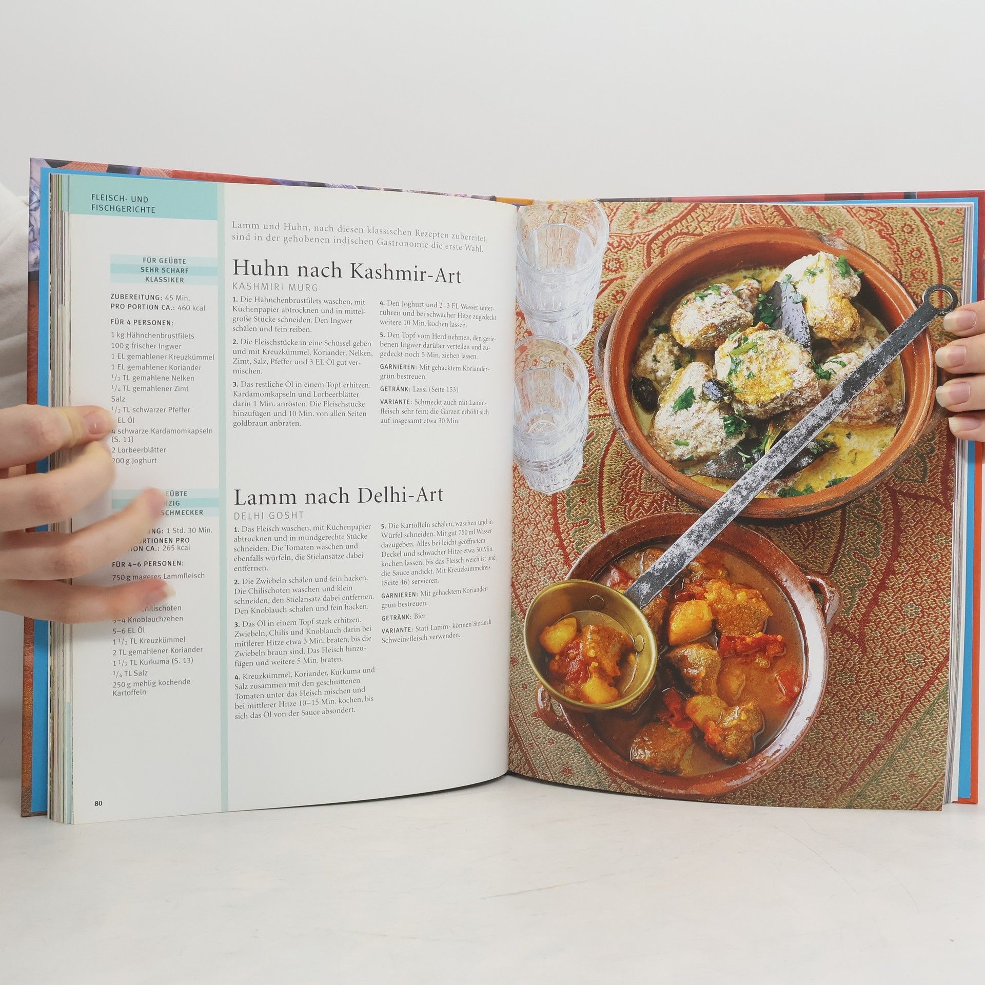 Köche aus Kaschmir und Kanya Kumari sind kulinarisch weiter voneinander entfernt als Köche aus Skandinavien und Spanien. Die berühmte brennende Schärfe indischer Speisen, besonders, im Süden, treibt dem unvorsichtigen Esser ein tiefes Rot ins Gesicht und Tränen in die Augen, während man im Norden in den beliebten vollaromatischen Currys schwelgt. Die fantasievolle Verwendung der Zutaten und die immer wieder variierenden Gewürzzusammenstellungen lassen eine unerschöpfliche Vielfalt an Speisen entstehen. Und wie bei den Gewürzmischungen ist es auch eine Kunst die verschiedene Speisen zu einem harmonischen ganzen Mahl zusammen-zufügen. So probiert man erst knusprige Kokos-Garnelen, wechselt dann zu Scharfem Huhn nach Kashmir Art, knabbert ein Stück Papadam, um gleich auch noch Linsen mit Spinat zu versuchen. Zum Abschluss schmeichelt ein Grieß-Mandel-Dessert dem Gaumen und gewürzter Tee schließt mit einem Aromafeuerwerk den Genuss ab.