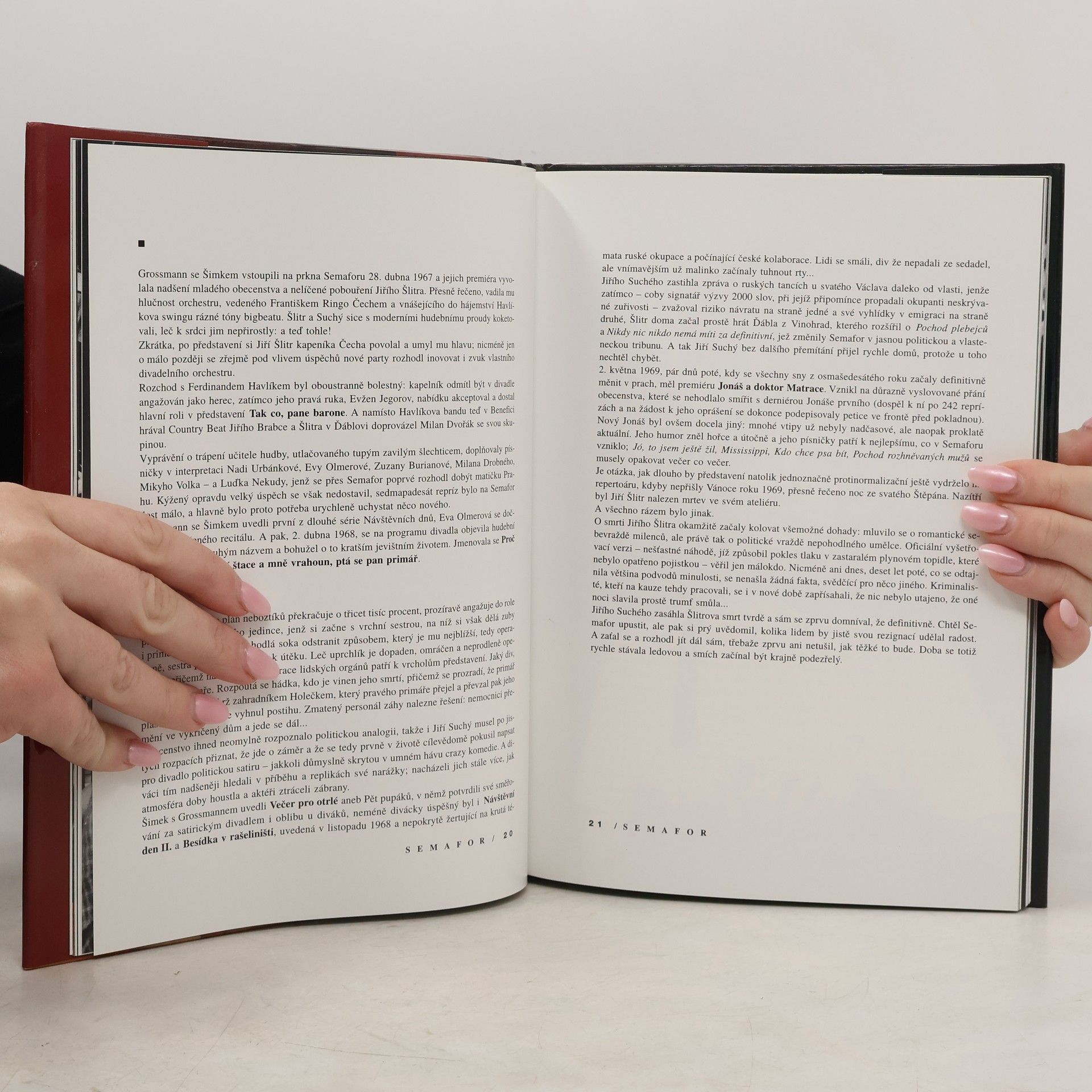 Divadlo Semafor a jeho čtyřicet roků se dřív či později stane určitě tématem dizertační práce či encyklopedie. My jsme ale - při práci na téhle knize - nemysleli na divadelní vědce, nýbrž na věrné diváky, kteří po čtyřicet sezón stáli fronty u pokladny, lapali melodie a slova nových písniček, těšili se na své hvězdy a vlídně přijímali nové talenty, smáli se a tleskali.... celý text