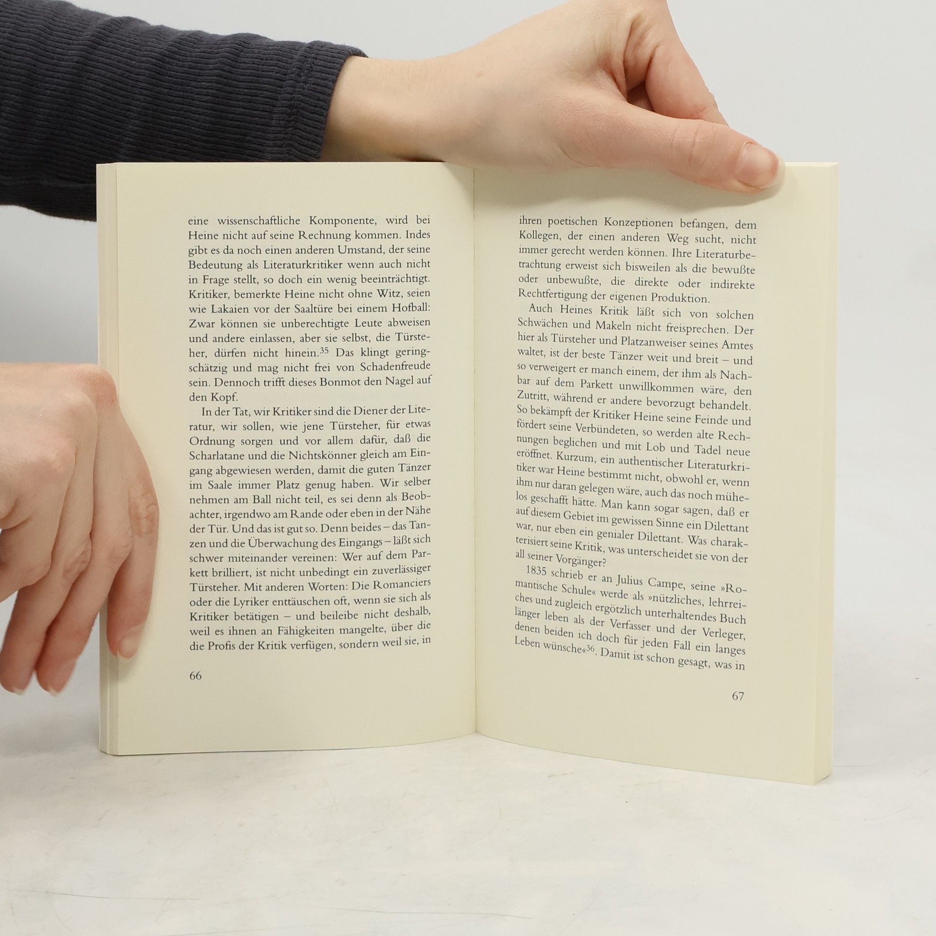 'Wenn es um Heine ging, wurde in Deutschland seit eh und je scharf geschossen. Ein geborener Provokateur war er und ein ewiger Ruhestörer. Er ging ins Exil, um nie in Deckung gehen zu müssen. Seine Biographie reicht vom jüdischen Mittelalter bis zur europäischen Neuzeit, sein Werk führt von der deutschen Romantik zur Moderne der Deutschen. Stets setzte er sich zwischen alle Stühle. Und fast will es scheinen, als sei da immer noch sein Platz. Aber es spricht nicht gegen Heine, dass sein Werk uns immer wieder beunruhigt. Dass es noch ist, was es war: eine Provokation und eine Zumutung.' (Marcel Reich-Ranicki)