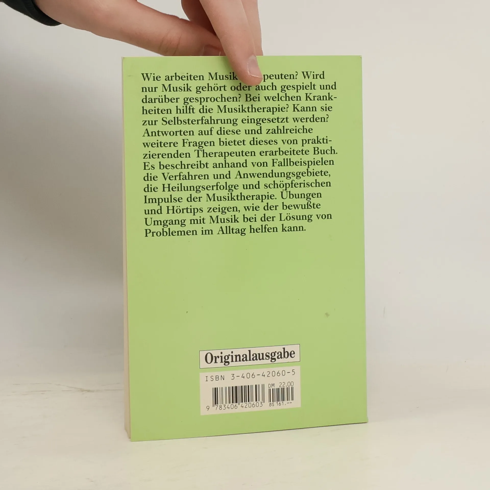 Wie arbeiten Musiktherapeuten? Wird nur Musik gehört oder auch gespielt und darüber gesprochen? Bei welchen Krankheiten hilft die Musiktherapie? Kann sie zur Selbsterfahrung eingesetzt werden? Antworten auf diese und zahlreiche weitere Fragen bietet dieses von praktizierenden Therapeuten erarbeitete Buch. Es beschreibt anhand von Fallbeispielen die Verfahren und Anwendungsgebiete, die Heilungserfolge und schöpferischen Impulse der Musiktherapie. Übungen und Hörtips zeigen, wie der bewußte Umgang mit Musik bei der Lösung von Problemen im Alltag helfen kann