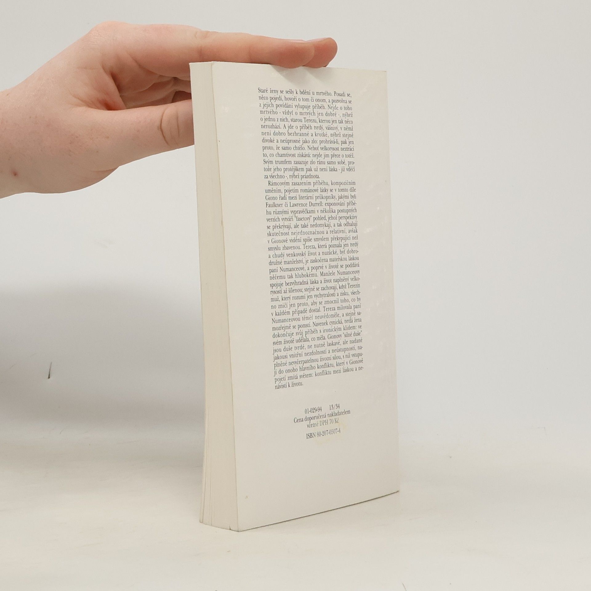 Děj je rámován nočním sezením u mrtvého, kdy si několik starých žen krátí chvíli vyprávěním. Odvíjí se tak z několika pohledů život nejstarší z nich, ženy, která v životě poznala skutečně čistou lásku v mateřské lásce své zaměstnavatelky a ochránkyně. Její muž z hlouposti a chamtivosti tuto ženu zničil a po zbytek jeho života se mu hrdinka rafinovaně mstí. Na poměrně malém prostoru vystavěl autor pomocí barvitého a mnohotvárného jazyka. sugestivní příběh o konfliktu mezi láskou a nenávistí a rozporuplném vztahu člověka k životu. Baladický příběh z autorovy rodné Provence vypráví o souboji dobra a zla v duši prosté a tvrdé venkovské ženy.... celý text