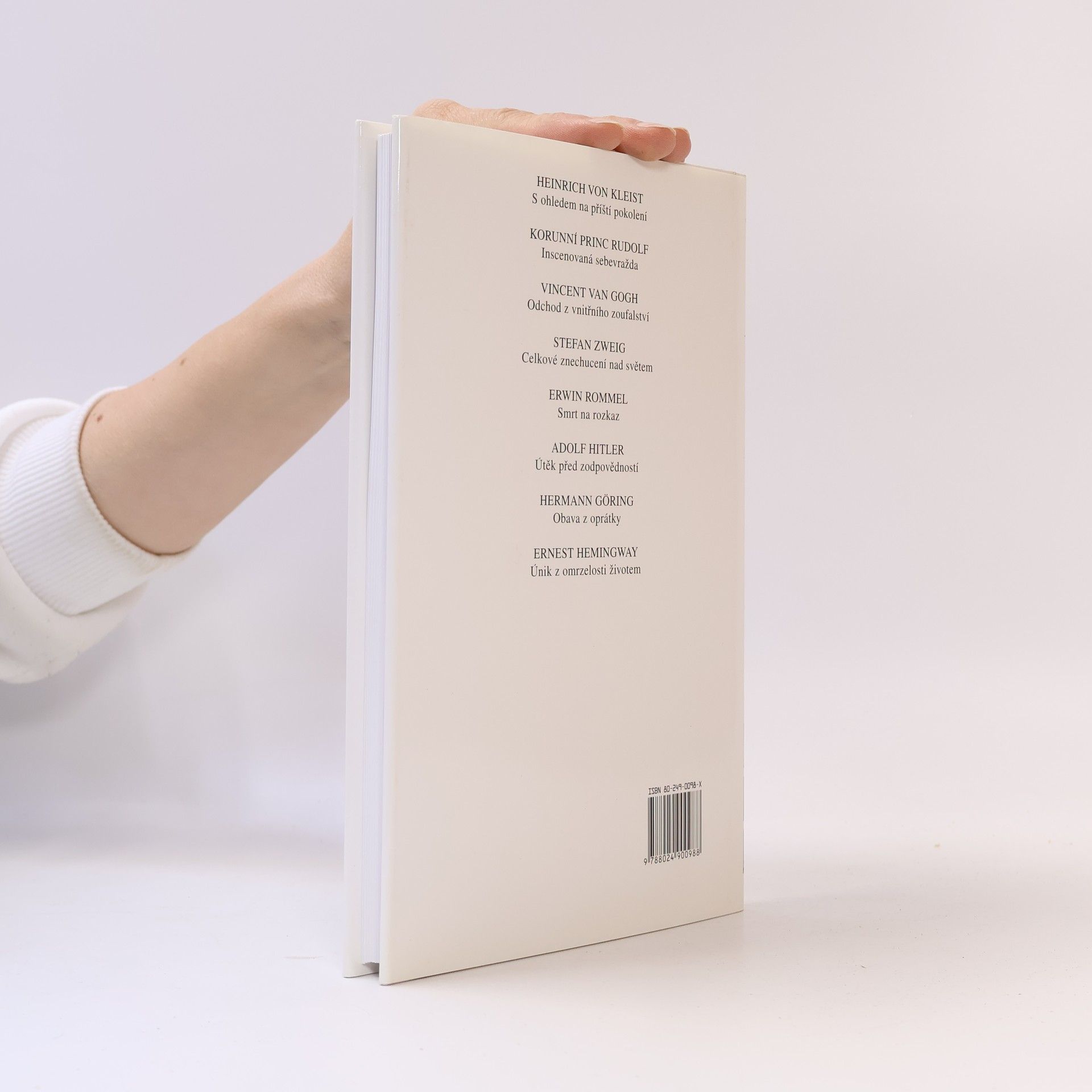 Slavné osobnosti světových dějin, literatury i výtvarného umění, jejich dobrovolný odchod ze života a jeho motivy. Rozbor historických okolností sebevražd dvou německých spisovatelů, tří nacistických pohlavárů včetně Adolfa Hitlera, holandského malíře Vincenta van Gogha a amerického spisovatele Ernesta Hemingwaye. Všechny analýzy jsou doplněny základními životopisnými údaji a podobiznou dané osobnosti. Knihu uzavírá přehled německé populární literatury o sebevraždě jako takové a o všech uvedených osobnostech.