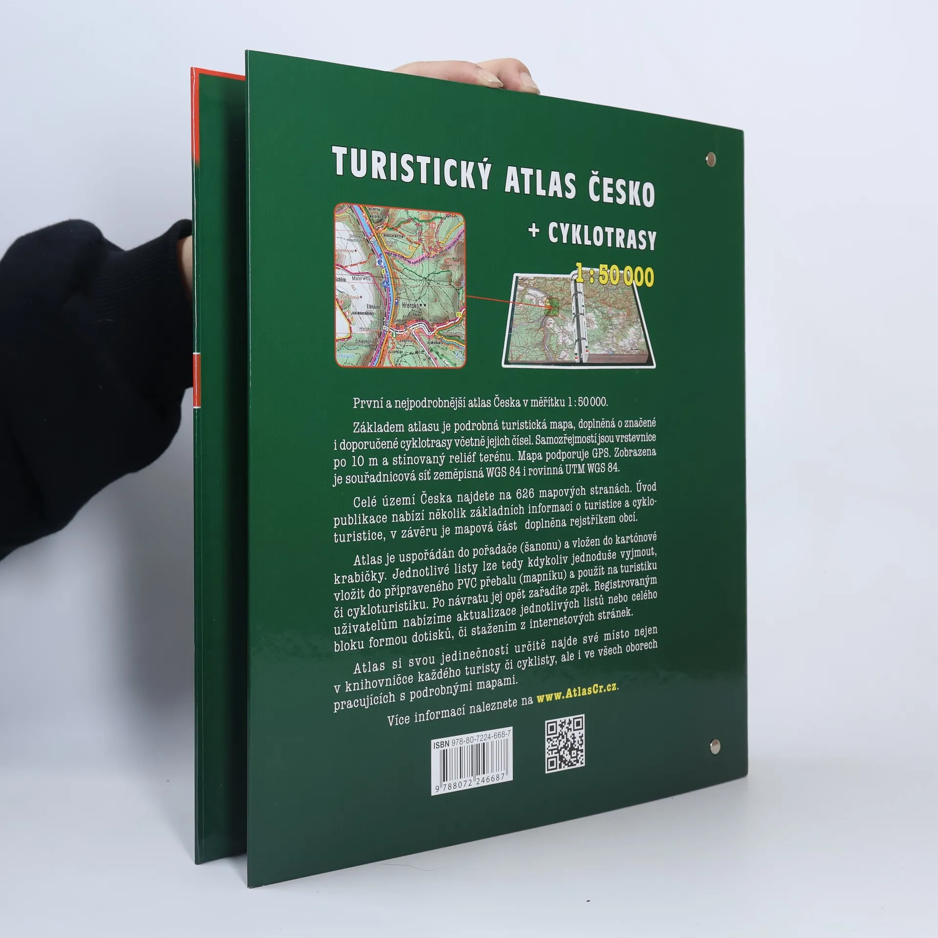 Základem atlasu je podrobná turistická mapa, doplněná o značené i připravované cyklotrasy včetně jejich čísel. Samozřejmostí jsou vrstevnice po 10 m a stínovaný reliéf terénu. Mapa podporuje GPS. Pro souřadnicovou síť je použit systém S42. Celé území Česka najdete na 626 mapových stranách. Úvod publikace nabízí několik základních informací o turistice a cykloturistice, v závěru je mapová část doplněna rejstříkem obcí. Atlas je uspořádán do pořadače (šanonu) a vložen do kartónové krabičky. Jednotlivé listy lze tedy kdykoliv jednoduše vyjmout, vložit do připraveného PVC přebalu (mapníku) a použít na turistiku či cykloturistiku. Po návratu jej opět zařadíte zpět. Pro zájemce o aktualizaci připravujeme jednoduché reedice poškozených či aktualizovaných stránek formou dotisků, či pouhým stažením z internetových stránek. Atlas si svou jedinečností určitě najde své místo nejen v knihovničce každého turisty či cyklisty, ale i ve všech oborech pracujících s podrobnými mapami.