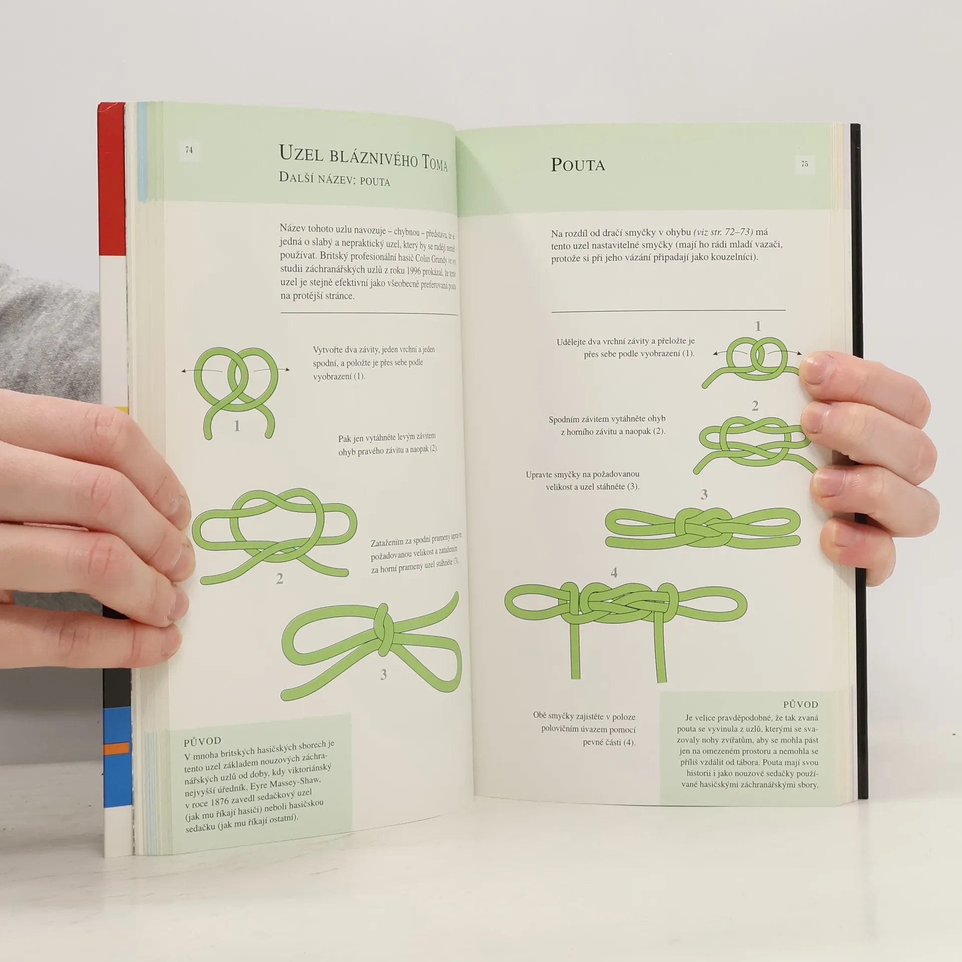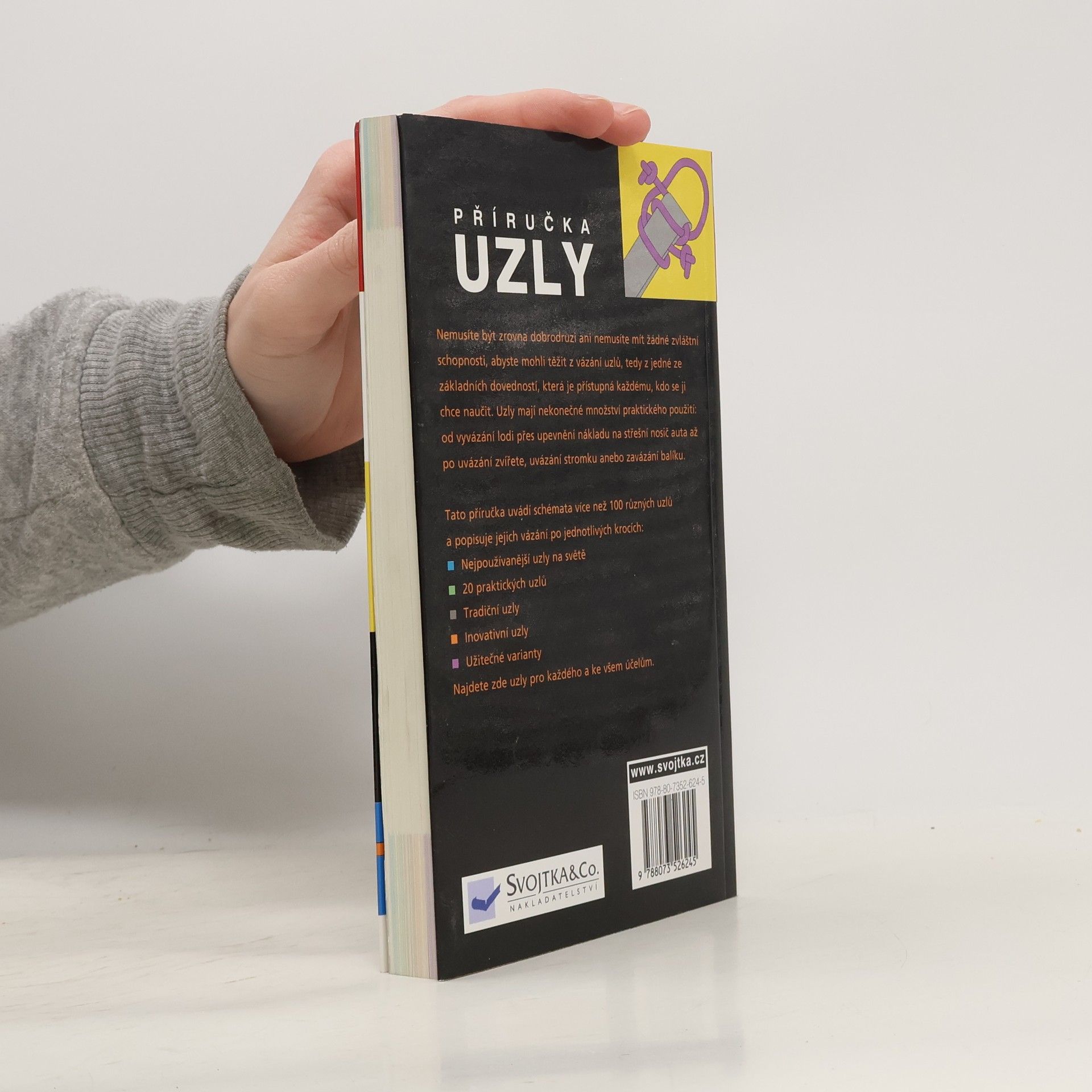 Nemusíte být zrovna dobrodruzi ani nemusíte mít žádné zvláštní schopnosti, abyste mohli těžit z vázání uzlů, tedy z jedné ze základních dovedností, která je přístupná každému, kdo se ji chce naučit. Uzly mají nekonečné množství praktického použití: od vyvázání lodi přes upevnění nákladu na střešní nosič auta až po uvázání zvířete, uvázání stromku anebo zavázání balíku. Tato příručka uvádí schémata více než 100 různých uzlů a popisuje jejich vázání po jednotlivých krocích: . Nejpoužívanější uzly na světě . 20 praktických uzlů . Tradiční uzly . Inovativní uzly . Užitečné varianty Najdete zde uzly pro každého a ke všem účelům.