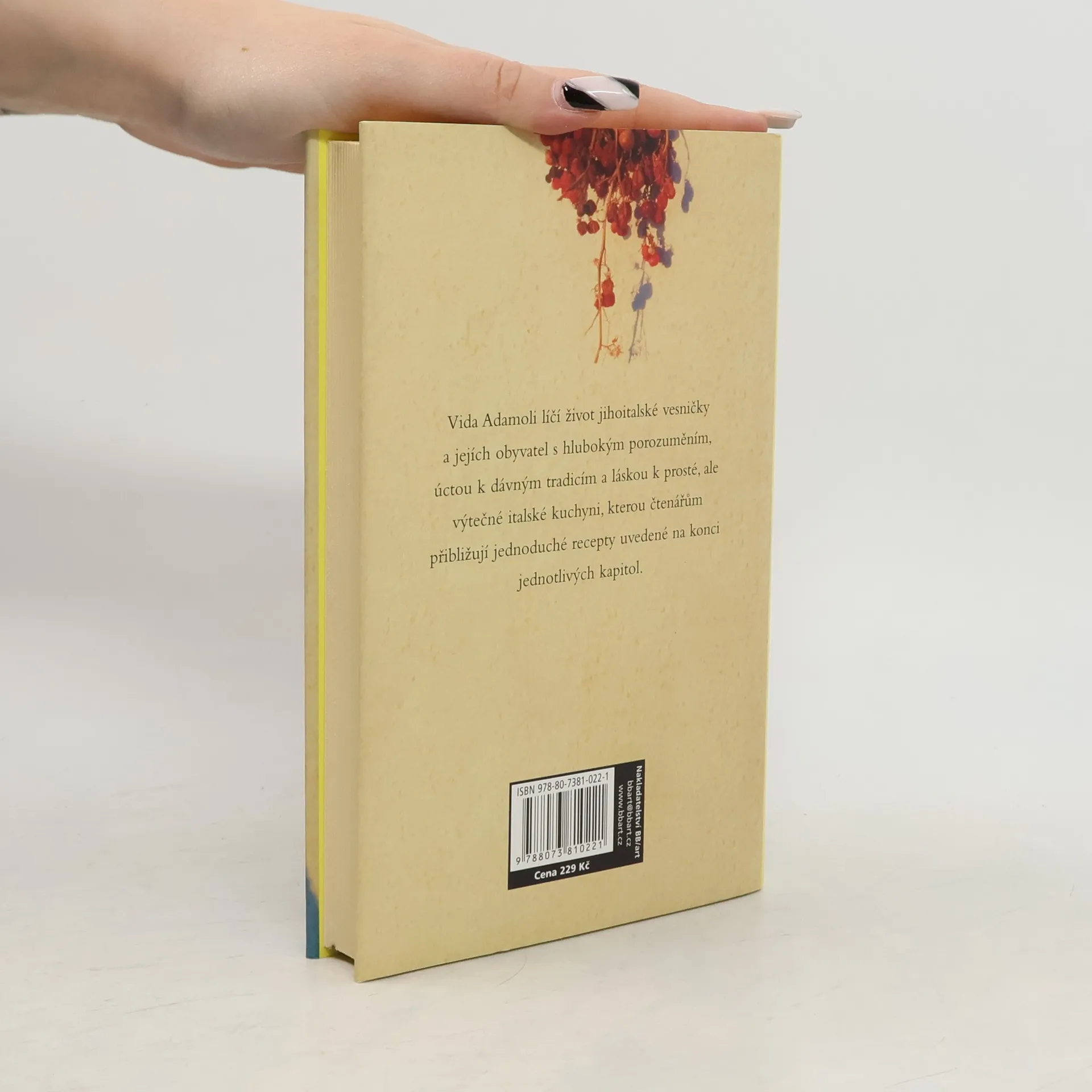Život, láska a jídlo v jižní Itálii Angličanka Vida Adamoli se v osmnácti letech provdala za svého italského přítele Lorenza a odstěhovala se s ním do Říma. Rodina si od počátku svého života v Itálii zamilovala malou jihoitalskou vesničku nad mořem, kde život léta plynul neměnným tempem bez pochybného dobrodiní technického pokroku a lidé se řídili stejnými zvyky, jako jejich dávní předkové. Za dvacet let se autorce podařilo překonat zakořeněnou nedůvěru k lidem odjinud a stát se součástí vesnice, sdílet starosti i radosti starousedlíků a společně s nimi s lítostí sledovat vpád civilizace se všemi negativními jevy, které postupně mění tvář půvabného místa. Vyprávění zahrnuje dvacet let života vesnice a autorka líčí drobné příběhy jejích obyvatel s porozuměním a láskou, s úctou zaznamenává jejich staré tradice a s obdivem se vyjadřuje o místní prosté a nápadité kuchyni. Aby své tvrzení podpořila, vybrala osmnáct jednoduchých receptů, jimiž končí jednotlivé kapitoly.