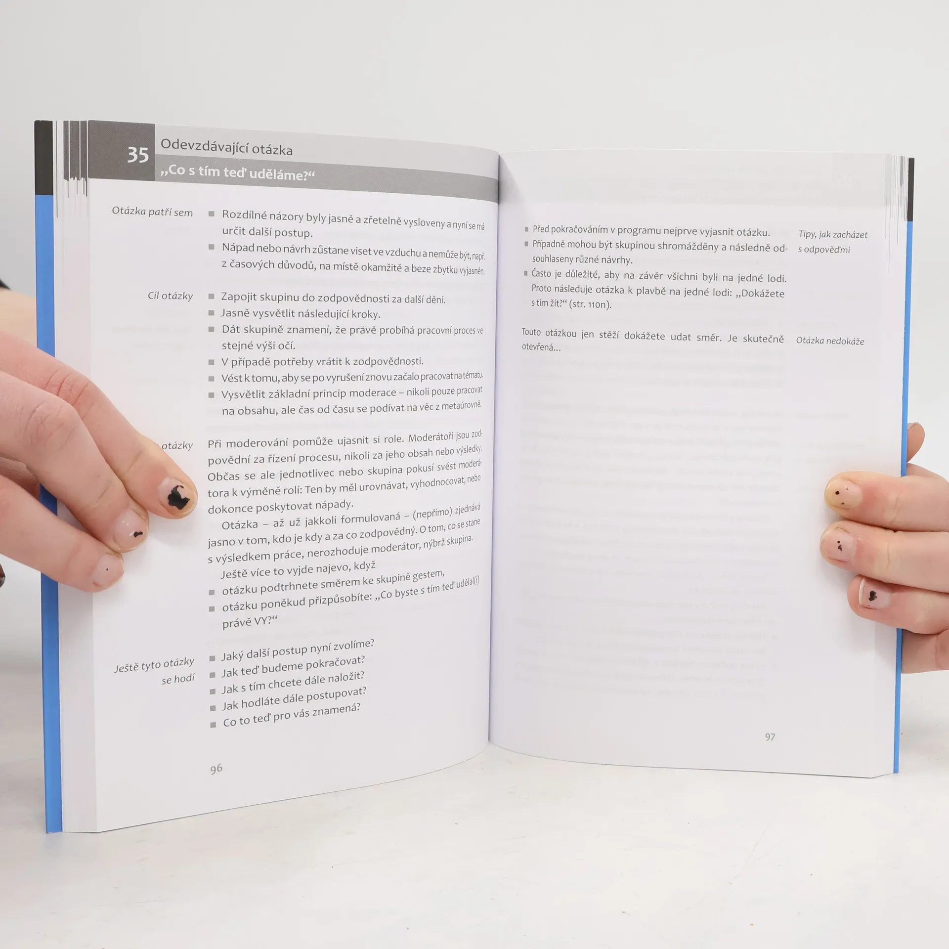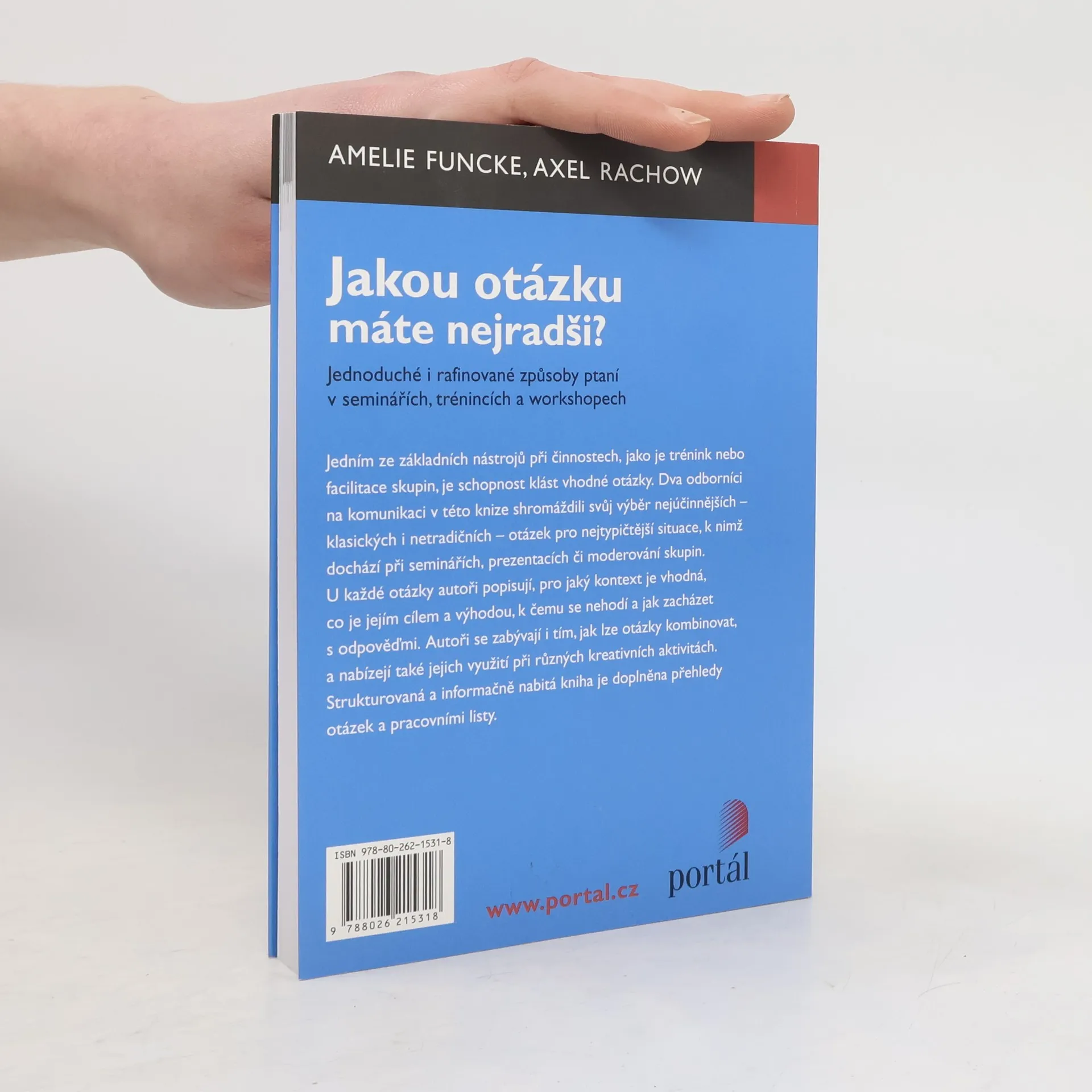 Jednoduché i rafinované způsoby ptaní v seminářích, trénincích a workshopech. Jedním ze základních nástrojů při činnostech, jako je trénink nebo facilitace skupin, je schopnost klást vhodné otázky. Dva odborníci na komunikaci v této knize shromáždili svůj výběr nejúčinnějších – klasických i netradičních – otázek pro nejtypičtější situace, k nimž dochází při seminářích, prezentacích či moderování skupin. Podrobně je tak pojednáno o 48 otázkách, přičemž u každé z nich autoři popisují, pro jaký kontext je vhodná, co je jejím cílem a výhodou, k čemu se nehodí a jak zacházet s odpověďmi. Autoři se zabývají i tím, jak lze otázky kombinovat a nabízejí také jejich využití při kreativních aktivitách. Strukturovaná a informačně nabitá kniha je doplněna přehledy otázek a pracovními listy.