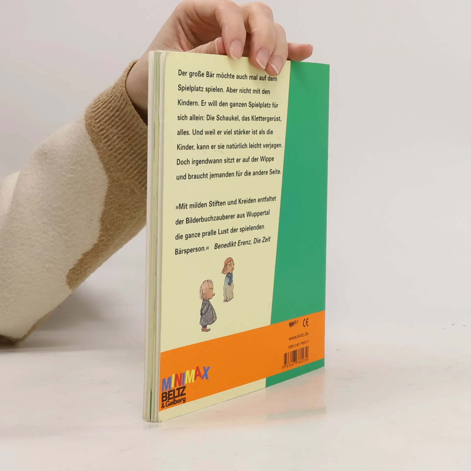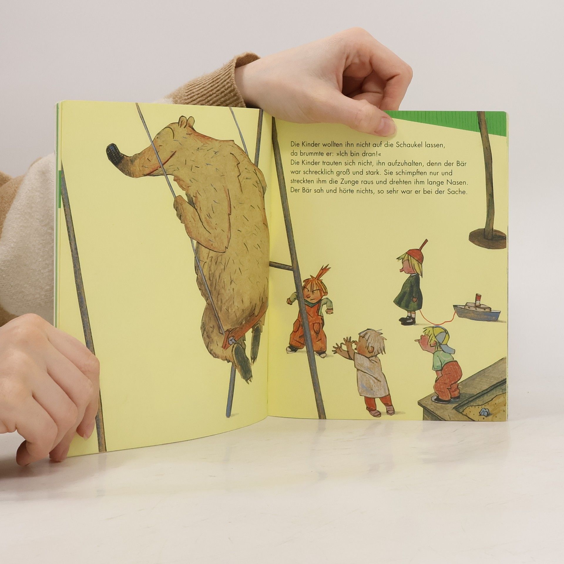 Der Bär war so hungrig und rannte zum Eiswagen. Dabei sah er so groß und schrechklich aus, dass sogar der Eismann davonlief . Unso besser, dachte der Bär und aß das ganze Eis auf. Der große Bär möchte auch mal auf dem Spielplatz spielen. Aber nicht mit den Kindern. Er will den ganzen Spielplatz für sich allein: Die Schaukel, das Klettergerüst, alles. Und weil er viel stärker ist als die Kinder, kann er sie natürlich leicht verjagen. Doch irgendwann sitzt er auf der Wippe und braucht jemanden für die andere Seite. > Ein Buch, das unterhält und Kindern Mut macht, ihre Bedürfnisse zu äußern, ihren Mund aufzumachen, wenn es nötig ist.