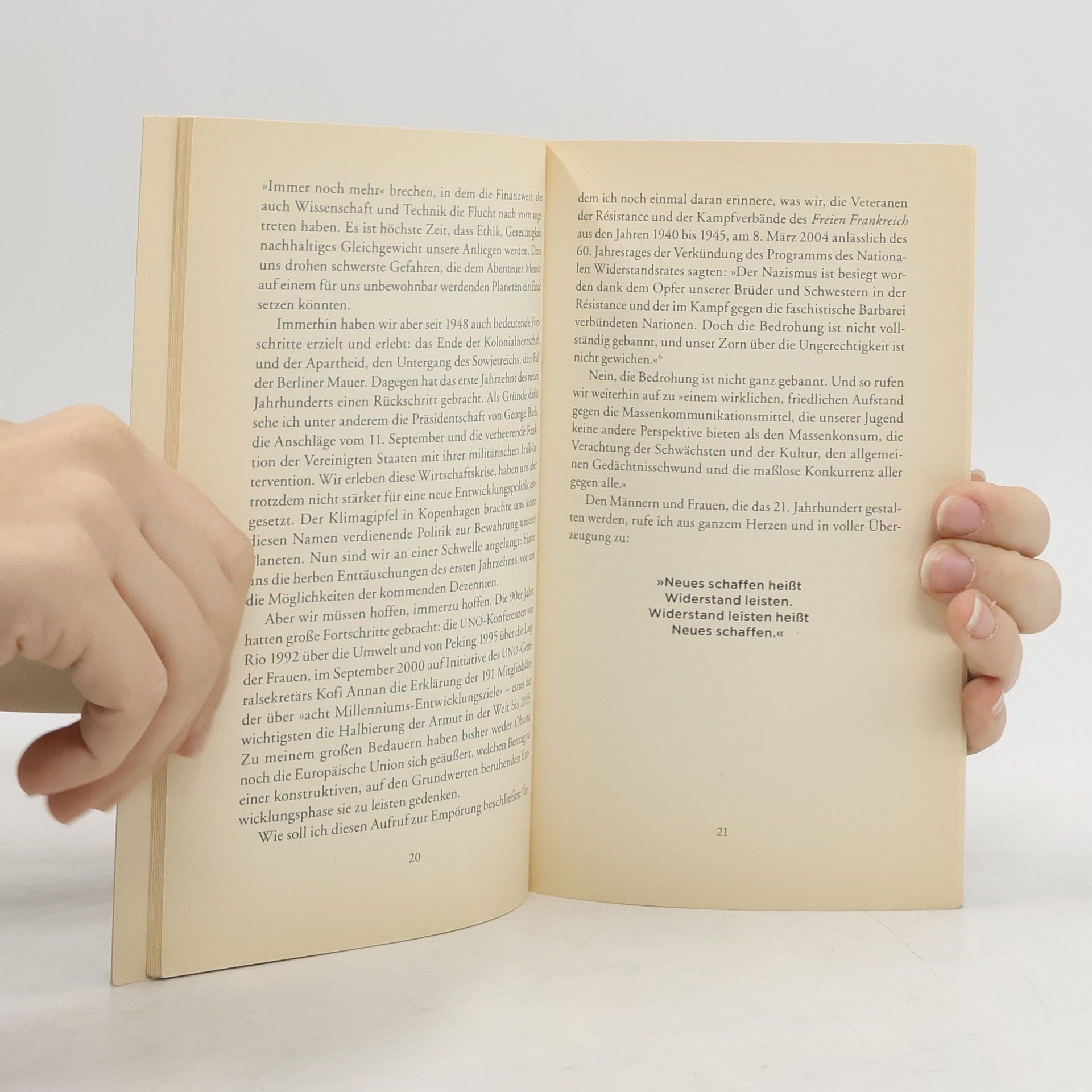 Mit eindringlichen Worten ruft Stéphane Hessel zum friedlichen Widerstand gegen die Ungerechtigkeit in unserer Gesellschaft auf. Gegen die Diktatur des Finanzkapitalismus, gegen die Unterdrückung von Minderheiten, gegen die ökologische Zerstörung unseres Planeten. »93 Jahre. Das ist schon wie die allerletzte Etappe. Wie lange noch bis zum Ende? Die letzte Gelegenheit, die Nachkommenden teilhaben zu lassen an der Erfahrung, aus der mein politisches Engagement erwachsen ist.« Stéphane Hessels Streitschrift bewegt die Welt. Der gebürtige Berliner war Mitglied der Résistance, hat das KZ Buchenwald überlebt und ist einer der Mitautoren der Menschenrechtserklärung der Vereinten Nationen. Mit emphatischen Worten ruft der ehemalige französische Diplomat zum friedlichen Widerstand gegen die Unzulänglichkeiten unserer Gesellschaft auf. Er beklagt, dass der Finanzkapitalismus die Werte der Zivilisation bedroht und den Lauf der Welt diktiert. Er prangert die Lage der Menschenrechte an, kritisiert die Umweltzerstörung auf unserem Planeten und verurteilt die Politik Israels im Gaza-Streifen als Demütigung der Palästinenser. Stéphane Hessel ist das Gewissen der westlichen Welt und »Frankreichs Rebell der Stunde« (FAZ). Erleben Sie 'Empört Euch!' als 'fahrende Lichtinstallation': http://www. youtube. com/watch? v=xGuGid4lLcE „Der Diplomat Stéphane Hessel“ - Ein Kinodokumentarfilm. Jetzt auf DVD: www. derdiplomatstéphanehessel-derfilm. de