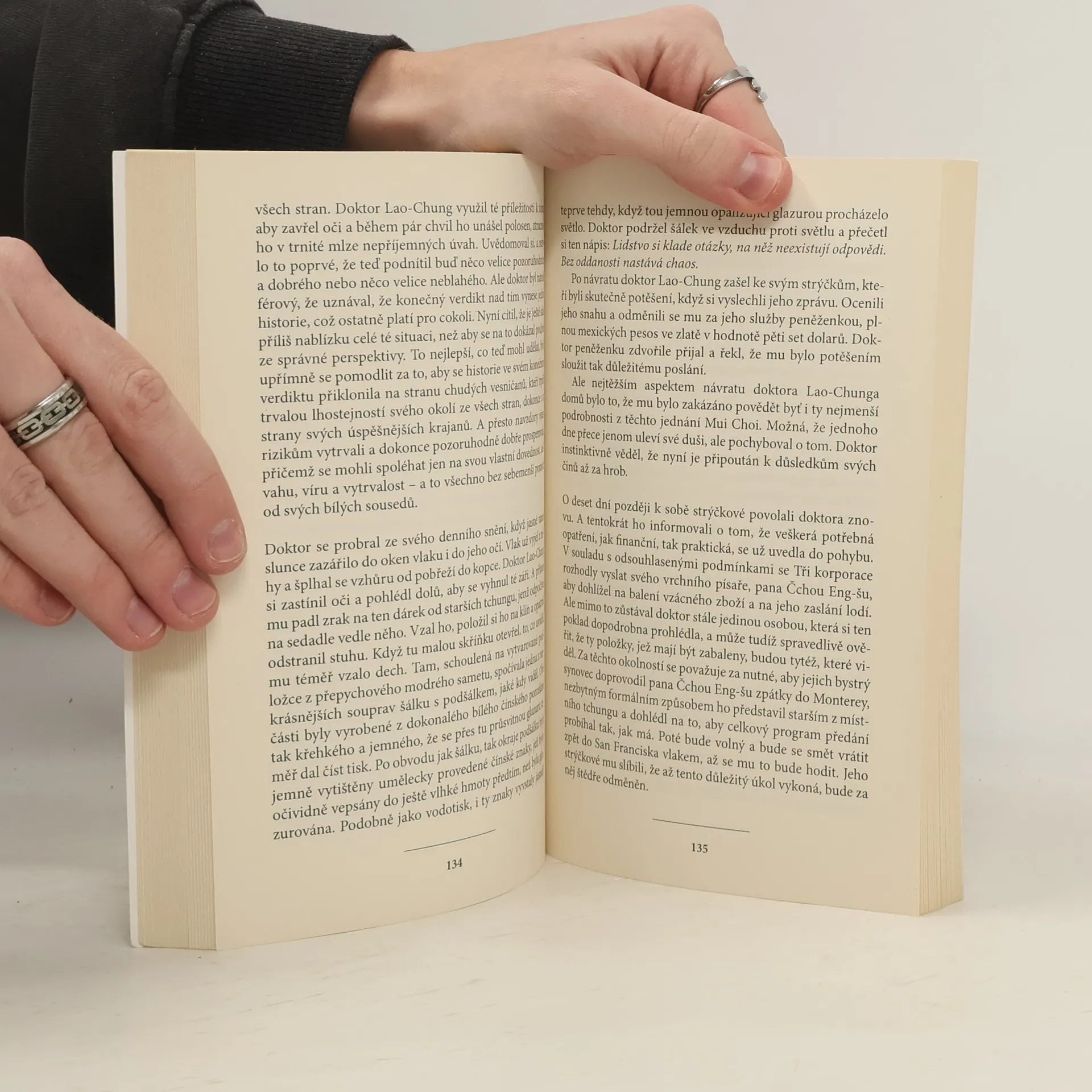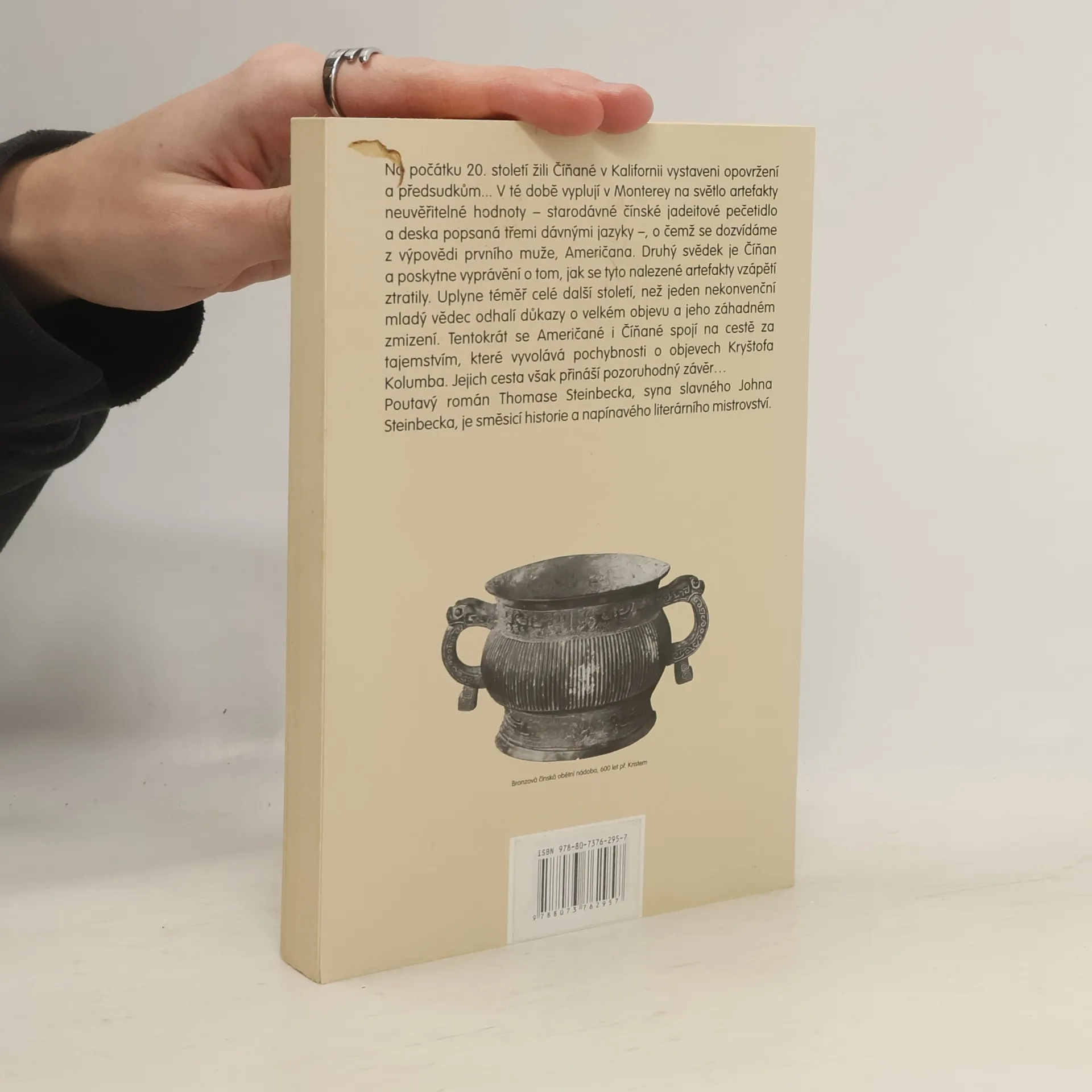 Na počátku 20. století žili Číňané v Kalifornii vystaveni opovržení a předsudkům... V té době vyplují v Monterey na světlo artefakty neuvěřitelné hodnoty – starodávné čínské jadeitové pečetidlo a deska popsaná třemi dávnými jazyky –, o čemž se dozvídáme z výpovědi prvního muže, Američana. Druhý svědek je Číňan a poskytne vyprávění o tom, jak se tyto nalezené artefakty vzápětí ztratily. Uplyne téměř celé další století, než jeden nekonvenční mladý vědec odhalí důkazy o velkém objevu a jeho záhadném zmizení. Tentokrát se Američané i Číňané spojí na cestě za tajemstvím, které vyvolává pochybnosti o objevech Kryštofa Kolumba. Jejich cesta však přináší pozoruhodný závěr... Poutavý román Thomase Steinbecka, syna slavného Johna Steinbecka, je směsicí historie a napínavého literárního mistrovství.