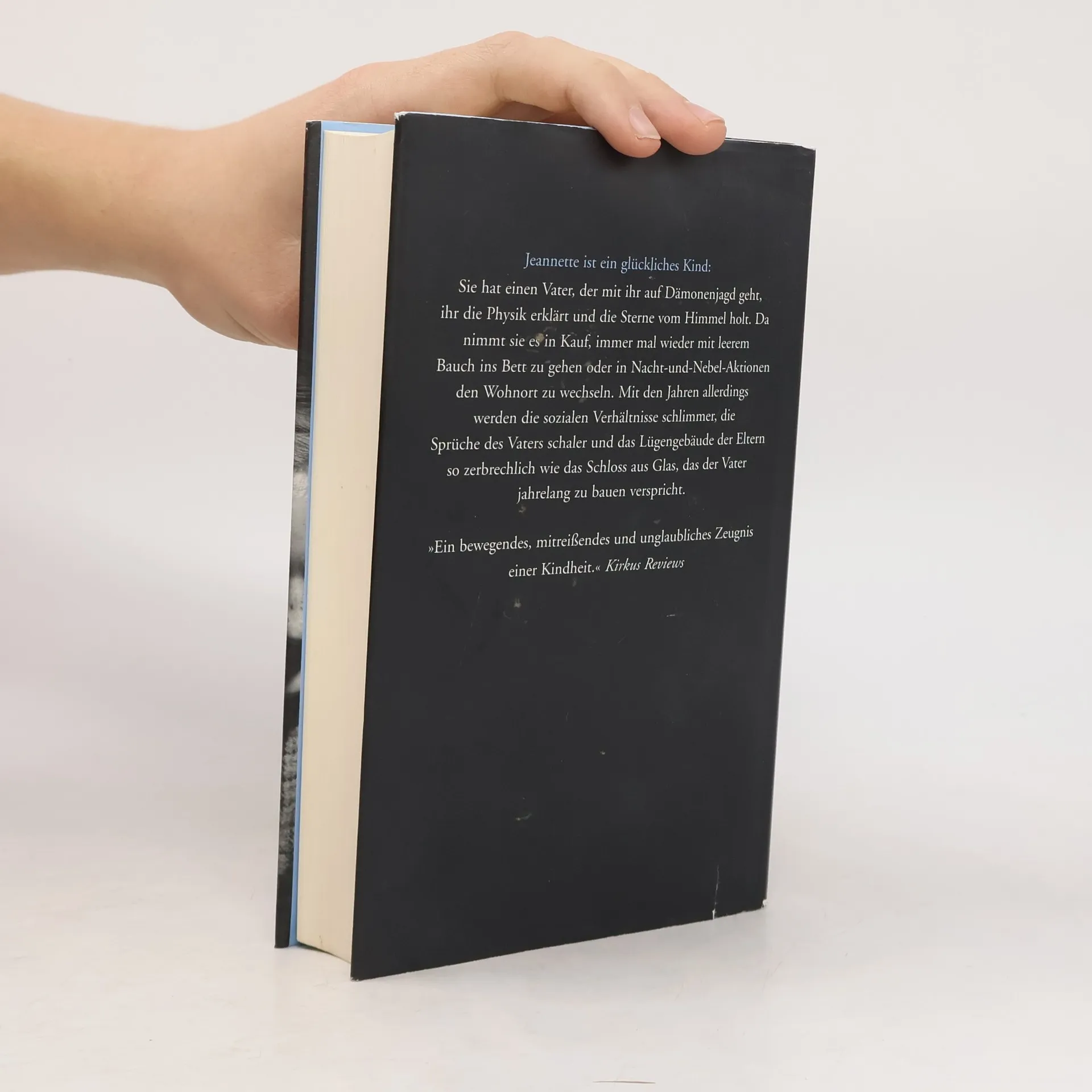 Jeannette Walls ist ein glückliches Kind  Sie hat einen Vater, der mit ihr auf Dämonenjagd geht, ihr die Physik erklärt und die Sterne vom Himmel holt. Da nimmt sie gerne in Kauf, immer mal wieder mit leerem Bauch ins Bett zu gehen, ihre egomanische Künstlermutter zu ertragen oder in Nacht-und-Nebel-Aktionen den Wohnort zu wechseln. Mit den Jahren allerdings werden die sozialen Verhältnisse schlimmer, die Sprüche des Vaters schaler und das Lügengebäude der Eltern so zerbrechlich wie das Schloss aus Glas, das der Vater jahrelang zu bauen versprochen hatte.