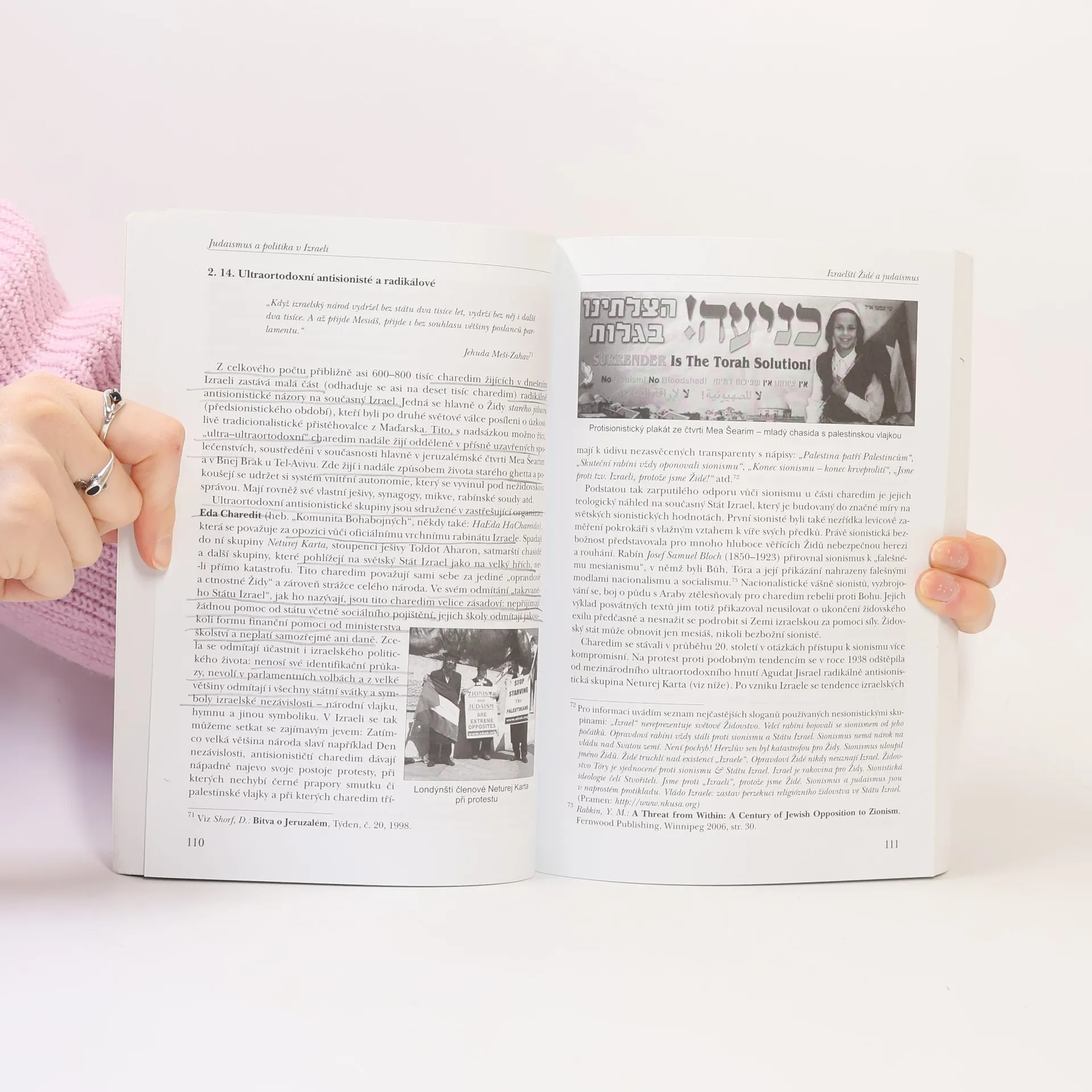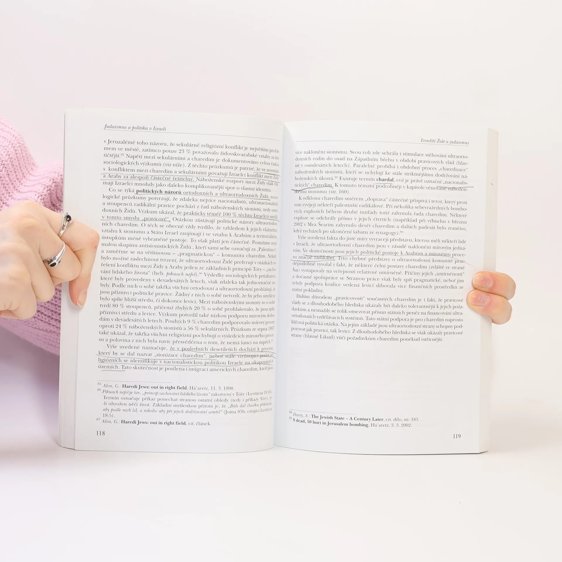 Vnitropolitická situace v Izraeli bývá ve sdělovacích prostředcích často ve stínu napjatých vztahů Vnitropolitická situace v Izraeli bývá ve sdělovacích prostředcích často ve stínu napjatých vztahů mezi izraelskými Židy a Palestinci. Přitom vztahy mezi judaismem a politikou v židovském státě nejsou o nic méně zajímavé a důležité. Vzájemné provázání judaismu s izraelskou politikou je také příčinou mnoha vnitřních konfliktů a v neposlední řadě ovlivňuje i izraelsko-palestinský spor. Tato kniha se českému čtenáři snaží zpřehlednit zajímavou a složitou problematiku. Zároveň se pokouší odpovědět na řadu otázek: Půjde Izrael i nadále cestou demokracie, či se více přiblíží k teokracii? Proč mají náboženské politické strany v Izraeli takový vliv? Jaký vztah mají zbožní Židé k sionismu? Jak souvisí náboženství s výstavbou židovských osad?... Kniha je určena nejen odborníkům, ale každému, kdo se o Izrael zajímá.