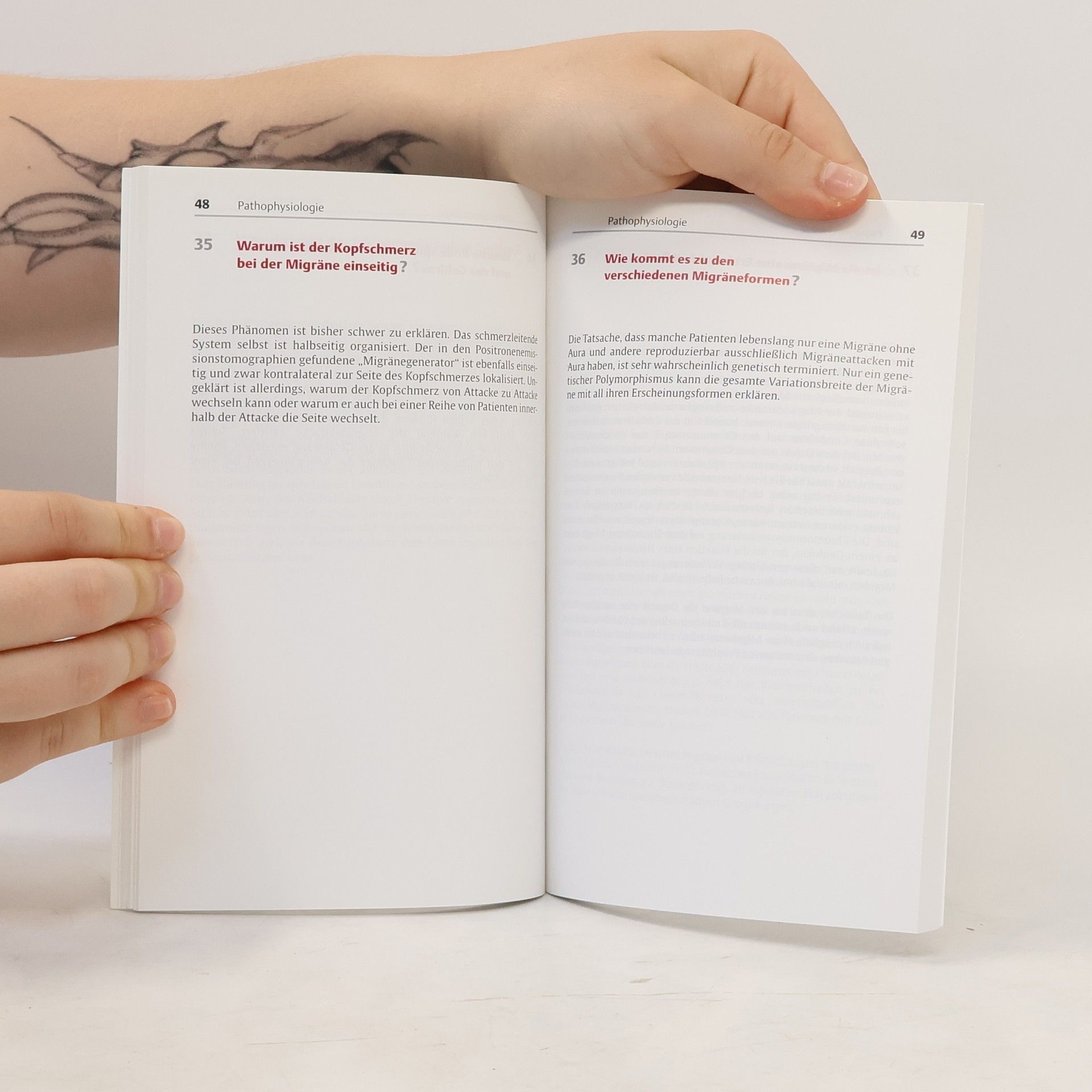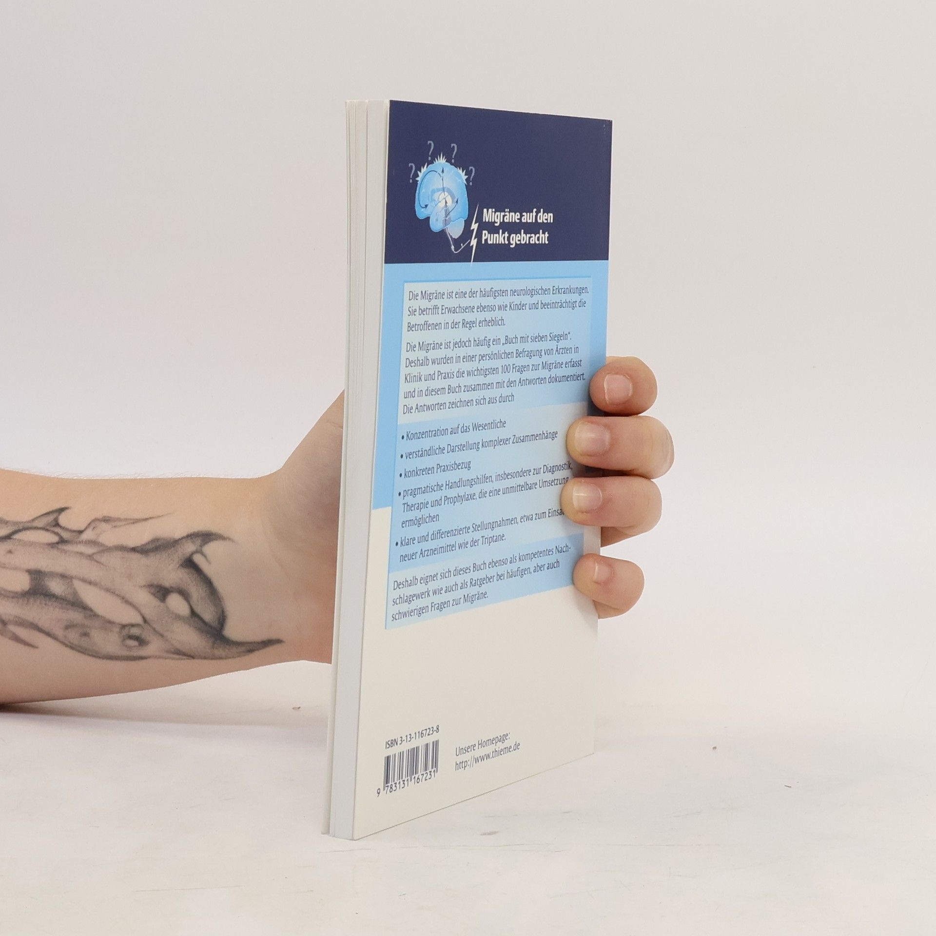 Die Migräne ist eine der häufigsten neurologischen Erkrankungen. Sie betrifft Erwachsene ebenso wie Kinder und beeinträchtigt die Betroffenen in der Regel erheblich. Die Migräne ist jedoch häufig ein „Buch mit sieben Siegeln“. Deshalb wurden in einer persönlichen Befragung von Ärzten in Klinik und Praxis die wichtigsten 100 Fragen zur Migräne erfasst und in diesem Buch zusammen mit den Antworten dokumentiert. Die Antworten zeichnen sich aus durch Konzentration auf das Wesentliche, verständliche Darstellung komplexer Zusammenhänge, konkreten Praxisbezug, pragmatische Handlungshilfen, insbesondere zur Diagnostik, Therapie und Prophylaxe, die eine unmittelbare Umsetzung ermöglichen, klare und differenzierte Stellungnahmen, etwa zum Einsatz neuer Arzneimittel wie der Triptane. Deshalb eignet sich dieses Buch ebenso als kompetentes Nachschlagewerk wie auch als Ratgeber bei häufigen, aber auch schwierigen Fragen zur Migräne.