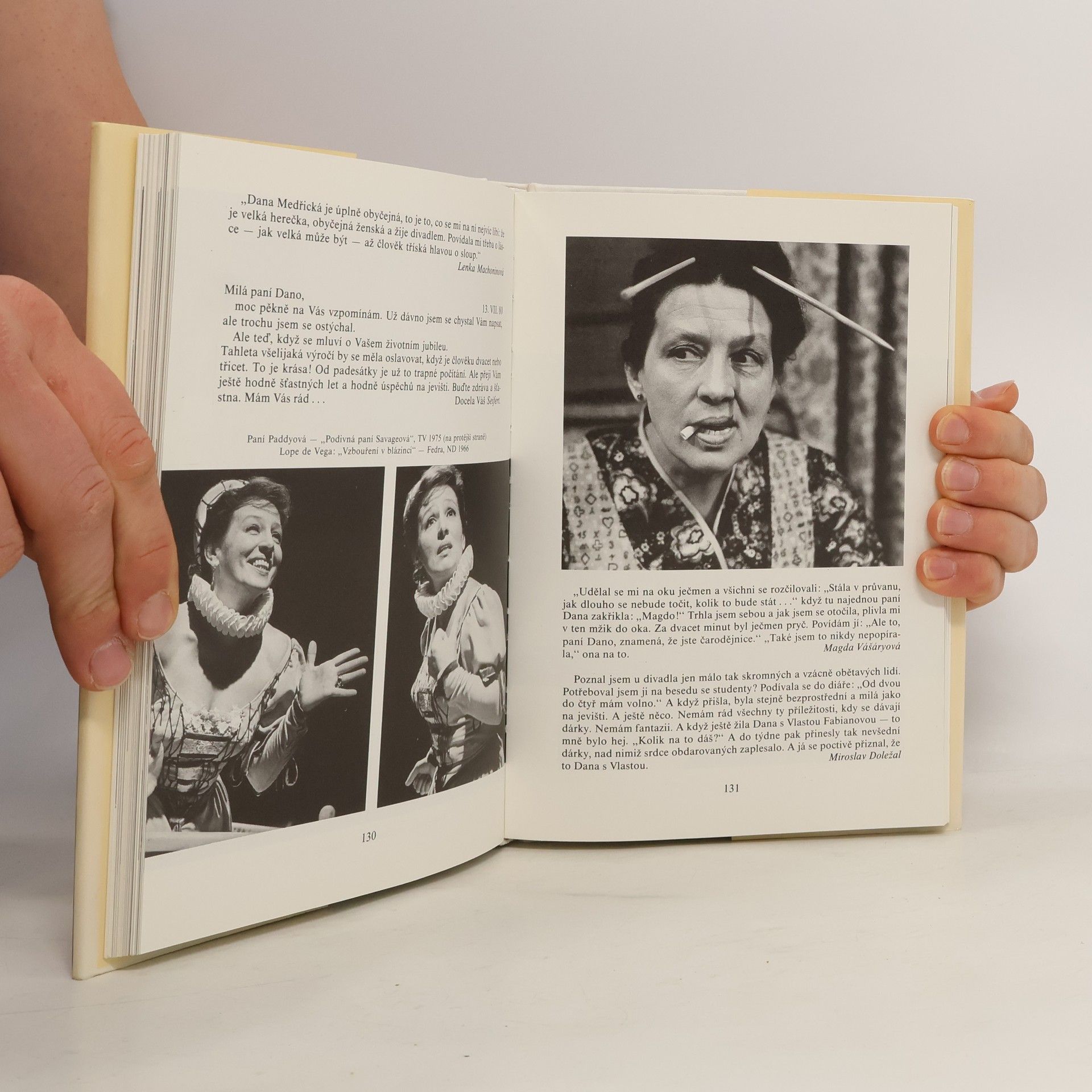 Dana Medřická vytvořila na jevištích, ve filmech, v rozhlasu a televizi na sta dramatických postav. V trvalé paměti obecenstva zůstala především její divadelní a filmová Slávka Hlubinová, Líza z Obchodníka s deštěm, Erži Orbánová z Kočičí hry a titulní postava ze hry Romeo a Julie na konci listopadu. Role, do nichž vložila kus vlastního života a mimořádný prožitek, který divák vycítil. Vznikla vzácná "zpětná vazba", dojem, že herečka oslovuje právě jeho a on má potřebu jí za to poděkovat, svěřit se se svými starostmi, zkrátka reagovat. Svědčí o tom desítky soukromých dopisů, jež Dana Medřická od neznámých lidí dostávala a bylo-li vhodné, i na ně odpovídala. Je zvláštní, že teprve nyní, poprvé, vychází tato kniha - vzpomínka. Otevírá ji vlastní vyprávění umělkyně, přibližující její dětství, dospívání a počáteční angažmá v Brně, Plzni, pak v pražské Uranii. Psala je jako úvodní kapitoly své chystané knihy, již však nestihla dokončit - zůstala torzem. Svazek uzavírá rovněž svědectví osobní - jejího syna Václava Vydry nejml., třetího pokračovatele tradice slavného hereckého rodu. Mezi nimi jsou kapitoly sestavené divadelní kritičkou Bohumilou Spisarovou z rozličných dokumentů, kritik, deníků. Plasticky z nich vystupuje osobnost Dany Medřické, herečky, která skutečně byla "naše".