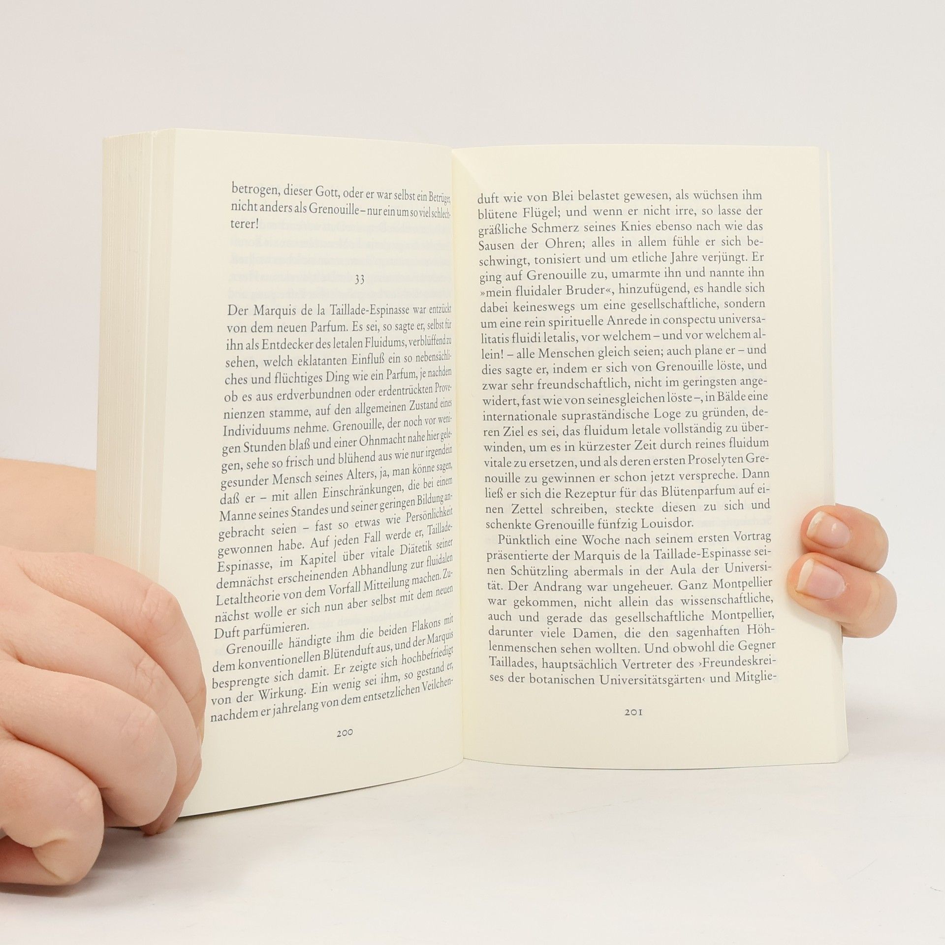 Von Jean-Baptiste Grenouille, dem finsteren Helden, sei nur verraten, daß er 1738 in Paris, in einer stinkigen Fischbude, geboren wird. Die Ammen, denen das Kerlchen an die Brust gelegt wird, halten es nur ein paar Tage mit ihm aus: Er sei zu gierig, außerdem vom Teufel besessen, wofür es untrügliche Indizien gebe: den fehlenden Duft, den unverwechselbaren Geruch, den Säuglinge auszuströmen pflegen.