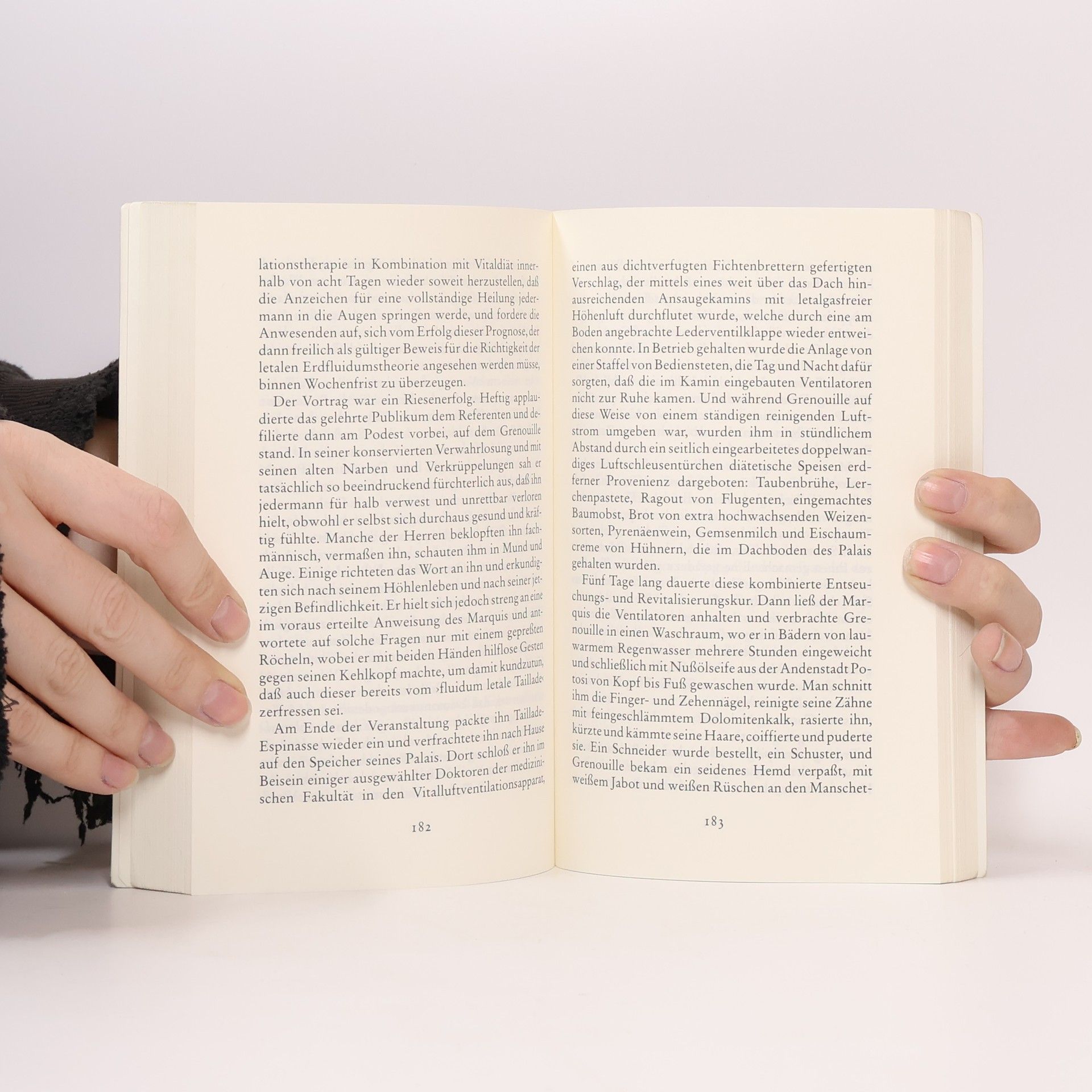 Von Jean-Baptiste Grenouille, dem finsteren Helden, sei nur verraten, daß er 1738 in Paris, in einer stinkigen Fischbude, geboren wird. Die Ammen, denen das Kerlchen an die Brust gelegt wird, halten es nur ein paar Tage mit ihm aus: Er sei zu gierig, außerdem vom Teufel besessen, wofür es untrügliche Indizien gebe: den fehlenden Duft, den unverwechselbaren Geruch, den Säuglinge auszuströmen pflegen.