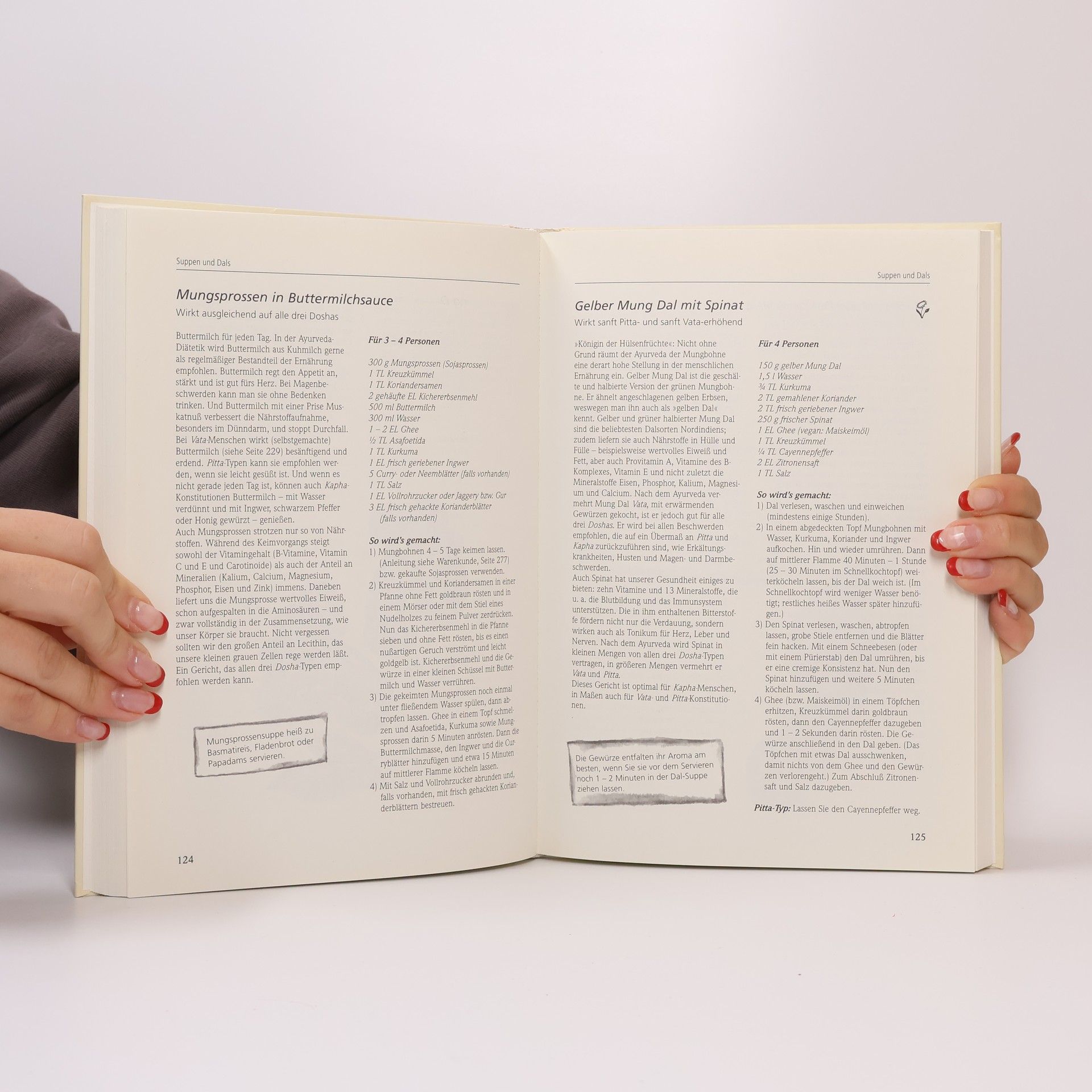 Die Kunst des Kochens nach ayurvedischem Wissen geht über indische Traditionen hinaus, denn diese universellen Prinzipien sind weder auf bestimmte landestypische Heilmittel noch auf eine bestimmte Küche begrenzt. Ob Spargelcremesuppe oder Safranreis, Nudeln oder Nuß-Sandesh, Karottengemüse oder Khichari, ob süß, sauer, pikant oder würzig - die Ayurveda-Küche hat für alle etwas zu bieten. Wer sich ohne tierisches Eiweiß ernähren will oder muß, findet auch eine Menge veganer Rezepte.Lernen Sie die einfachen Prinzipien des Ayurveda kennen. Finden Sie heraus, zu welchem Konstitutionstyp Sie gehören und welche Ernährung Ihnen am besten bekommt. Dann können Sie sich aus den über 150 Rezepten Ihre ganz persönlichen Menüs zusammenstellen.