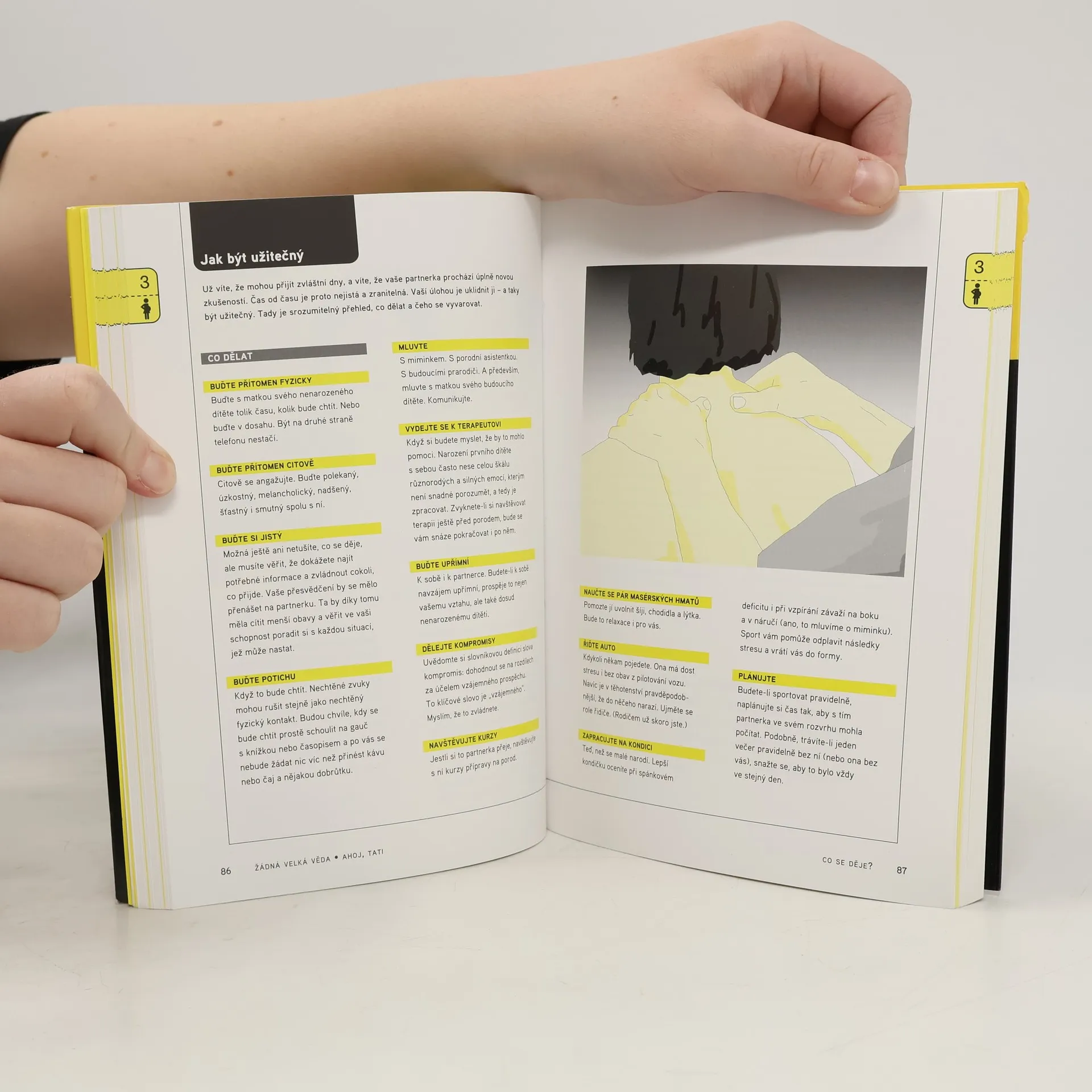 Praktická příručka pro nové tatínky (i ty nevlastní) Praktická příručka je určena aktivním otcům, kteří mají zájem pomáhat své ženě a plně se podílet na péči o své potomky. Knížka provází tatínky od rozhodnutí mít dítě, přes jeho početí, ženino těhotenství a porod až k péči o novorozeně a batole. Knížka přisuzuje otci náročnou a aktivní roli v péči o potomka i v péči o celou rodinu a domácnost. Velmi přehledně shrnuje praktické rady, jak nejlépe postupovat a čeho se naopak vyvarovat. Přehledný výklad doplňuje několik zábavných testů. Tři čtvrtiny knihy jsou věnovány péči o novorozeně a malé dítě. Poslední kapitoly trochu násilně zasvěcují otce do tajů puberty, manželské krize a rozvodu. V závěru doporučená literatura a rejstřík pojmů.
