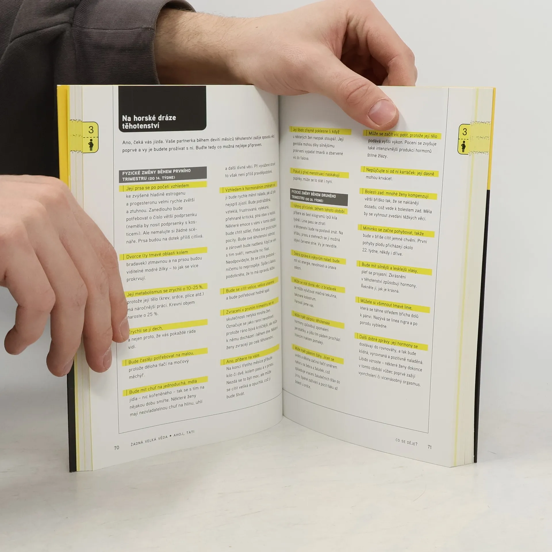 Praktická příručka pro nové tatínky (i ty nevlastní) Praktická příručka je určena aktivním otcům, kteří mají zájem pomáhat své ženě a plně se podílet na péči o své potomky. Knížka provází tatínky od rozhodnutí mít dítě, přes jeho početí, ženino těhotenství a porod až k péči o novorozeně a batole. Knížka přisuzuje otci náročnou a aktivní roli v péči o potomka i v péči o celou rodinu a domácnost. Velmi přehledně shrnuje praktické rady, jak nejlépe postupovat a čeho se naopak vyvarovat. Přehledný výklad doplňuje několik zábavných testů. Tři čtvrtiny knihy jsou věnovány péči o novorozeně a malé dítě. Poslední kapitoly trochu násilně zasvěcují otce do tajů puberty, manželské krize a rozvodu. V závěru doporučená literatura a rejstřík pojmů.