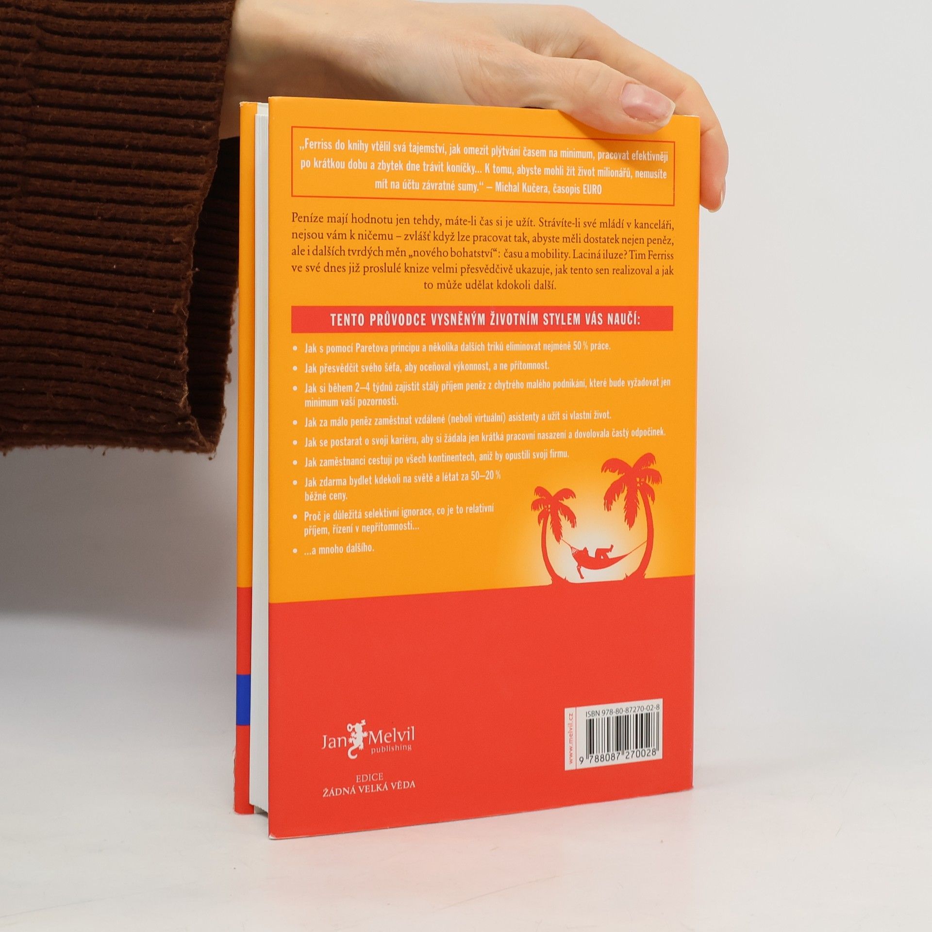 Peníze mají hodnotu jen tehdy, máte-li čas si je užít. Strávíte-li své mládí v kanceláři, nejsou vám k ničemu zvlášť když lze pracovat tak, abyste měli dostatek nejen peněz, ale i dalších tvrdých měn nového bohatství: času a mobility. Laciná iluze? Tim Ferriss ve své dnes již proslulé knize velmi přesvědčivě ukazuje, jak tento sen realizoval a jak to může udělat kdokoli další. Kniha je světovým bestsellerem a vyšla v 35 zemích.