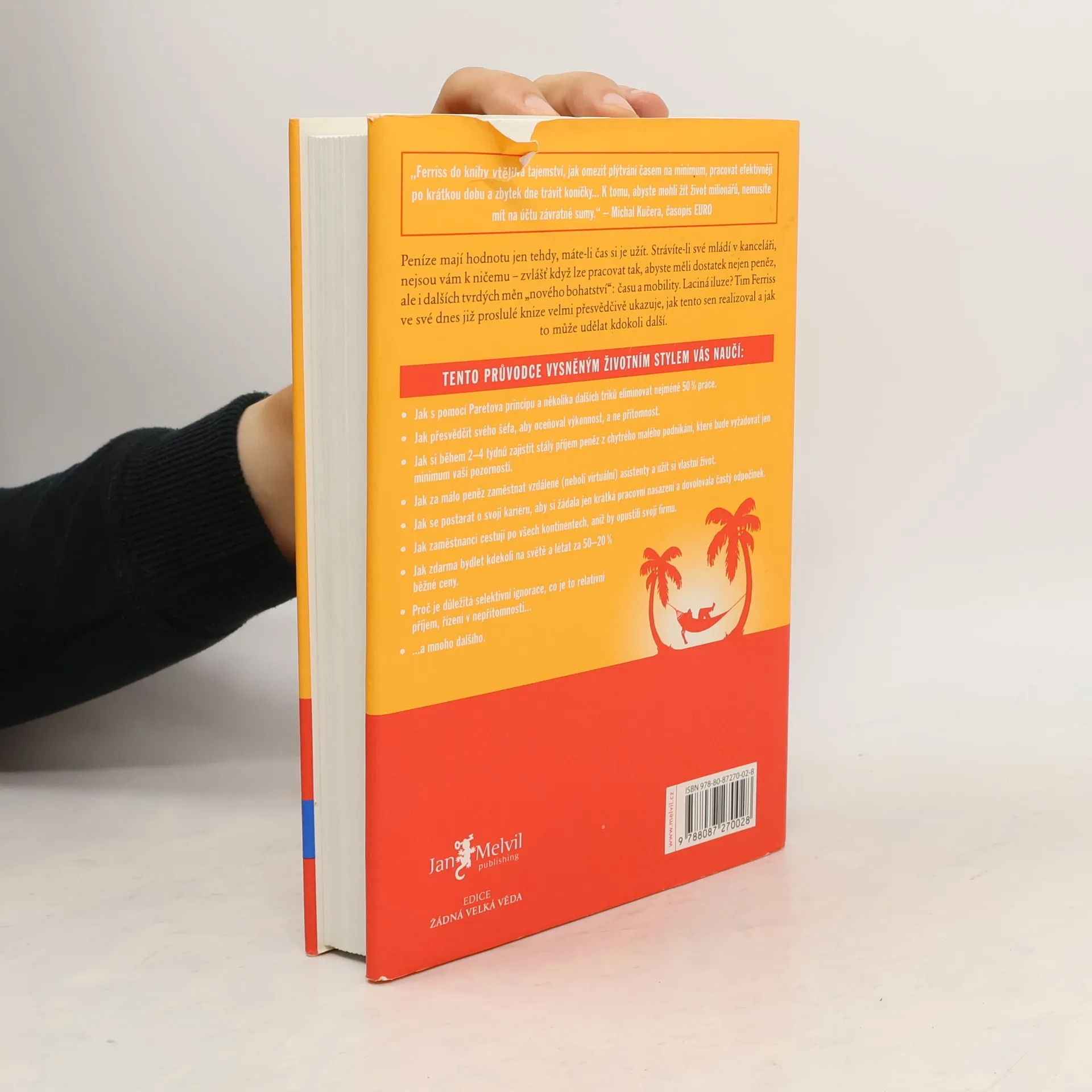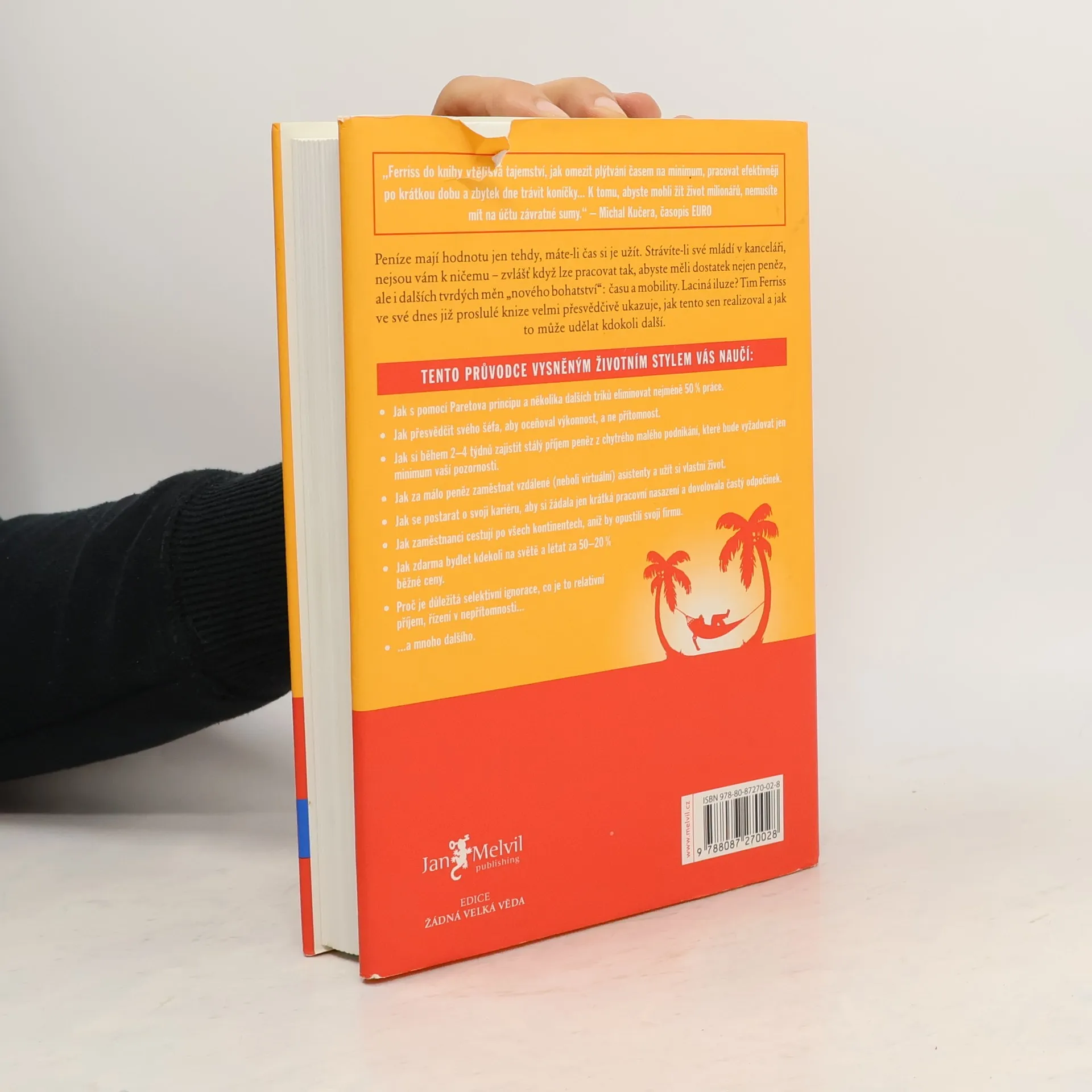 Peníze mají hodnotu jen tehdy, máte-li čas si je užít. Strávíte-li své mládí v kanceláři, nejsou vám k ničemu zvlášť když lze pracovat tak, abyste měli dostatek nejen peněz, ale i dalších tvrdých měn nového bohatství: času a mobility. Laciná iluze? Tim Ferriss ve své dnes již proslulé knize velmi přesvědčivě ukazuje, jak tento sen realizoval a jak to může udělat kdokoli další. Kniha je světovým bestsellerem a vyšla v 35 zemích.