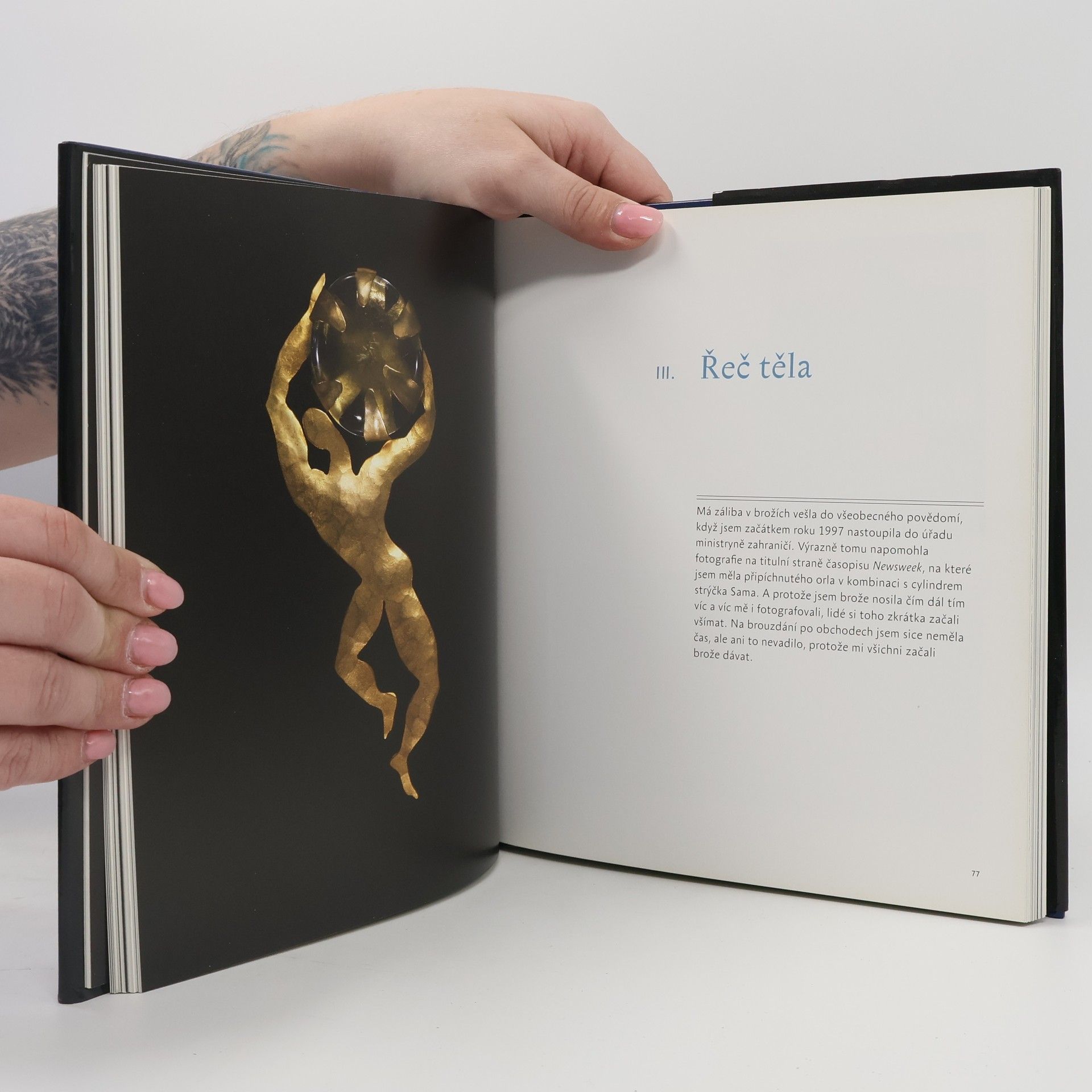 „Pomalu mi docházelo, že aniž bych to vědomě plánovala, staly se šperky součástí mého osobního diplomatického arzenálu. Bývalý prezident George H. W. Bush proslul svým výrokem „Čtěte mi ze rtů!“ (Read my lips). Začala jsem své kolegy i reportéry žádat, aby „četli z mých broží“ (Read my pins).“ Tajná řeč broží je bohatě ilustrovaná memoárová kniha i poutavé pojednání o sociálních dějinách. Umožňuje nám nahlédnout do soukromí Madeleine Albrightové prostřednictvím broží, které nosila. Její sbírka má nadnárodní i demokratický charakter – laciné brože za pár korun tu mají své čestné místo vedle značkových šperků i rodinného stříbra. Najdeme tu jak starožitného orla, jehož si bývalá ministryně zahraničí pořídila v době svého jmenování, tak zebry, které si vzala na setkání s Nelsonem Mandelou, či valentinské srdce vyrobené její tehdy pětiletou dcerou. Knihu Tajná řeč broží oživuje více než dvě stě fotografií a mnoho zajímavých a často humorných příběhů o špercích, světové politice a životě jedné z nejuznávanějších a nejvýraznějších amerických diplomatek.