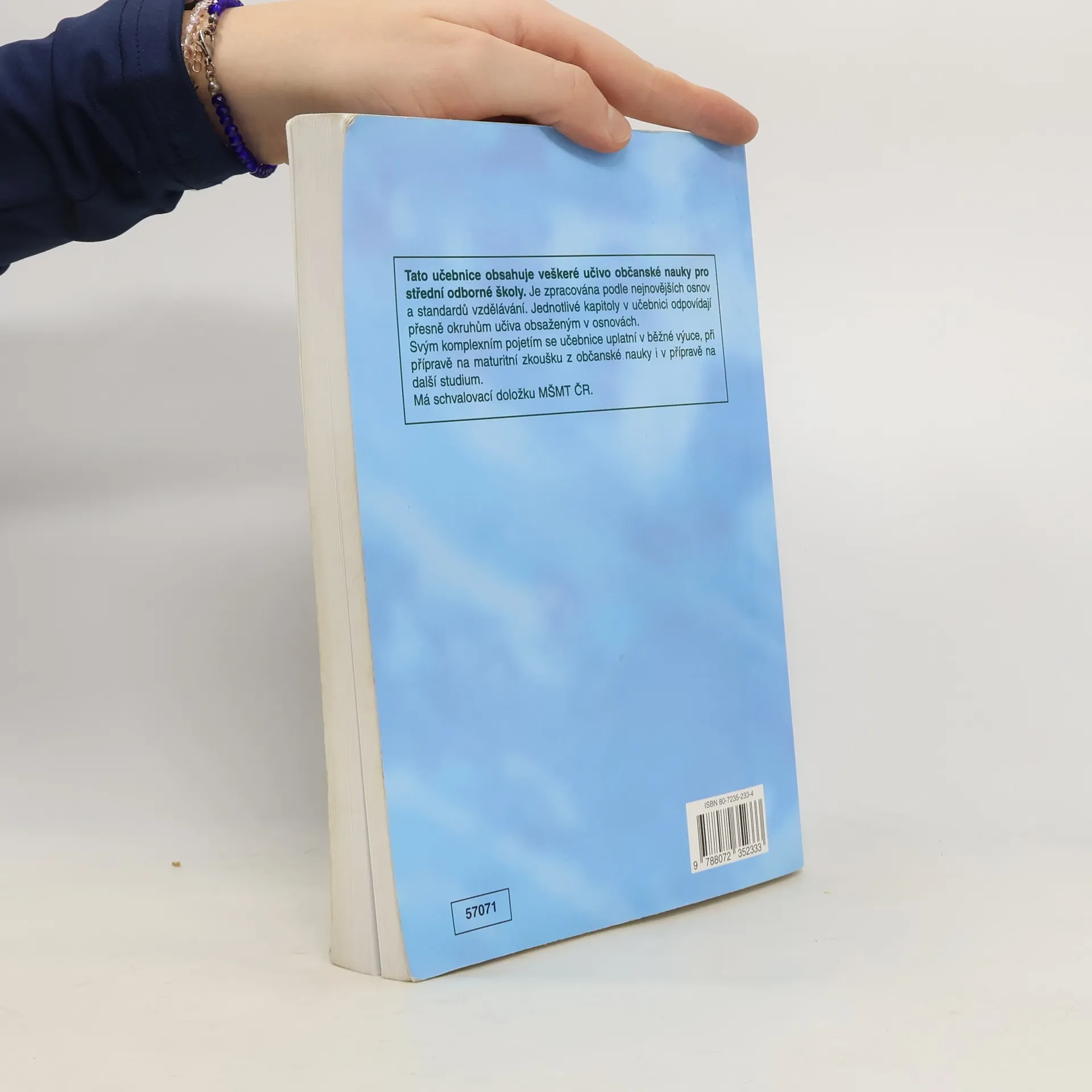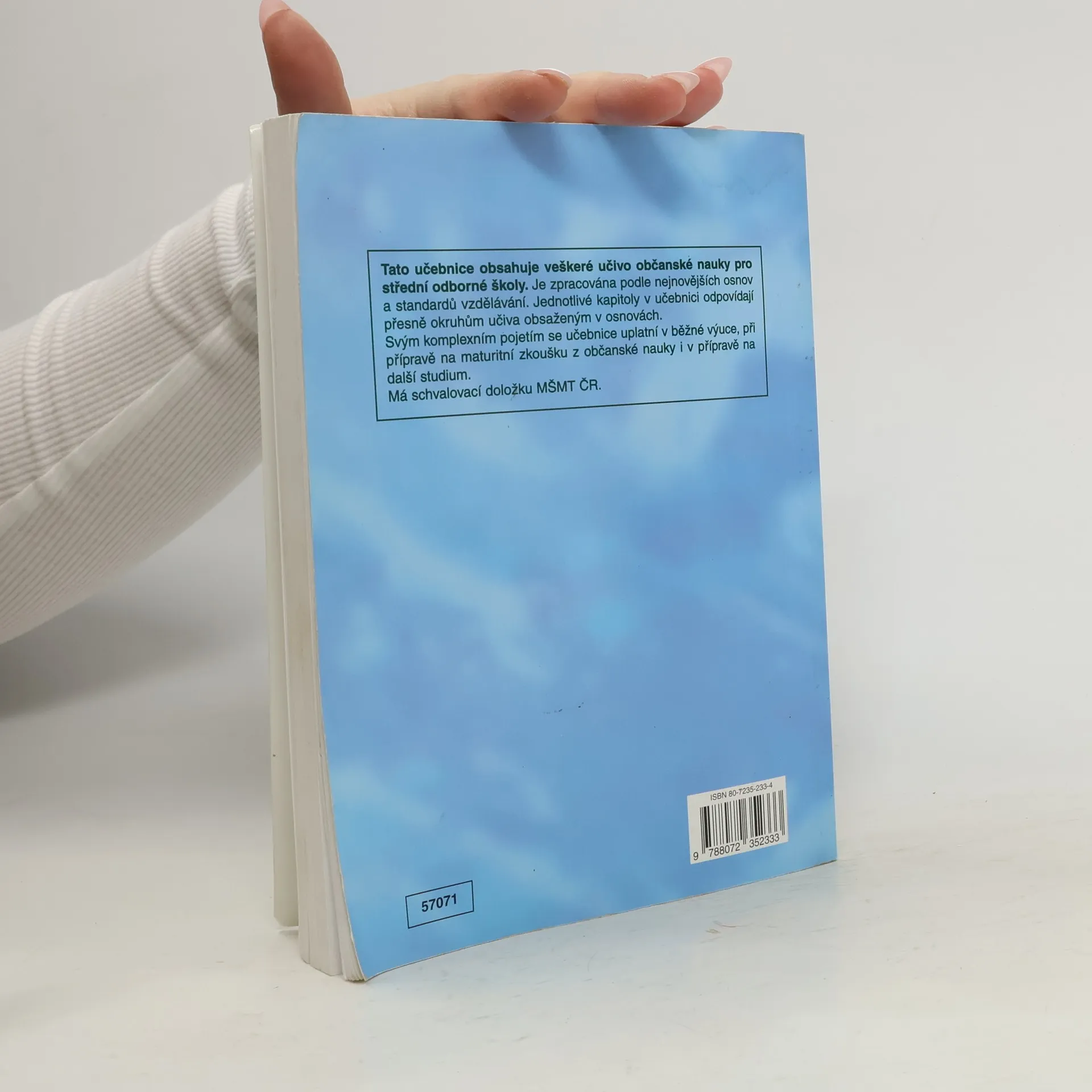 Obsahuje v jednom díle veškeré učivo předepsané nejnovějšími osnovami pro občanskou nauku SOŠ. Jednotlivé kapitoly přesně korespondují s konkrétními oddíly osnov. To umožňuje, aby jejich pořadí ve školním roce určoval učitel podle podmínek ve třídě. Obsah učiva je zpracován tradičním způsobem.